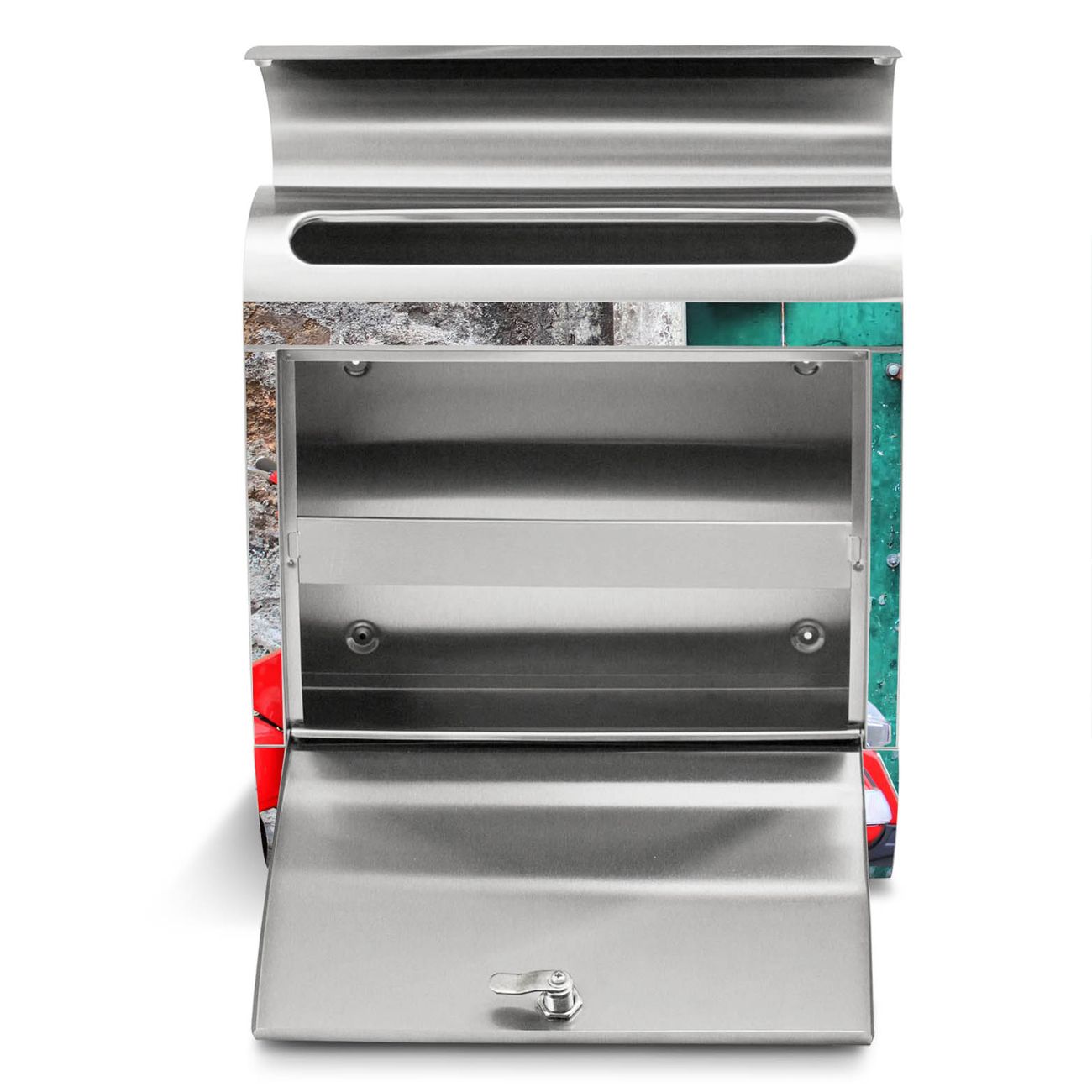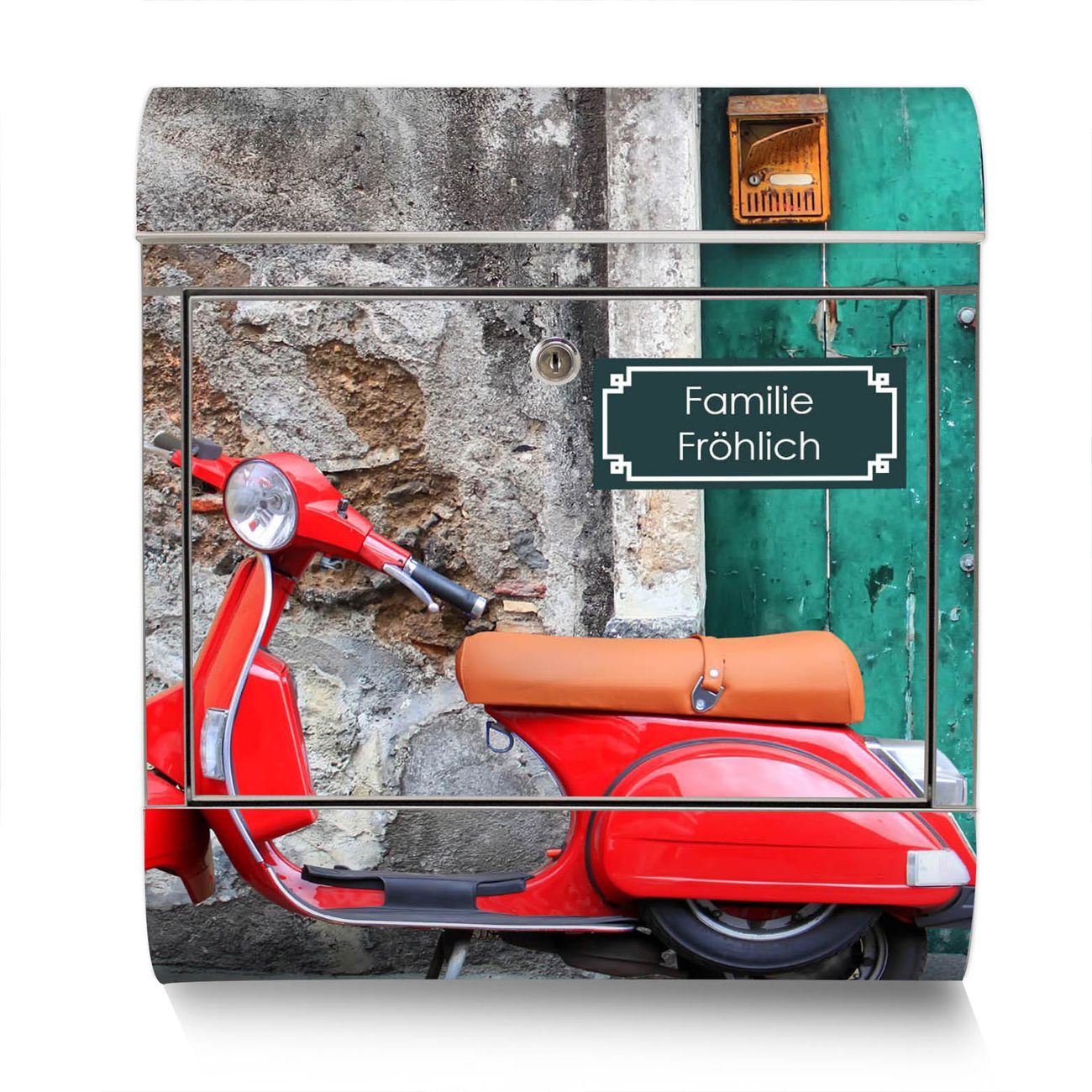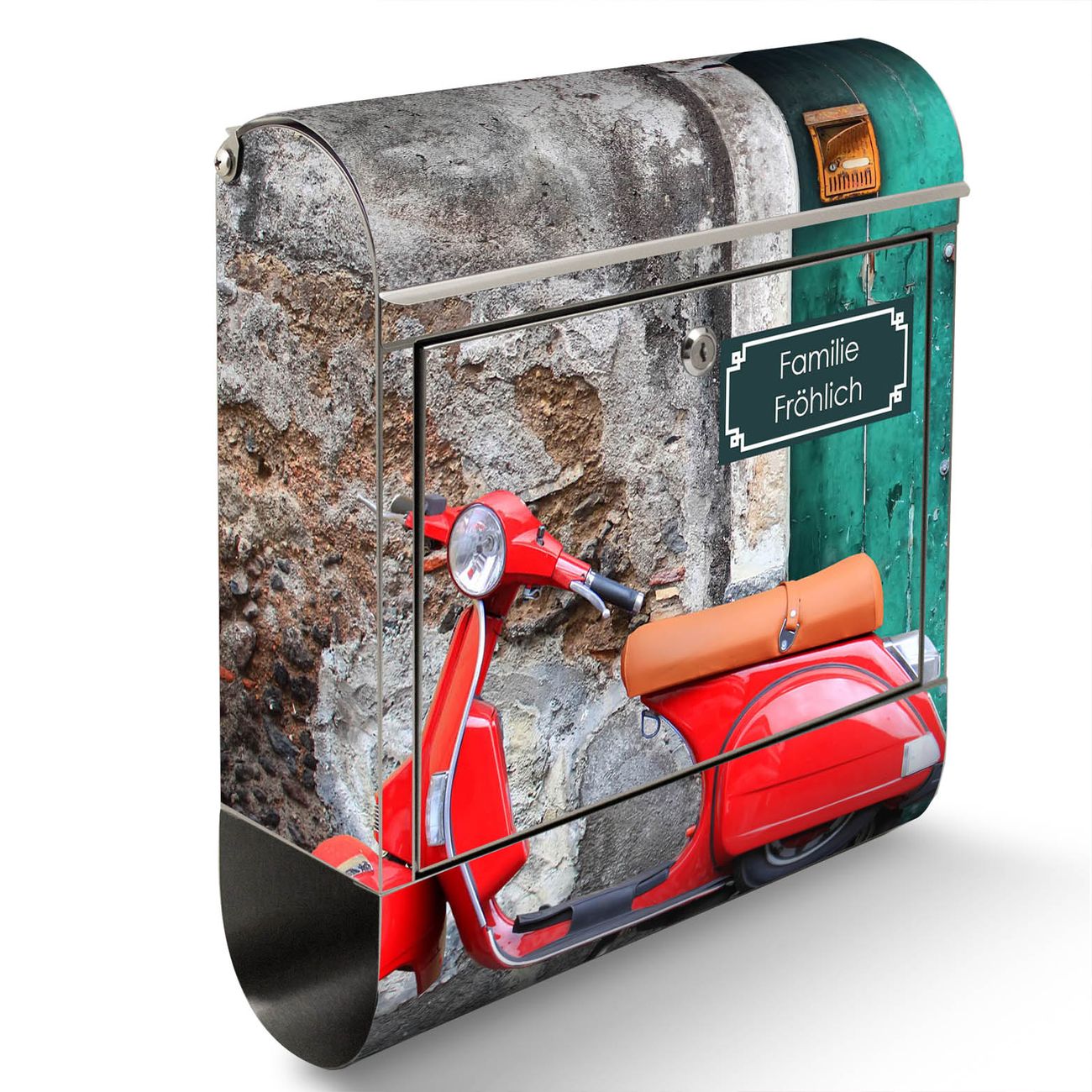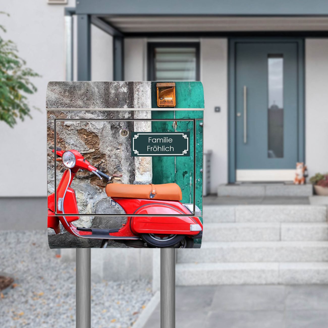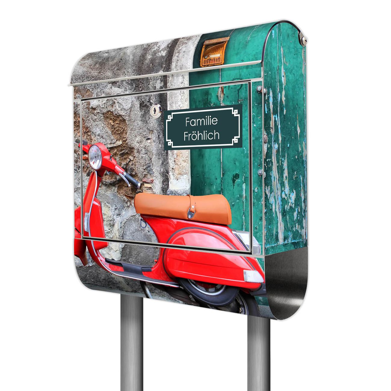 Der Motivstandbriefkasten hat ein sehr ansprechendes und ausgefallenes Design, damit entlocken Sie Ihren Nachbarn und dem Postboten ein Lächeln. Heben Sie Sich ab von der tristen grauen Masse, ohne auf Funktionalität zu verzichten. Der Briefkasten besteht aus hochwertigem 18/0 Edelstahl und die Wetter- und UV-resistenten Folie mit Italienischer Roller Motiv ist zusätzlich mit einem Schutzlaminat überzogen. Der Standbriefkasten wird mit Montagematerial und zwei Schlüsseln geliefert.