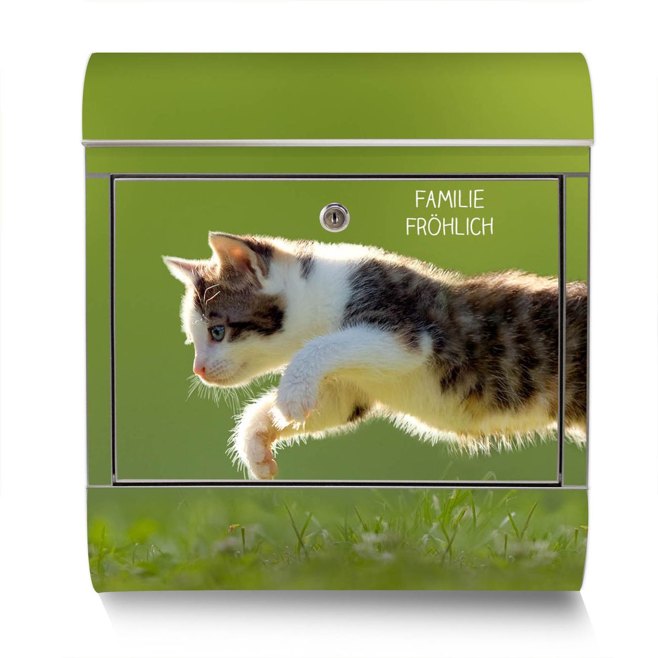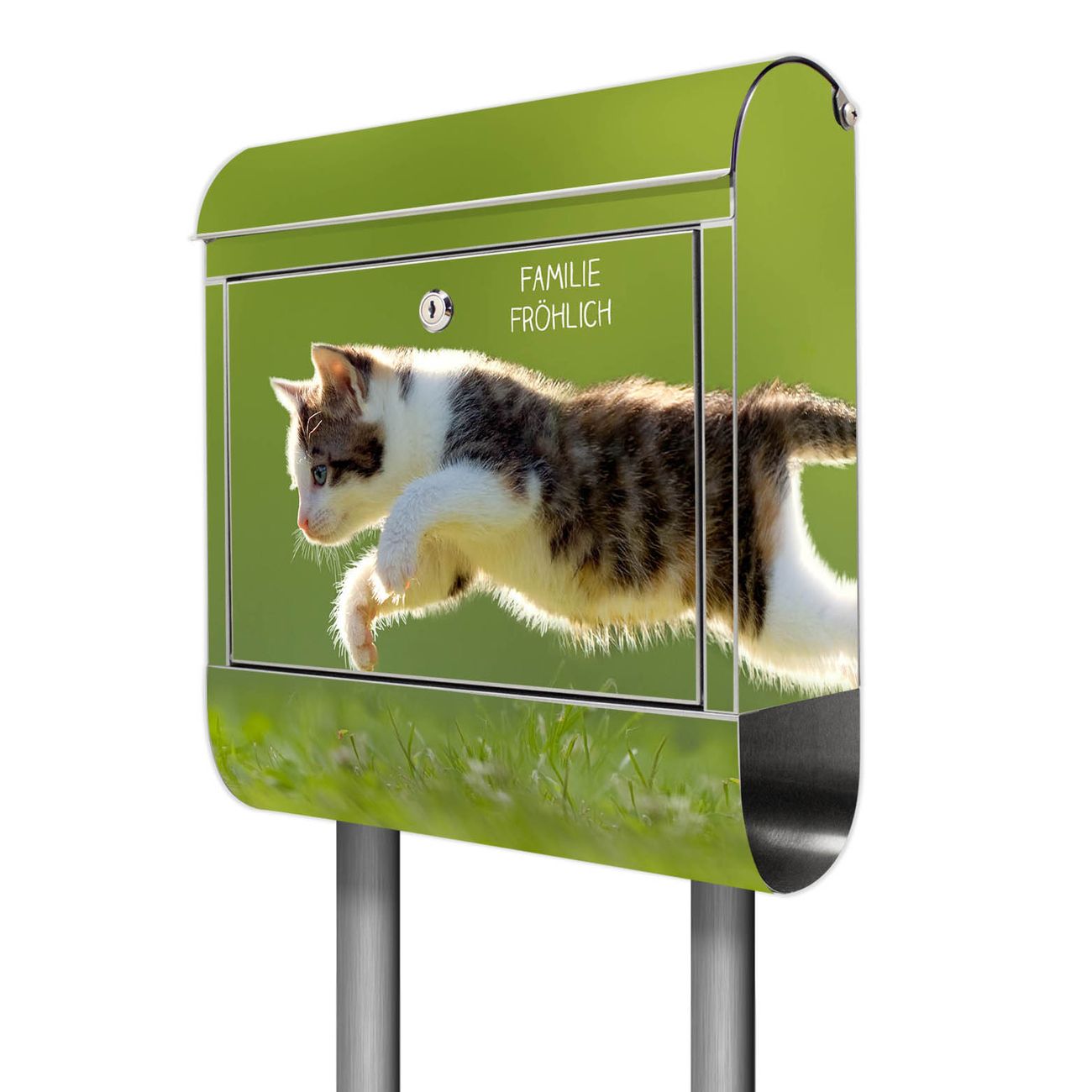 Der Motivstandbriefkasten hat ein sehr ansprechendes und ausgefallenes Design, damit entlocken Sie Ihren Nachbarn und dem Postboten ein Lächeln. Heben Sie Sich ab von der tristen grauen Masse, ohne auf Funktionalität zu verzichten. Der Briefkasten besteht aus hochwertigem 18/0 Edelstahl und die Wetter- und UV-resistenten Folie mit Jagende Katze Motiv ist zusätzlich mit einem Schutzlaminat überzogen. Der Standbriefkasten wird mit Montagematerial und zwei Schlüsseln geliefert.