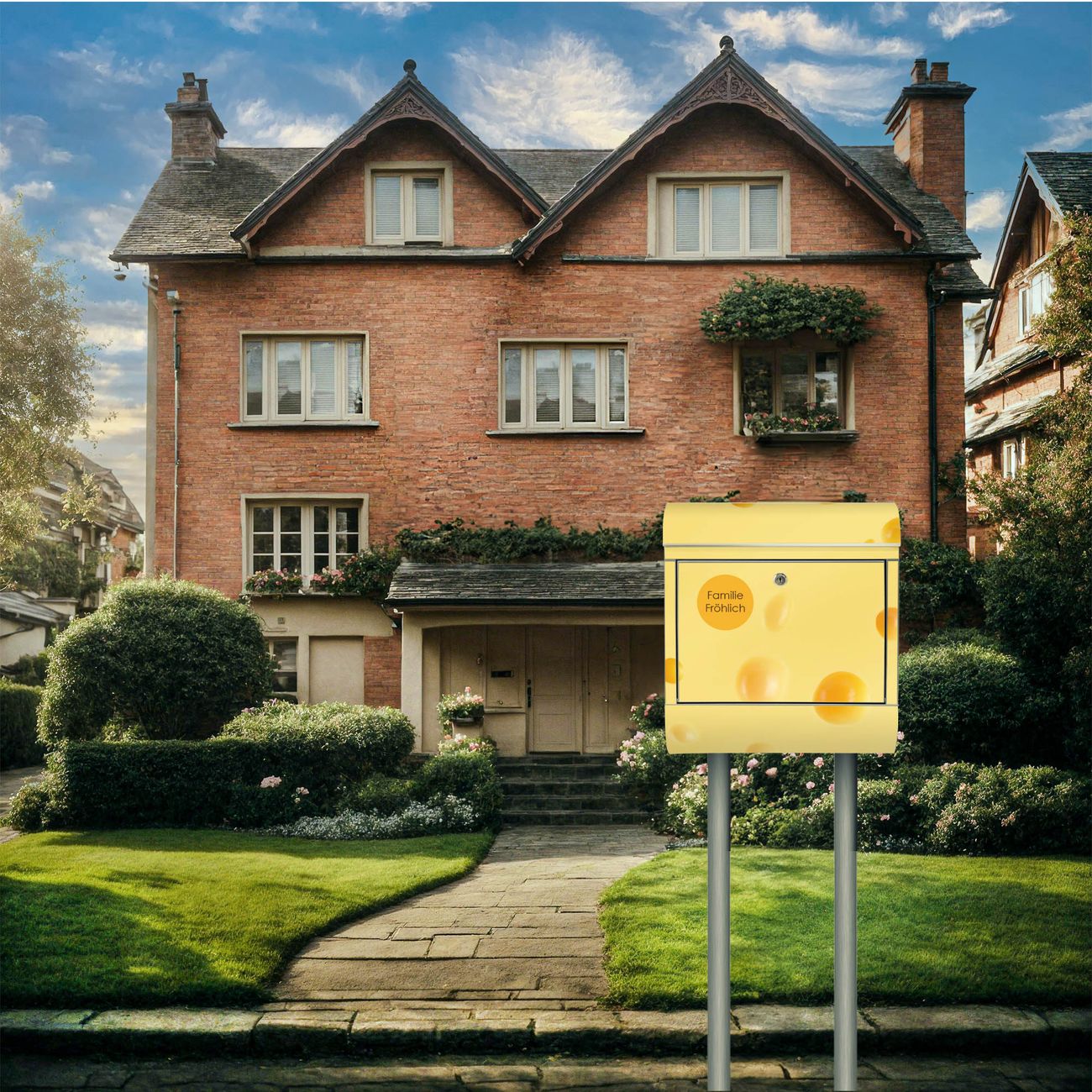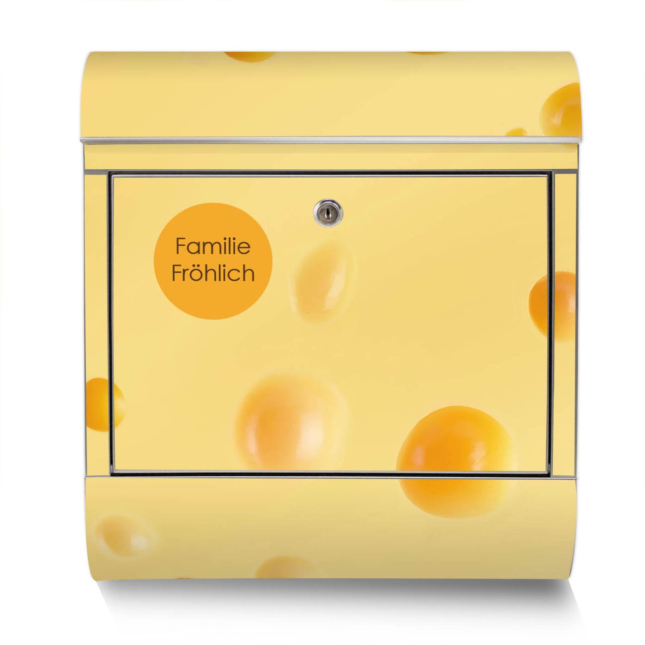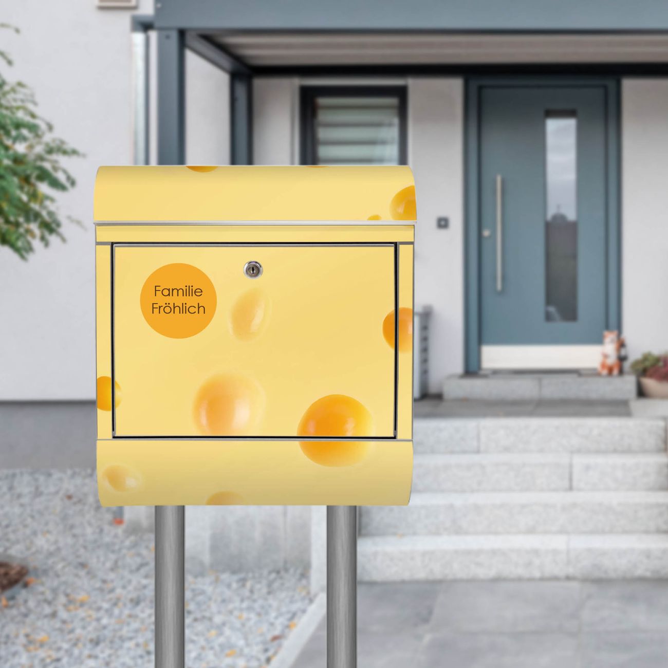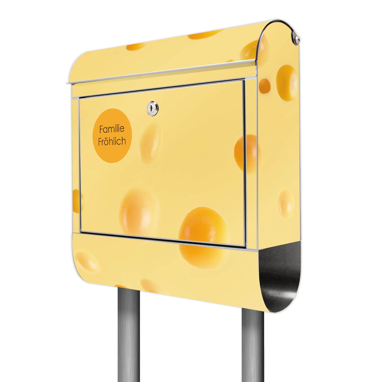 Der Motivstandbriefkasten hat ein sehr ansprechendes und ausgefallenes Design, damit entlocken Sie Ihren Nachbarn und dem Postboten ein Lächeln. Heben Sie Sich ab von der tristen grauen Masse, ohne auf Funktionalität zu verzichten. Der Briefkasten besteht aus hochwertigem 18/0 Edelstahl und die Wetter- und UV-resistenten Folie mit Käse Motiv ist zusätzlich mit einem Schutzlaminat überzogen. Der Standbriefkasten wird mit Montagematerial und zwei Schlüsseln geliefert.
