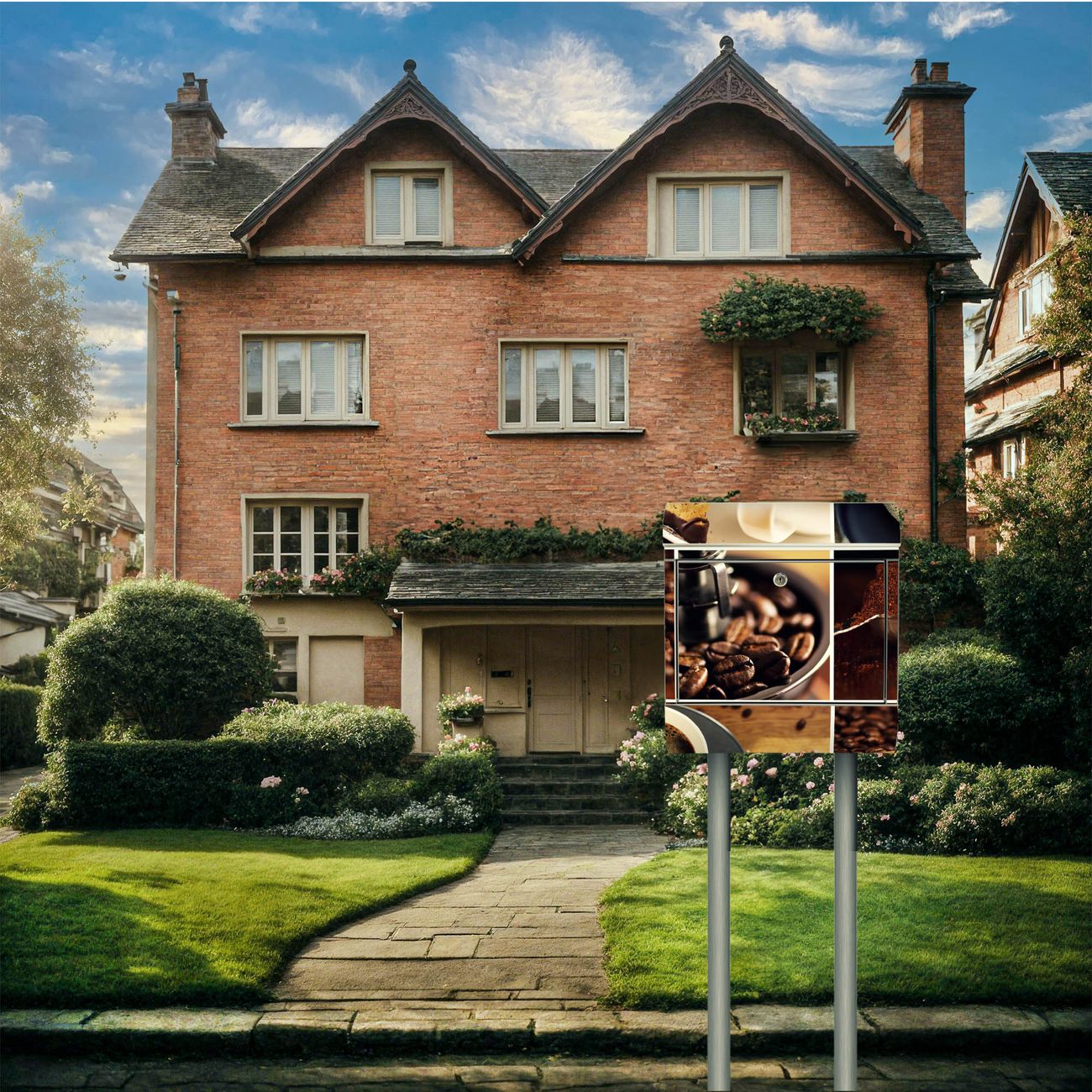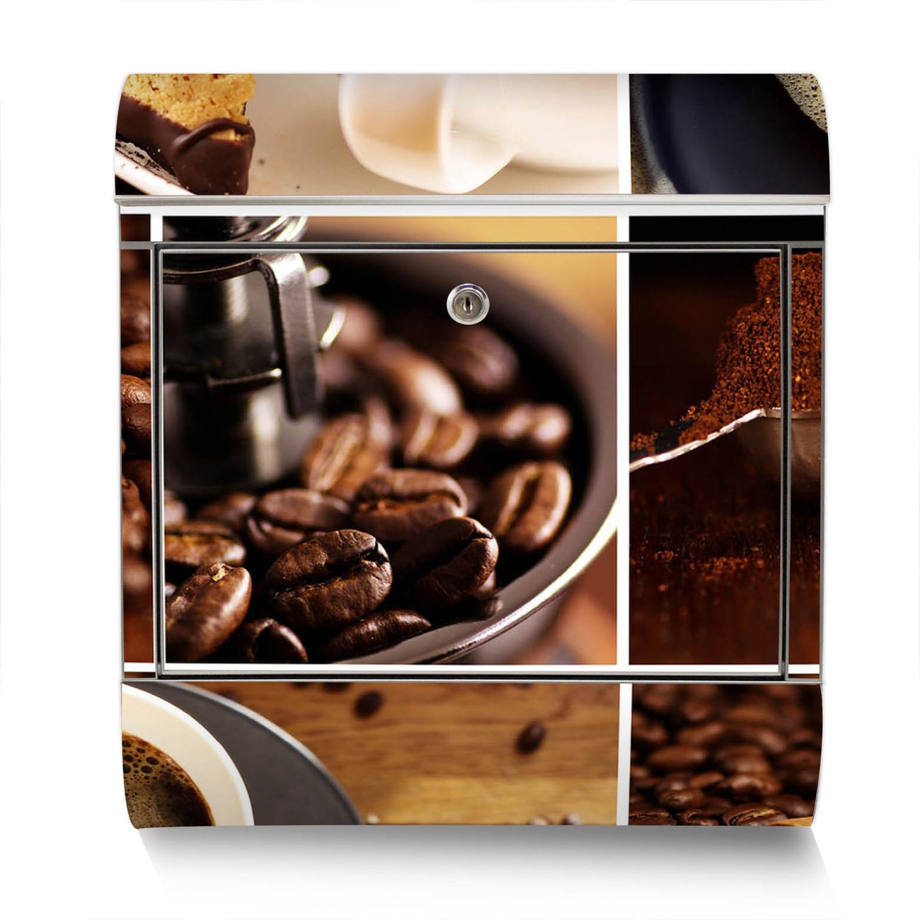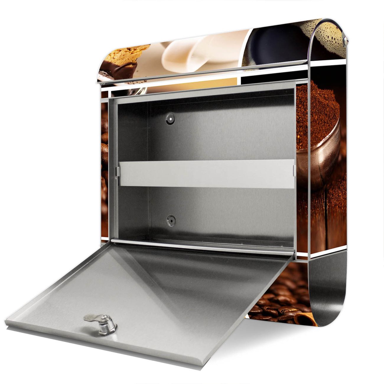 Der Motivstandbriefkasten hat ein sehr ansprechendes und ausgefallenes Design, damit entlocken Sie Ihren Nachbarn und dem Postboten ein Lächeln. Heben Sie Sich ab von der tristen grauen Masse, ohne auf Funktionalität zu verzichten. Der Briefkasten besteht aus hochwertigem 18/0 Edelstahl und die Wetter- und UV-resistenten Folie mit Kaffee&Schokolade Motiv ist zusätzlich mit einem Schutzlaminat überzogen. Der Standbriefkasten wird mit Montagematerial und zwei Schlüsseln geliefert.