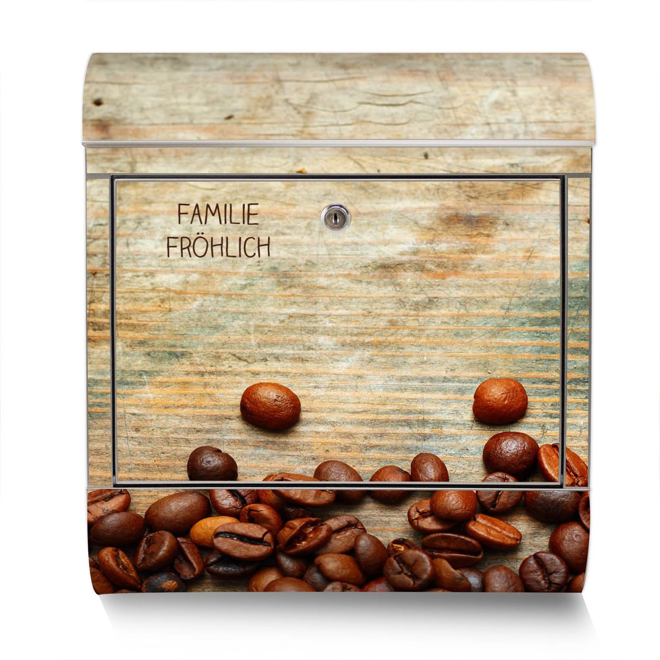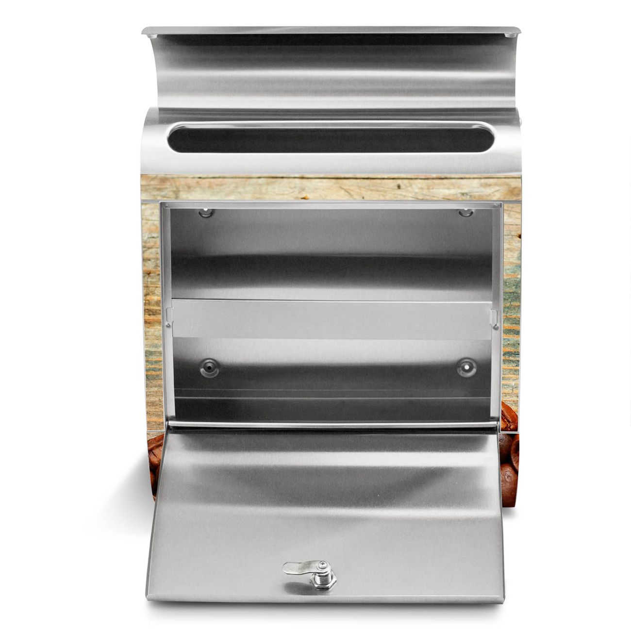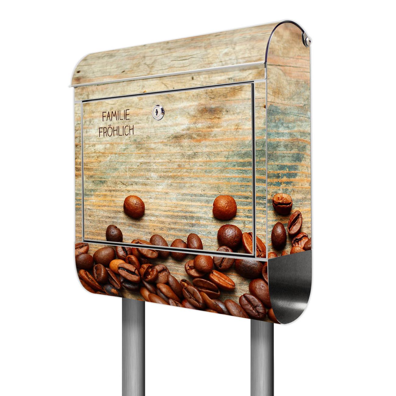 Der banjado Edelstahl Standbriefkasten mit Motiv Kaffeebohnen und eigenem Wunschtext bietet Ihnen mit seinem Fassungsvermögen genügend Platz auch für große A4 Sendungen. Das integrierte Zeitungsfach eignet sich hervorragend, um unkompliziert die Tageszeitung zu fassen.