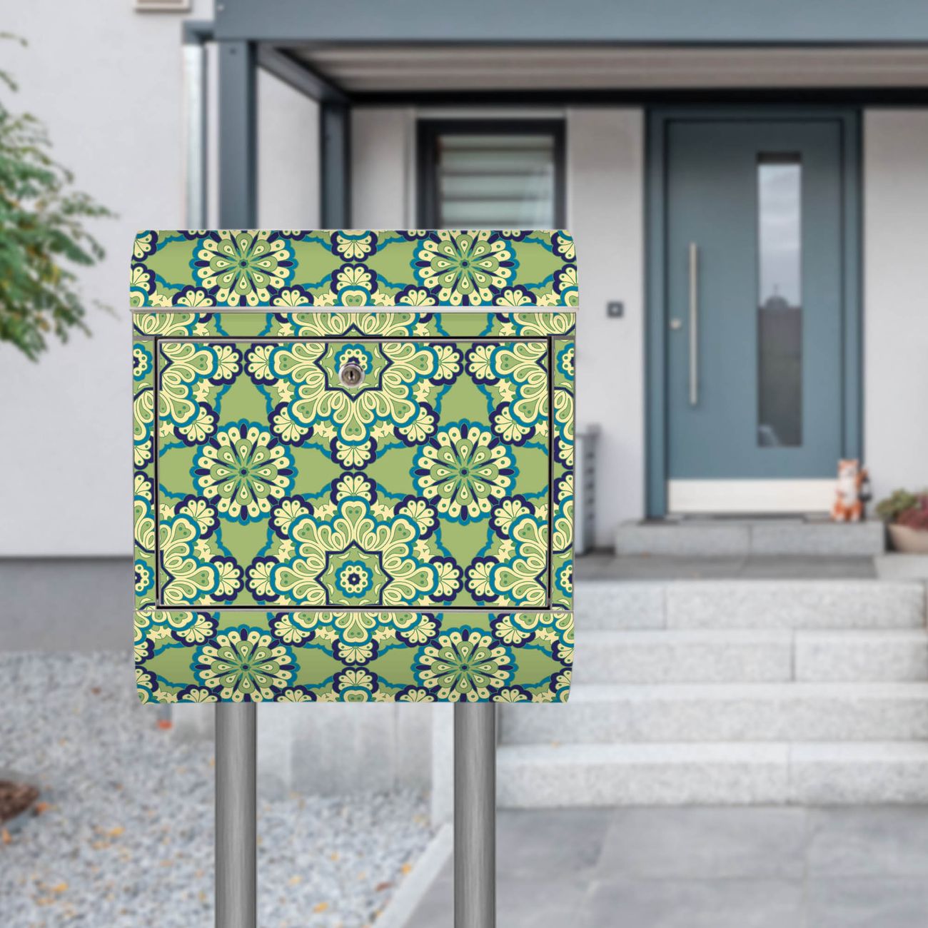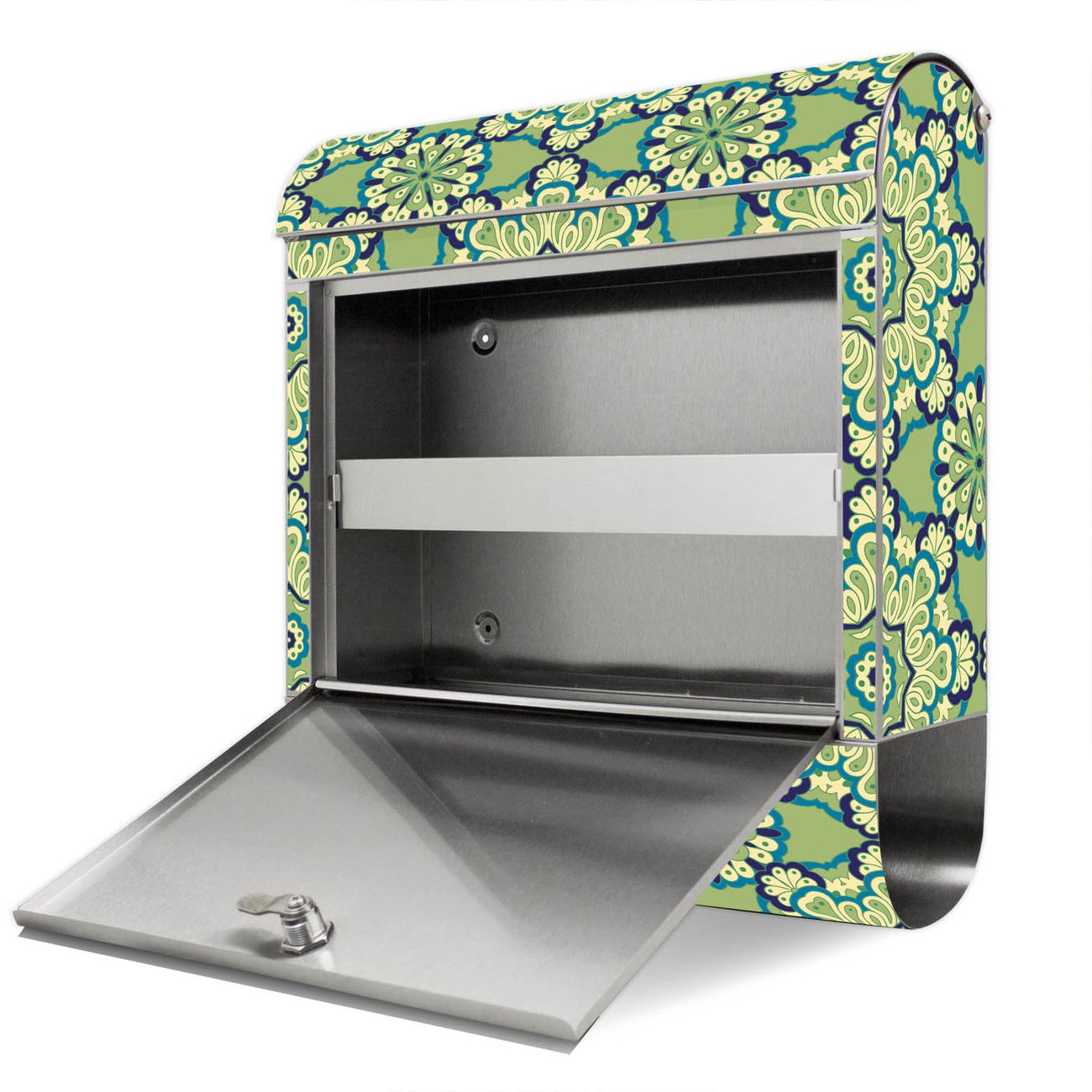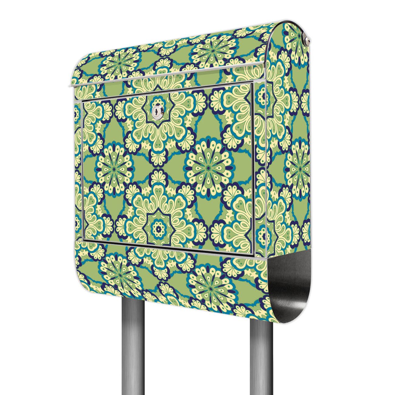 Der Motivstandbriefkasten hat ein sehr ansprechendes und ausgefallenes Design, damit entlocken Sie Ihren Nachbarn und dem Postboten ein Lächeln. Heben Sie Sich ab von der tristen grauen Masse, ohne auf Funktionalität zu verzichten. Der Briefkasten besteht aus hochwertigem 18/0 Edelstahl und die Wetter- und UV-resistenten Folie mit Kaleidoscop Grün Motiv ist zusätzlich mit einem Schutzlaminat überzogen. Der Standbriefkasten wird mit Montagematerial und zwei Schlüsseln geliefert.