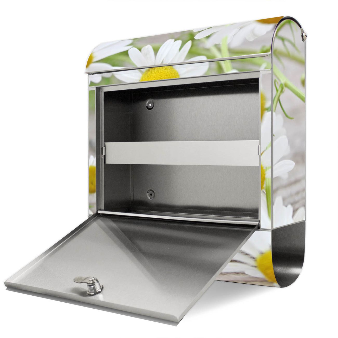 Der Motivstandbriefkasten hat ein sehr ansprechendes und ausgefallenes Design, damit entlocken Sie Ihren Nachbarn und dem Postboten ein Lächeln. Heben Sie Sich ab von der tristen grauen Masse, ohne auf Funktionalität zu verzichten. Der Briefkasten besteht aus hochwertigem 18/0 Edelstahl und die Wetter- und UV-resistenten Folie mit Kamillenblüten Motiv ist zusätzlich mit einem Schutzlaminat überzogen. Der Standbriefkasten wird mit Montagematerial und zwei Schlüsseln geliefert.