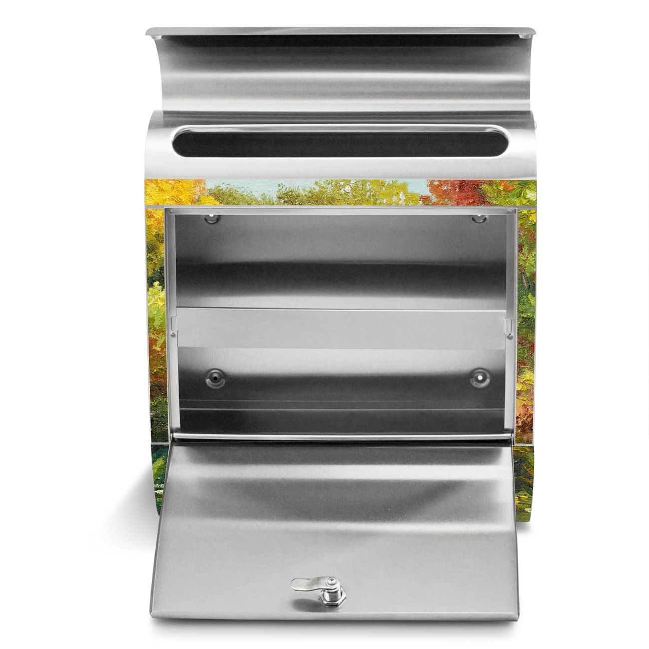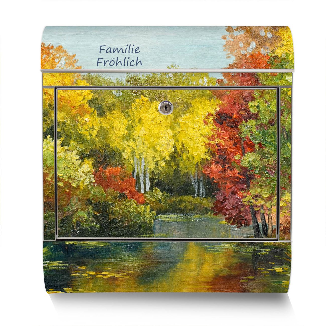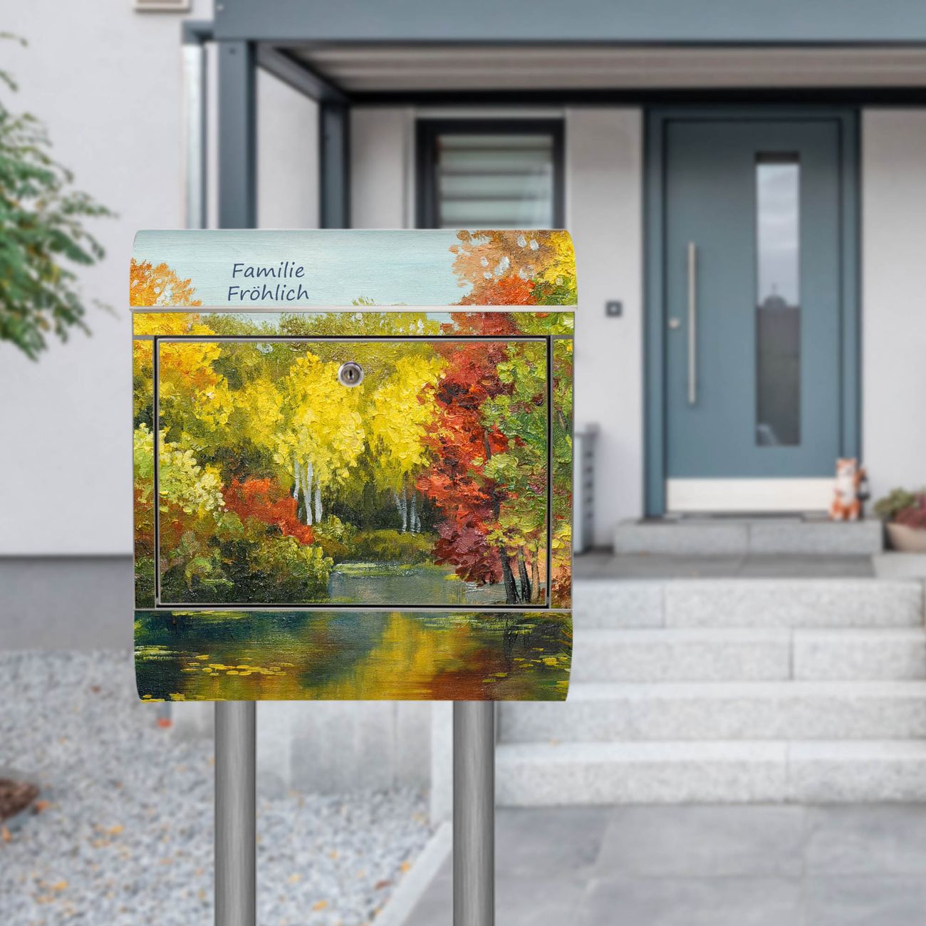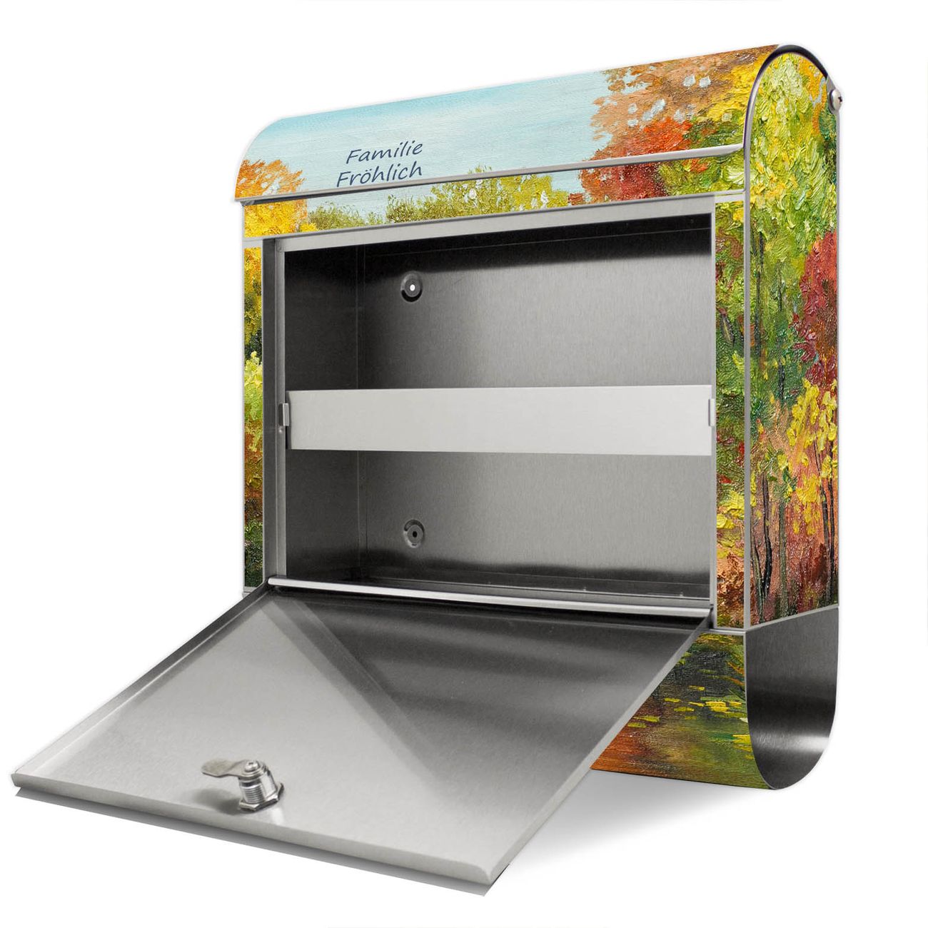 Der Motivstandbriefkasten hat ein sehr ansprechendes und ausgefallenes Design, damit entlocken Sie Ihren Nachbarn und dem Postboten ein Lächeln. Heben Sie Sich ab von der tristen grauen Masse, ohne auf Funktionalität zu verzichten. Der Briefkasten besteht aus hochwertigem 18/0 Edelstahl und die Wetter- und UV-resistenten Folie mit Kanal Im Herbst Motiv ist zusätzlich mit einem Schutzlaminat überzogen. Der Standbriefkasten wird mit Montagematerial und zwei Schlüsseln geliefert.