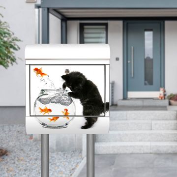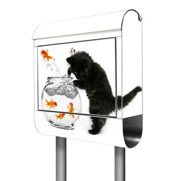 Der Motivstandbriefkasten hat ein sehr ansprechendes und ausgefallenes Design, damit entlocken Sie Ihren Nachbarn und dem Postboten ein Lächeln. Heben Sie Sich ab von der tristen grauen Masse, ohne auf Funktionalität zu verzichten. Der Briefkasten besteht aus hochwertigem 18/0 Edelstahl und die Wetter- und UV-resistenten Folie mit Katze Und Fisch Motiv ist zusätzlich mit einem Schutzlaminat überzogen. Der Standbriefkasten wird mit Montagematerial und zwei Schlüsseln geliefert.