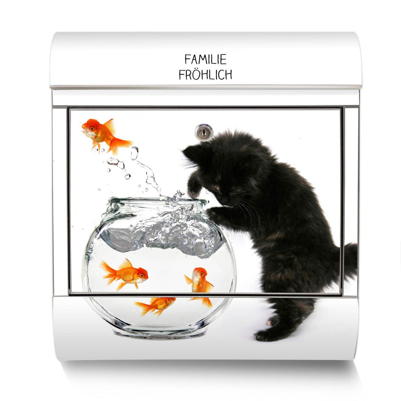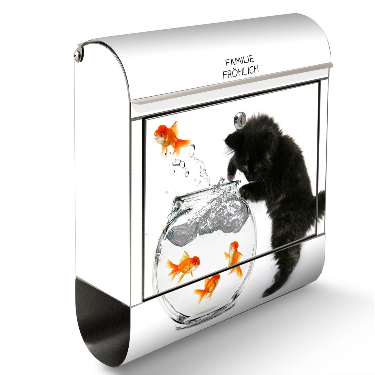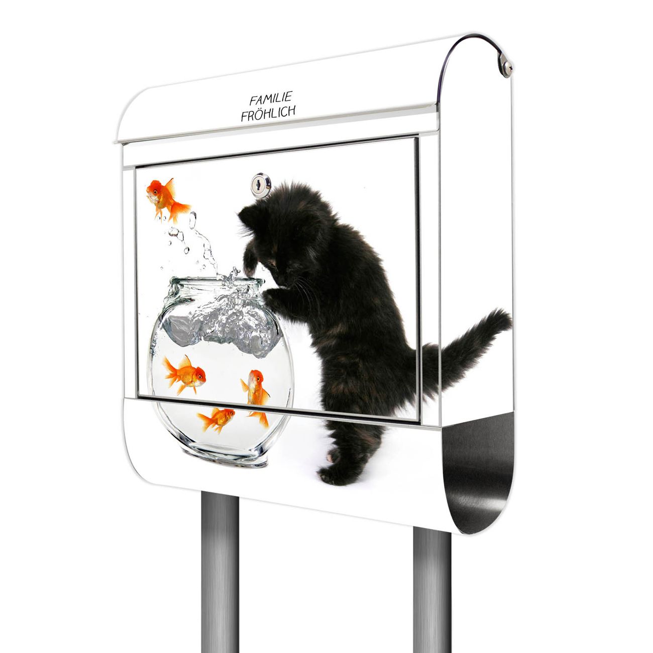 Der banjado Edelstahl Standbriefkasten mit Motiv Katze Und Fisch und eigenem Wunschtext bietet Ihnen mit seinem Fassungsvermögen genügend Platz auch für große A4 Sendungen. Das integrierte Zeitungsfach eignet sich hervorragend, um unkompliziert die Tageszeitung zu fassen.