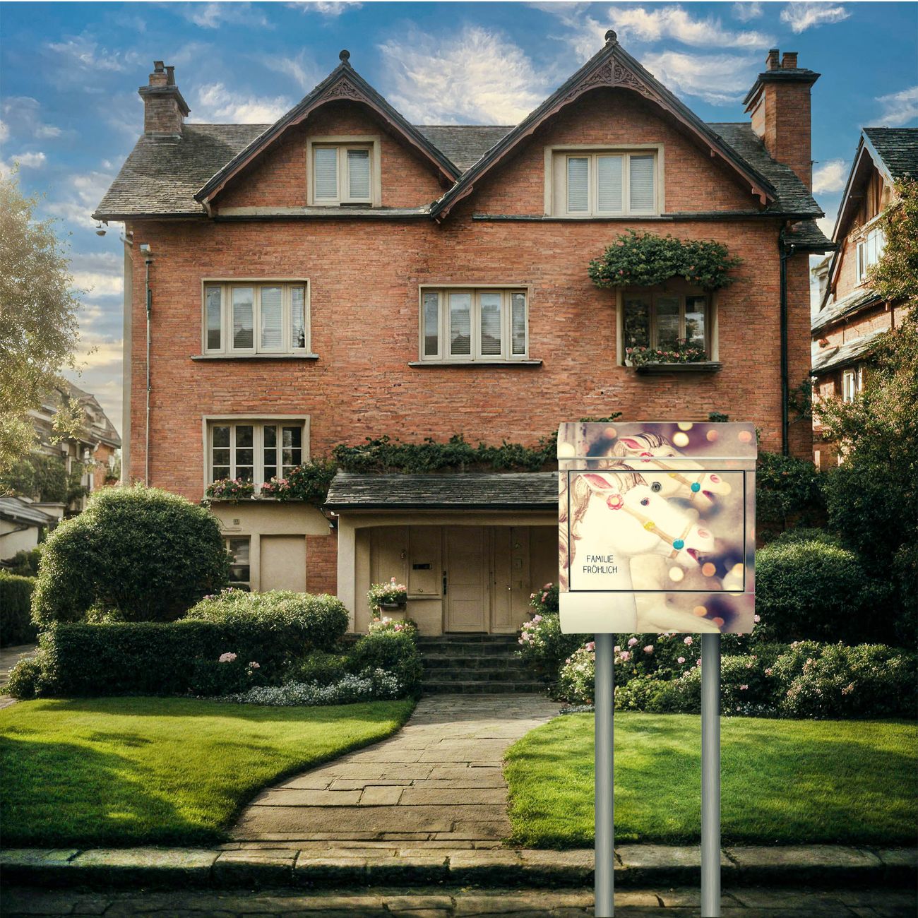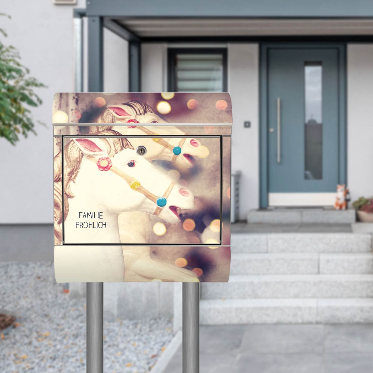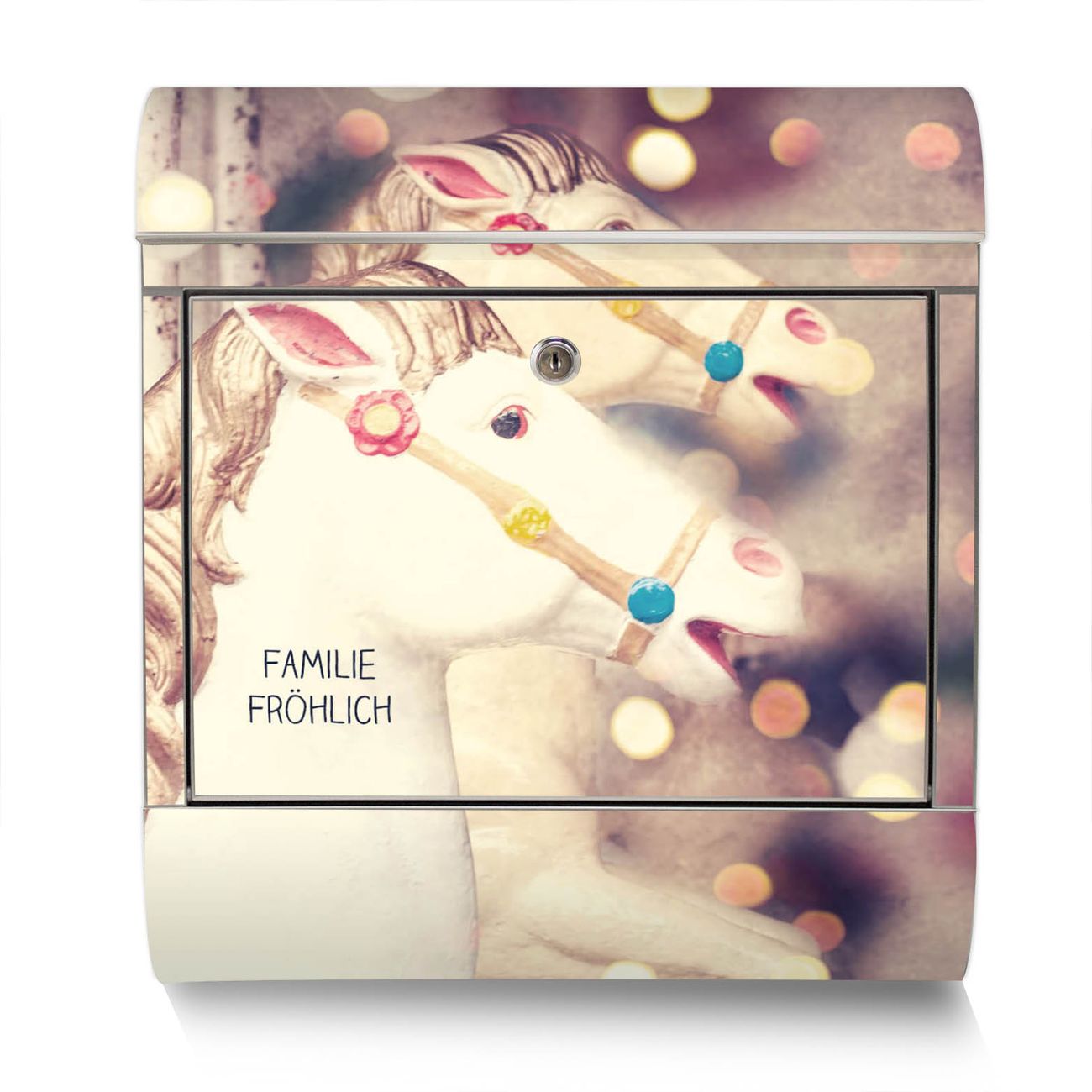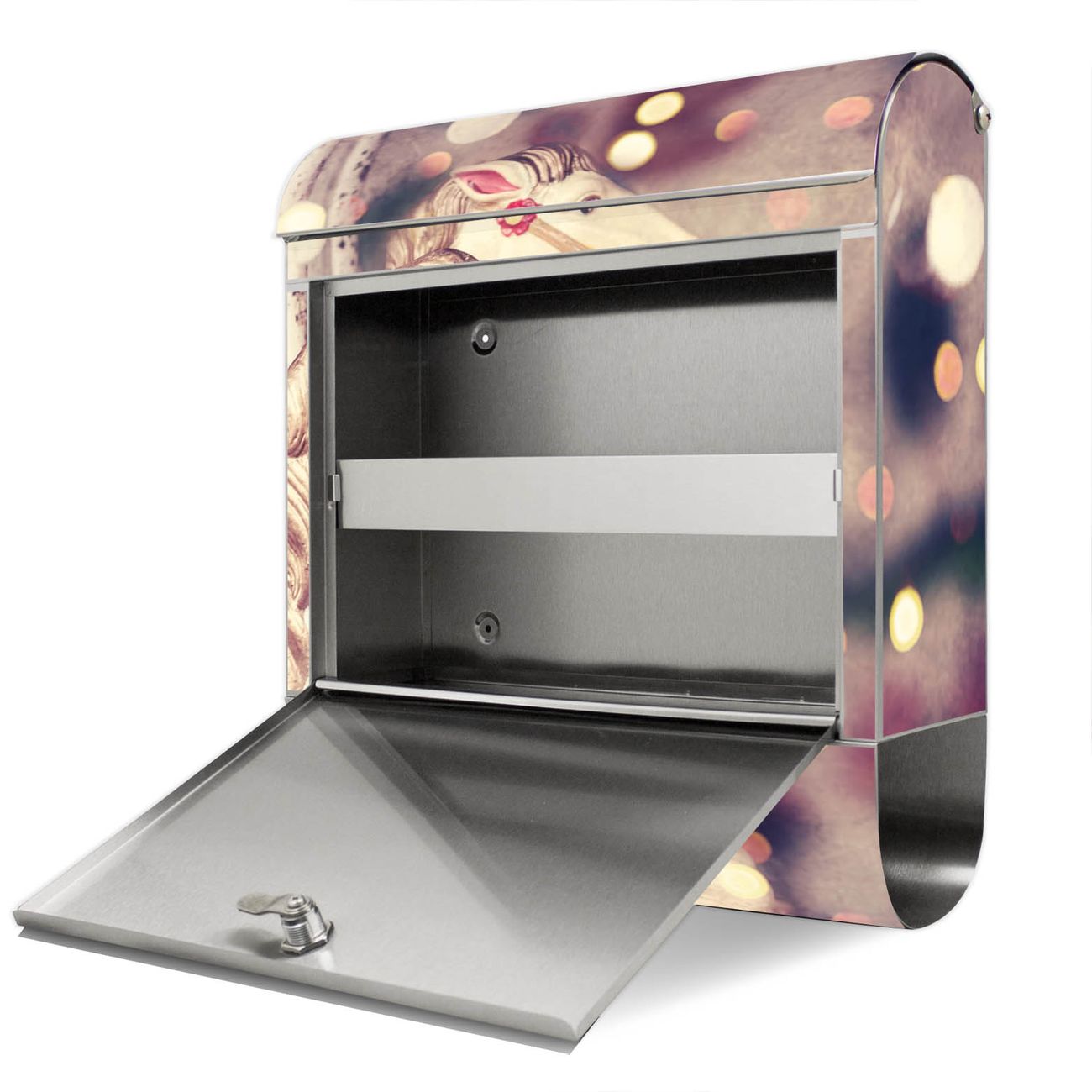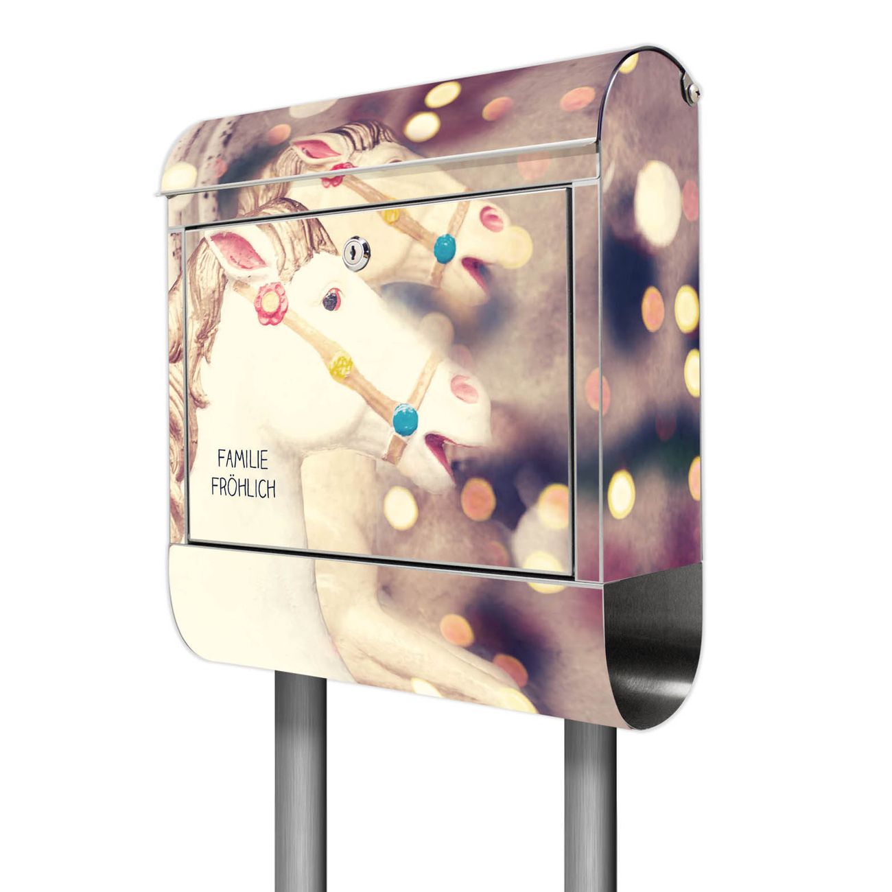 Der Motivstandbriefkasten hat ein sehr ansprechendes und ausgefallenes Design, damit entlocken Sie Ihren Nachbarn und dem Postboten ein Lächeln. Heben Sie Sich ab von der tristen grauen Masse, ohne auf Funktionalität zu verzichten. Der Briefkasten besteht aus hochwertigem 18/0 Edelstahl und die Wetter- und UV-resistenten Folie mit Kinderkarussell Motiv ist zusätzlich mit einem Schutzlaminat überzogen. Der Standbriefkasten wird mit Montagematerial und zwei Schlüsseln geliefert.