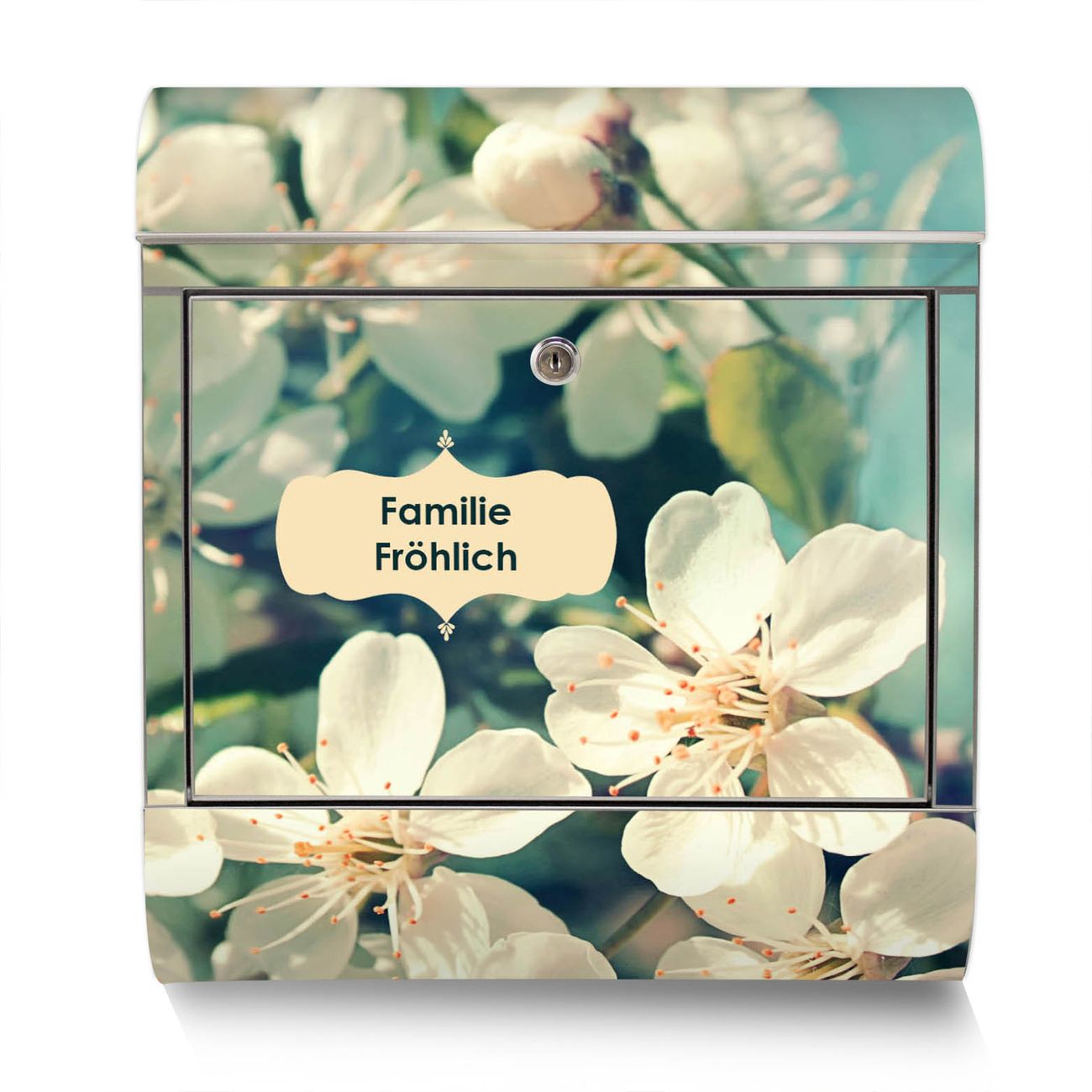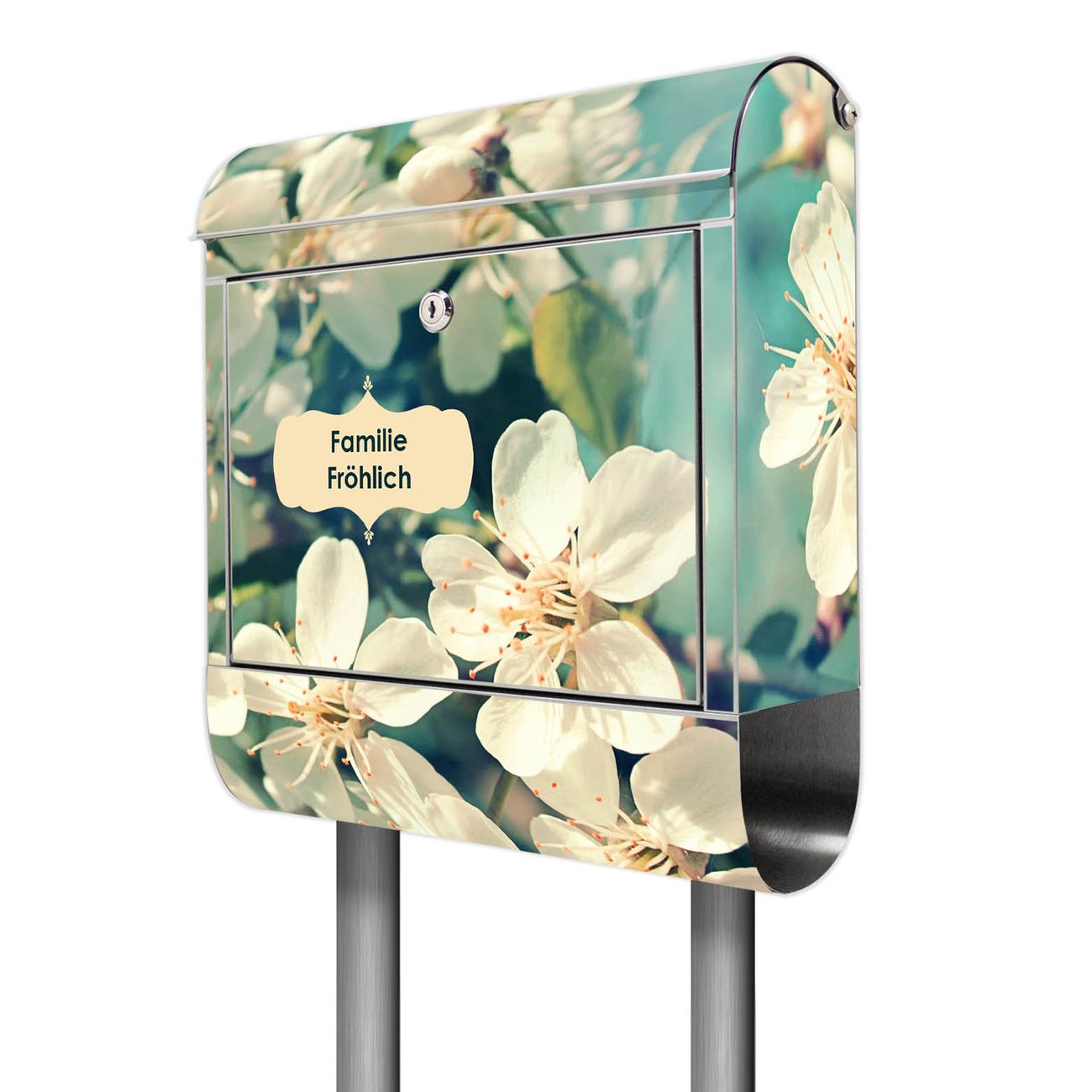 Der banjado Edelstahl Standbriefkasten mit Motiv Kirschblüten 2 und eigenem Wunschtext bietet Ihnen mit seinem Fassungsvermögen genügend Platz auch für große A4 Sendungen. Das integrierte Zeitungsfach eignet sich hervorragend, um unkompliziert die Tageszeitung zu fassen.