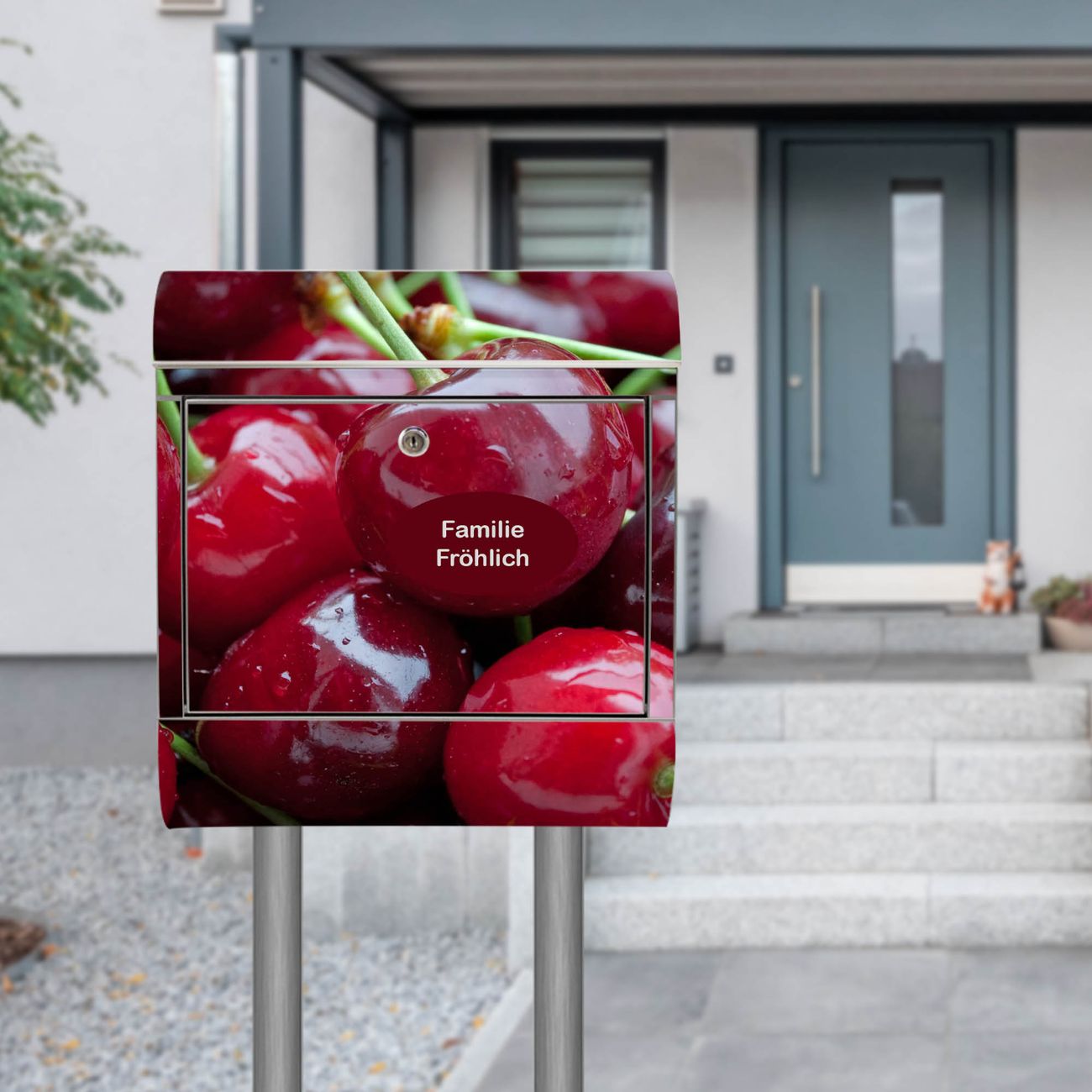 Der Motivstandbriefkasten hat ein sehr ansprechendes und ausgefallenes Design, damit entlocken Sie Ihren Nachbarn und dem Postboten ein Lächeln. Heben Sie Sich ab von der tristen grauen Masse, ohne auf Funktionalität zu verzichten. Der Briefkasten besteht aus hochwertigem 18/0 Edelstahl und die Wetter- und UV-resistenten Folie mit Kirschen Motiv ist zusätzlich mit einem Schutzlaminat überzogen. Der Standbriefkasten wird mit Montagematerial und zwei Schlüsseln geliefert.