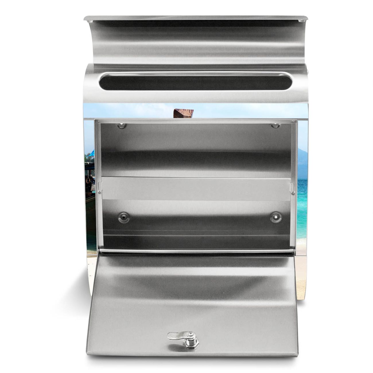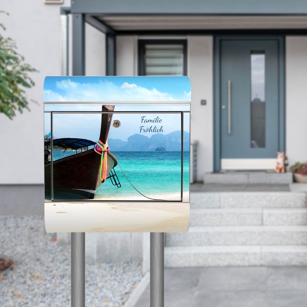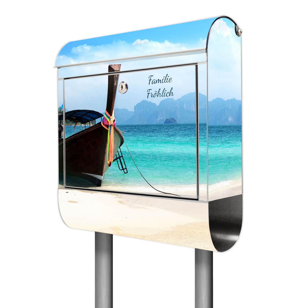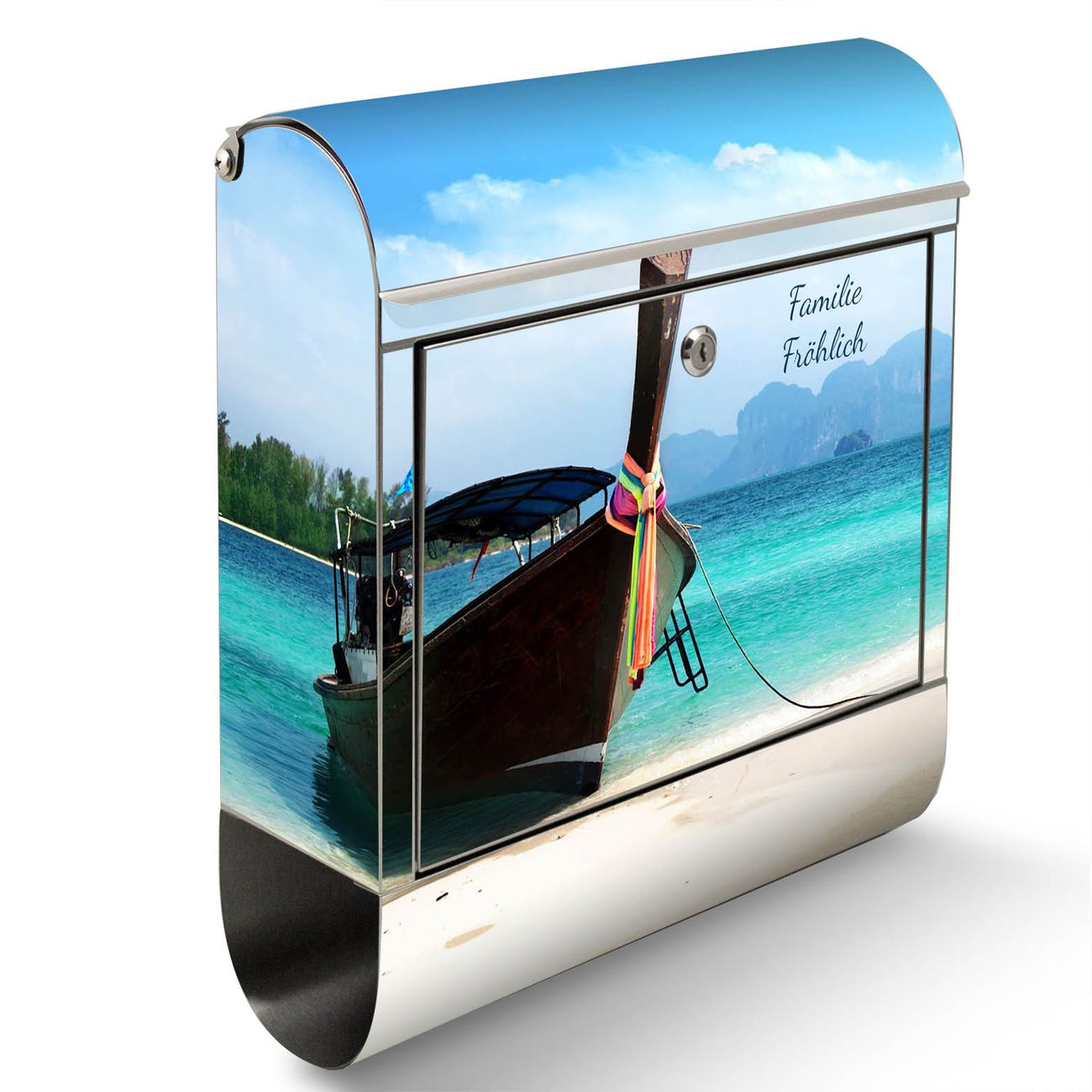 Der banjado Edelstahl Standbriefkasten mit Motiv Koh Poda und eigenem Wunschtext bietet Ihnen mit seinem Fassungsvermögen genügend Platz auch für große A4 Sendungen. Das integrierte Zeitungsfach eignet sich hervorragend, um unkompliziert die Tageszeitung zu fassen.