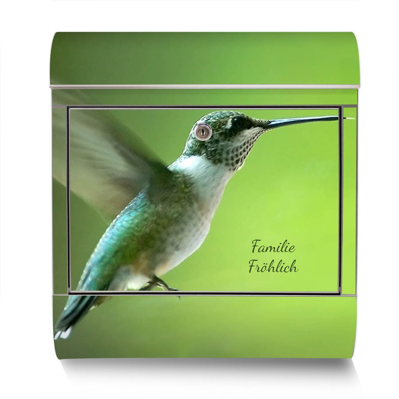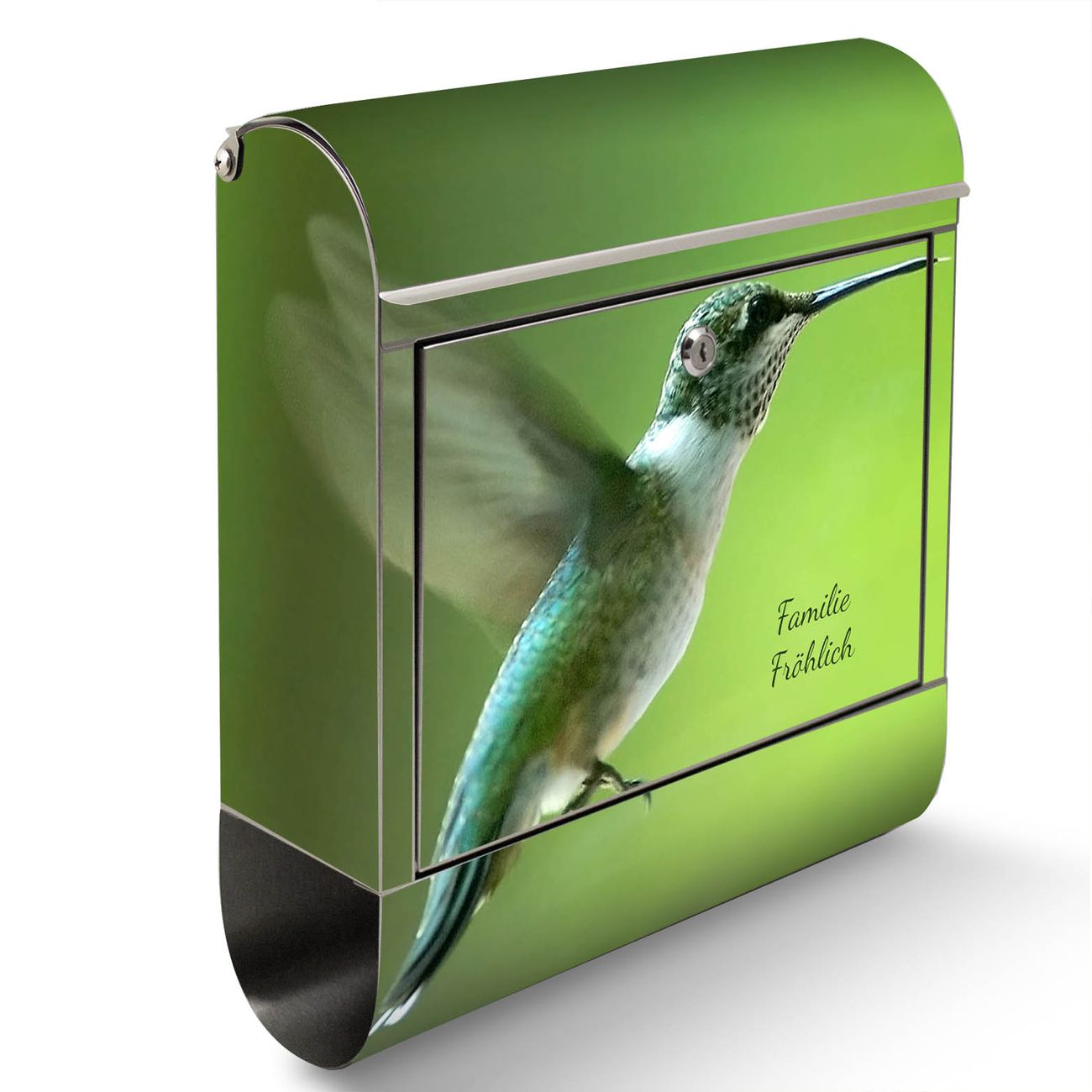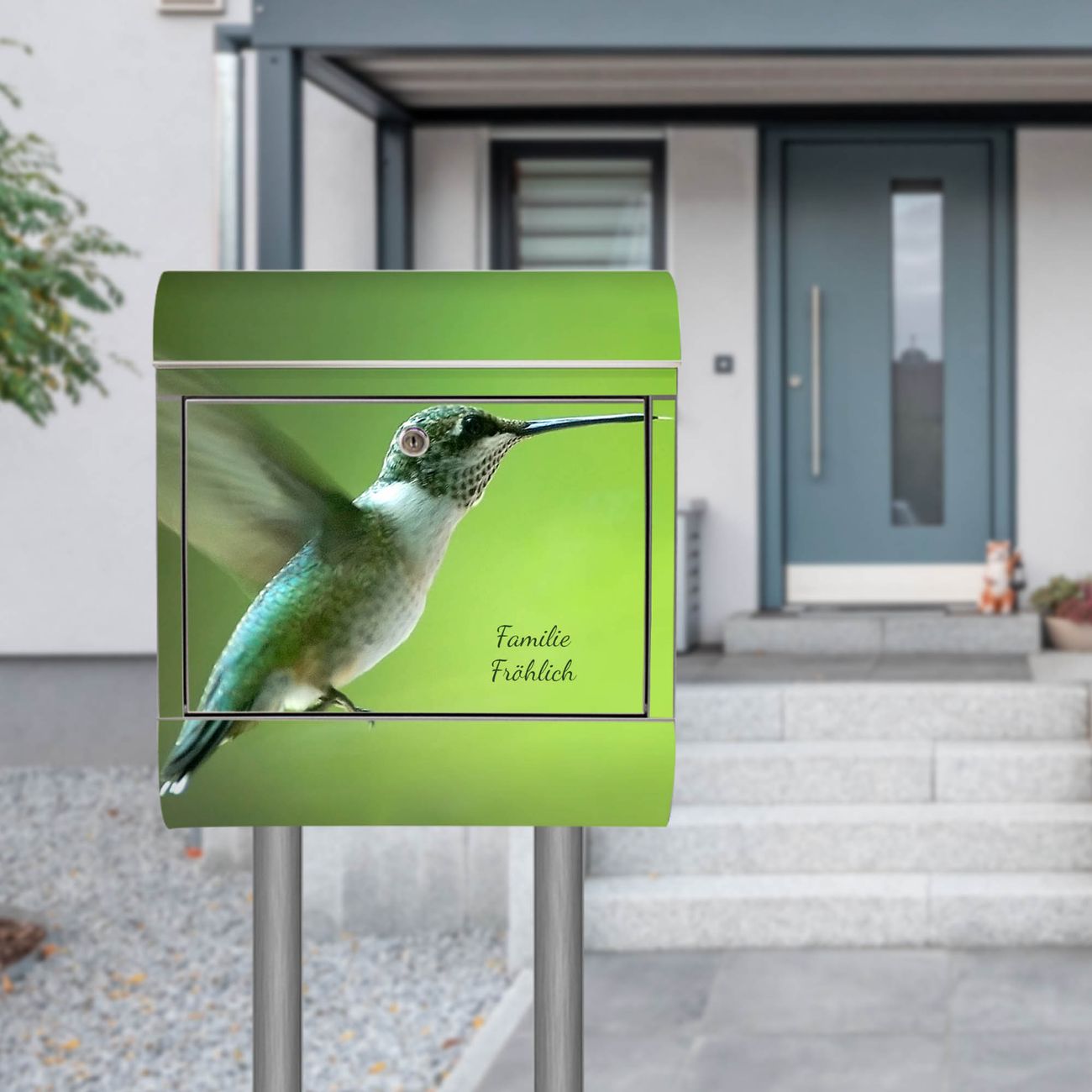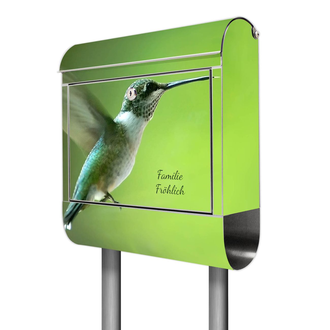 Der banjado Edelstahl Standbriefkasten mit Motiv Kolibri und eigenem Wunschtext bietet Ihnen mit seinem Fassungsvermögen genügend Platz auch für große A4 Sendungen. Das integrierte Zeitungsfach eignet sich hervorragend, um unkompliziert die Tageszeitung zu fassen.