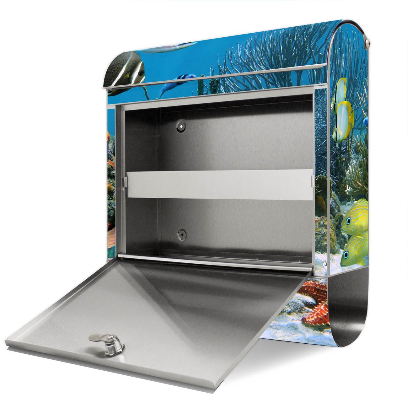 Der Motivstandbriefkasten hat ein sehr ansprechendes und ausgefallenes Design, damit entlocken Sie Ihren Nachbarn und dem Postboten ein Lächeln. Heben Sie Sich ab von der tristen grauen Masse, ohne auf Funktionalität zu verzichten. Der Briefkasten besteht aus hochwertigem 18/0 Edelstahl und die Wetter- und UV-resistenten Folie mit Korallenriff 1 Motiv ist zusätzlich mit einem Schutzlaminat überzogen. Der Standbriefkasten wird mit Montagematerial und zwei Schlüsseln geliefert.