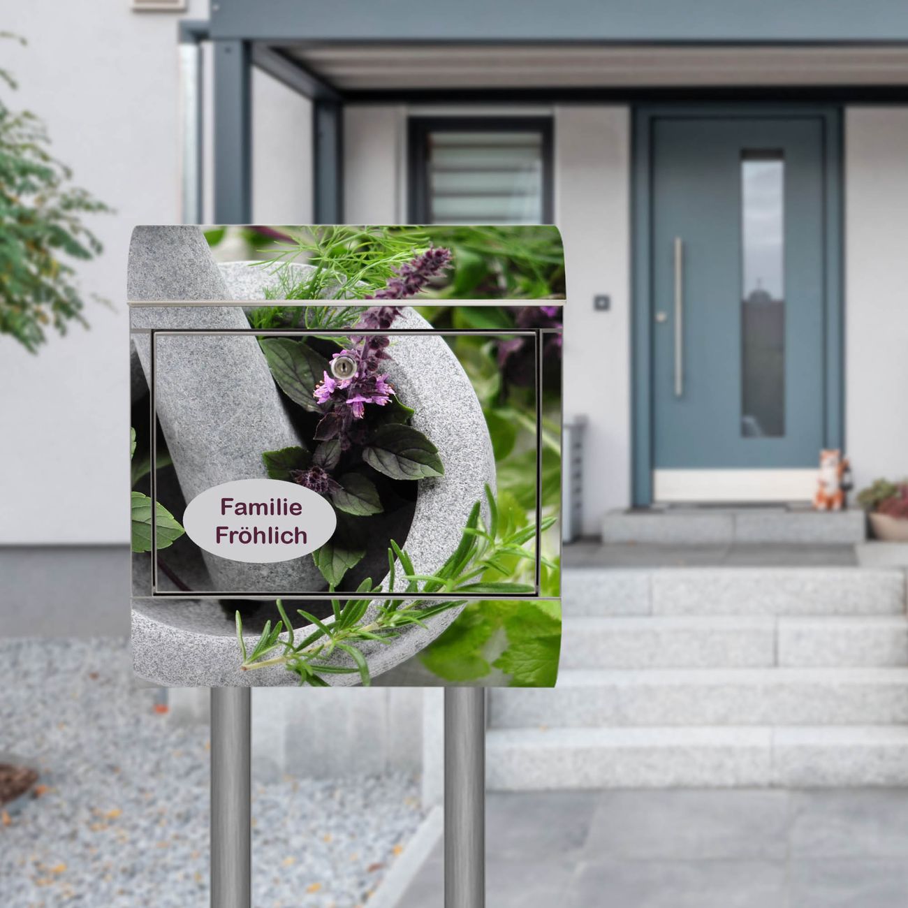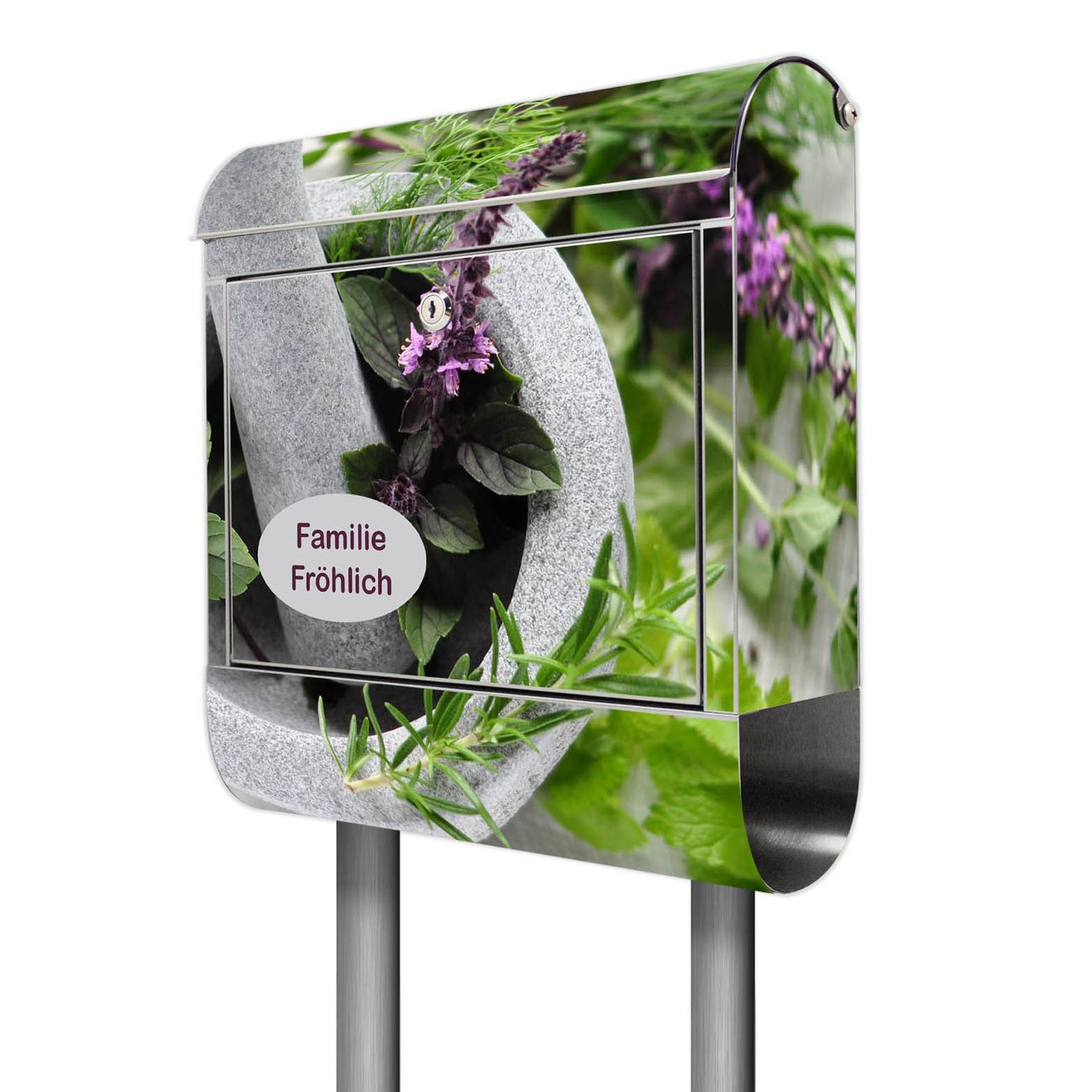 Der Motivstandbriefkasten hat ein sehr ansprechendes und ausgefallenes Design, damit entlocken Sie Ihren Nachbarn und dem Postboten ein Lächeln. Heben Sie Sich ab von der tristen grauen Masse, ohne auf Funktionalität zu verzichten. Der Briefkasten besteht aus hochwertigem 18/0 Edelstahl und die Wetter- und UV-resistenten Folie mit Kräuter Motiv ist zusätzlich mit einem Schutzlaminat überzogen. Der Standbriefkasten wird mit Montagematerial und zwei Schlüsseln geliefert.