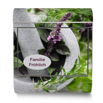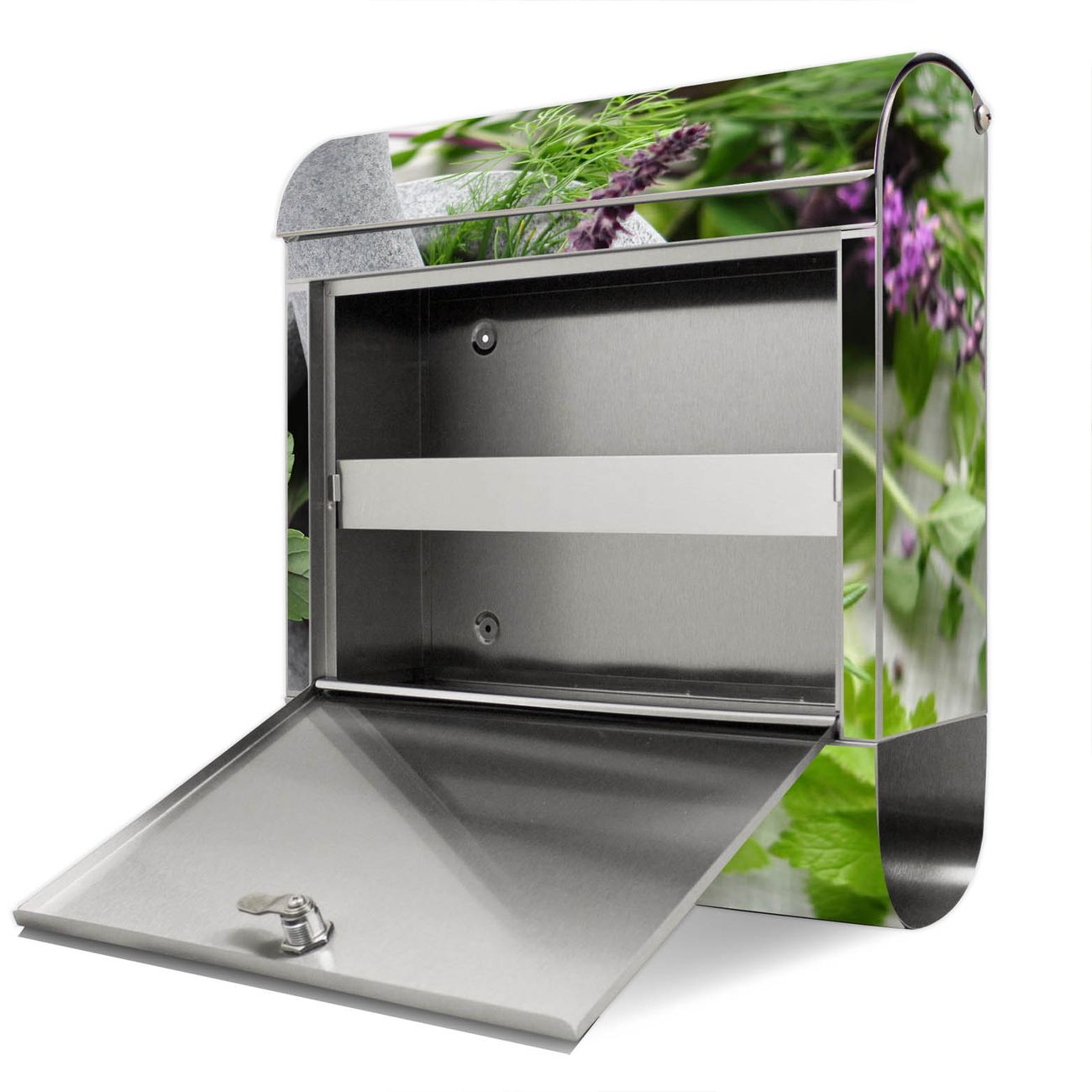 Der banjado Edelstahl Standbriefkasten mit Motiv Kräuter und eigenem Wunschtext bietet Ihnen mit seinem Fassungsvermögen genügend Platz auch für große A4 Sendungen. Das integrierte Zeitungsfach eignet sich hervorragend, um unkompliziert die Tageszeitung zu fassen.