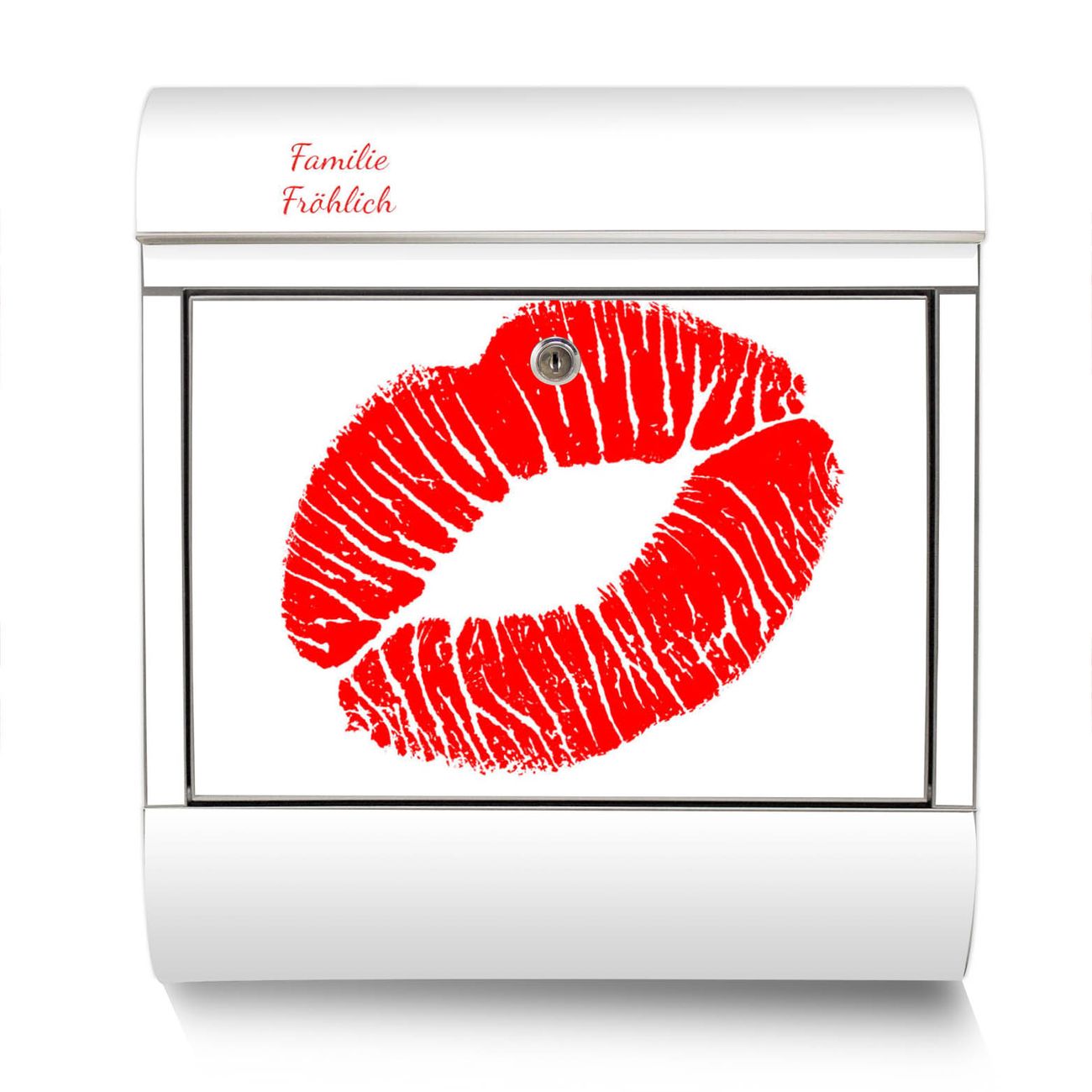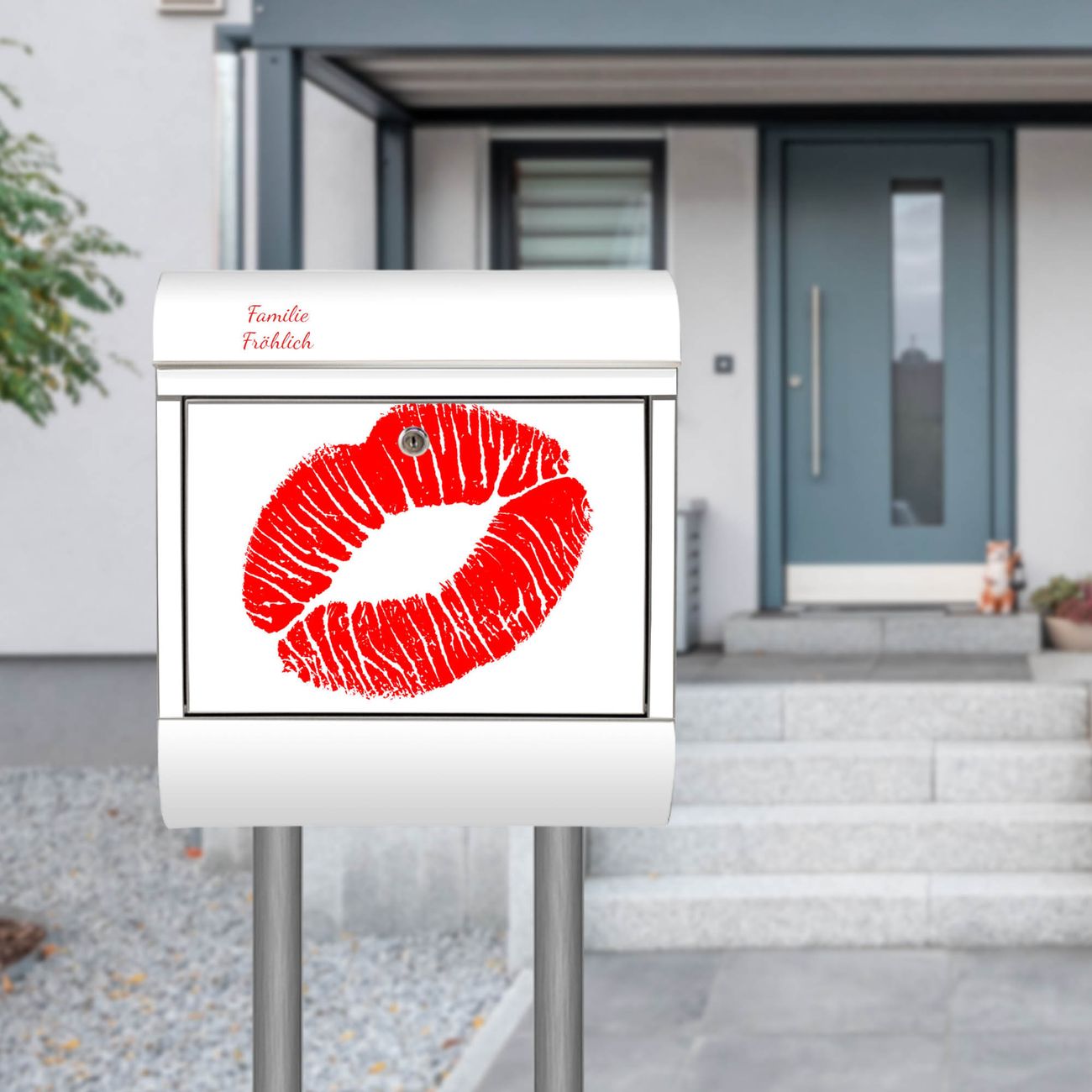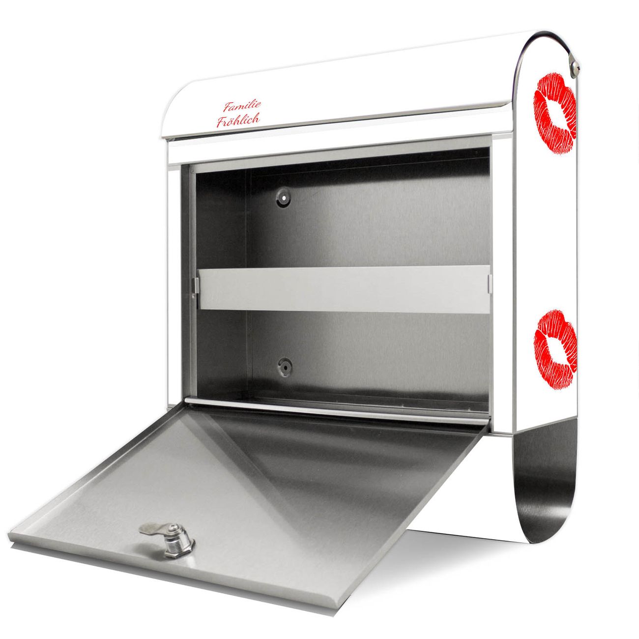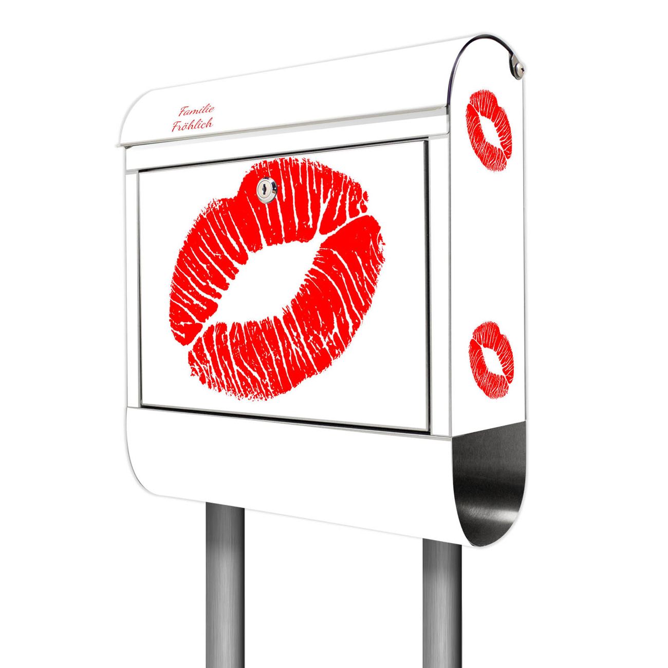 Der banjado Edelstahl Standbriefkasten mit Motiv Kussmund und eigenem Wunschtext bietet Ihnen mit seinem Fassungsvermögen genügend Platz auch für große A4 Sendungen. Das integrierte Zeitungsfach eignet sich hervorragend, um unkompliziert die Tageszeitung zu fassen.