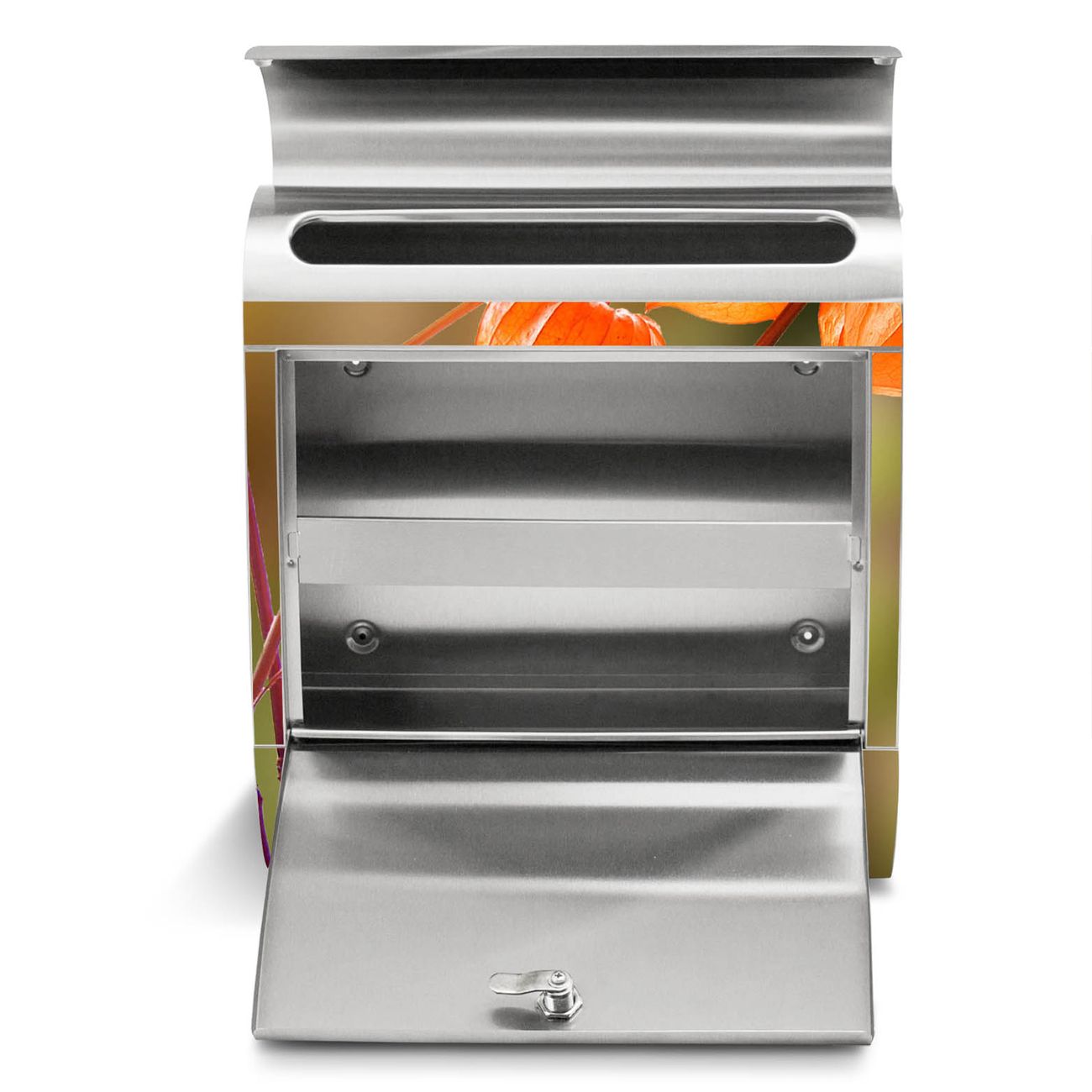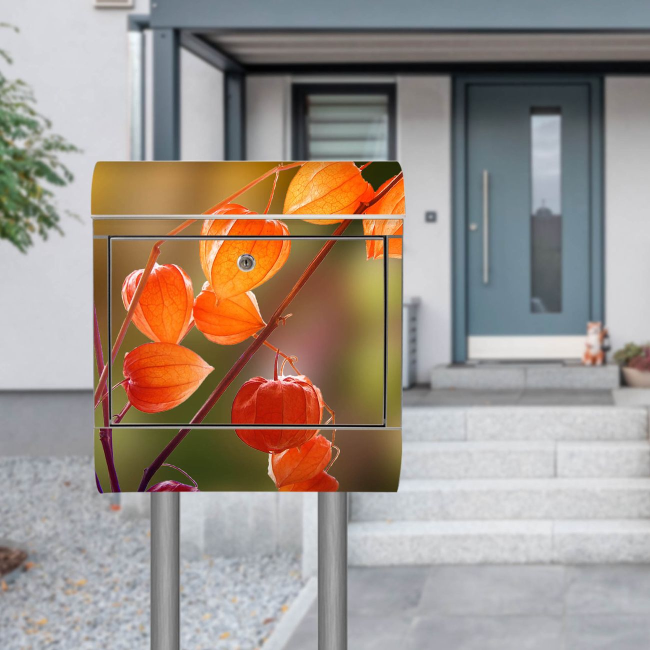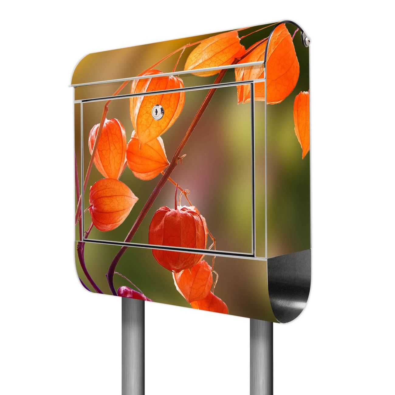 Der Motivstandbriefkasten hat ein sehr ansprechendes und ausgefallenes Design, damit entlocken Sie Ihren Nachbarn und dem Postboten ein Lächeln. Heben Sie Sich ab von der tristen grauen Masse, ohne auf Funktionalität zu verzichten. Der Briefkasten besteht aus hochwertigem 18/0 Edelstahl und die Wetter- und UV-resistenten Folie mit Lampionblume Motiv ist zusätzlich mit einem Schutzlaminat überzogen. Der Standbriefkasten wird mit Montagematerial und zwei Schlüsseln geliefert.