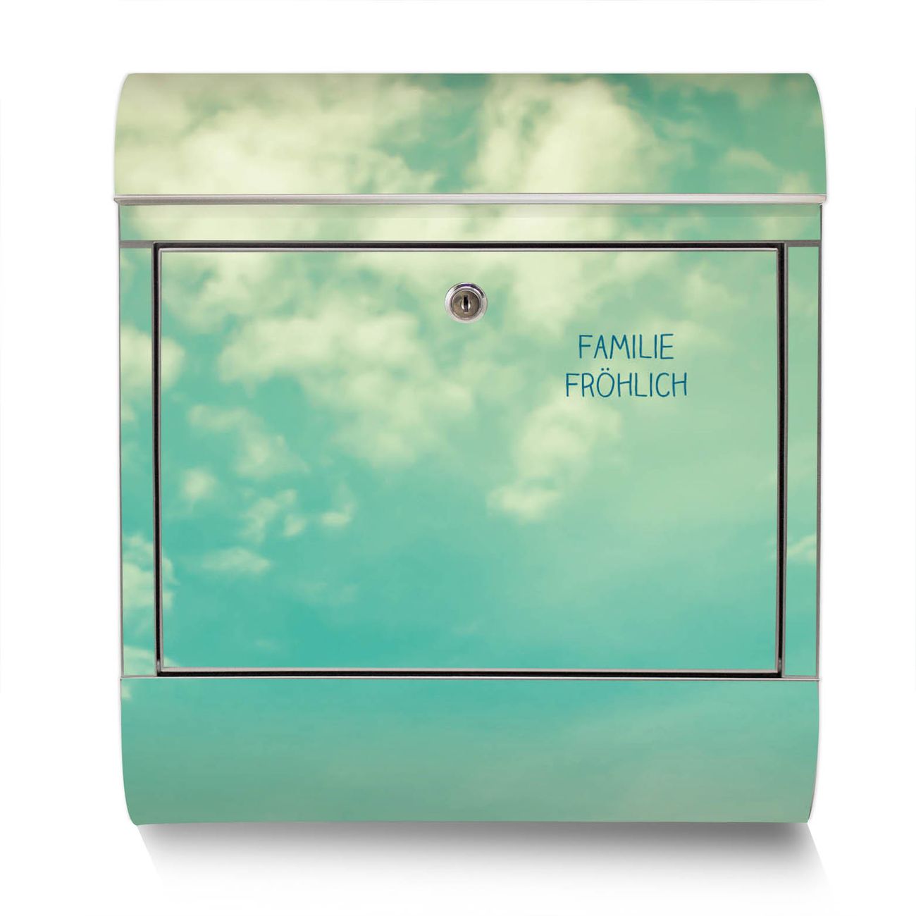 Der banjado Edelstahl Standbriefkasten mit Motiv Leicht Bewölkt und eigenem Wunschtext bietet Ihnen mit seinem Fassungsvermögen genügend Platz auch für große A4 Sendungen. Das integrierte Zeitungsfach eignet sich hervorragend, um unkompliziert die Tageszeitung zu fassen.
