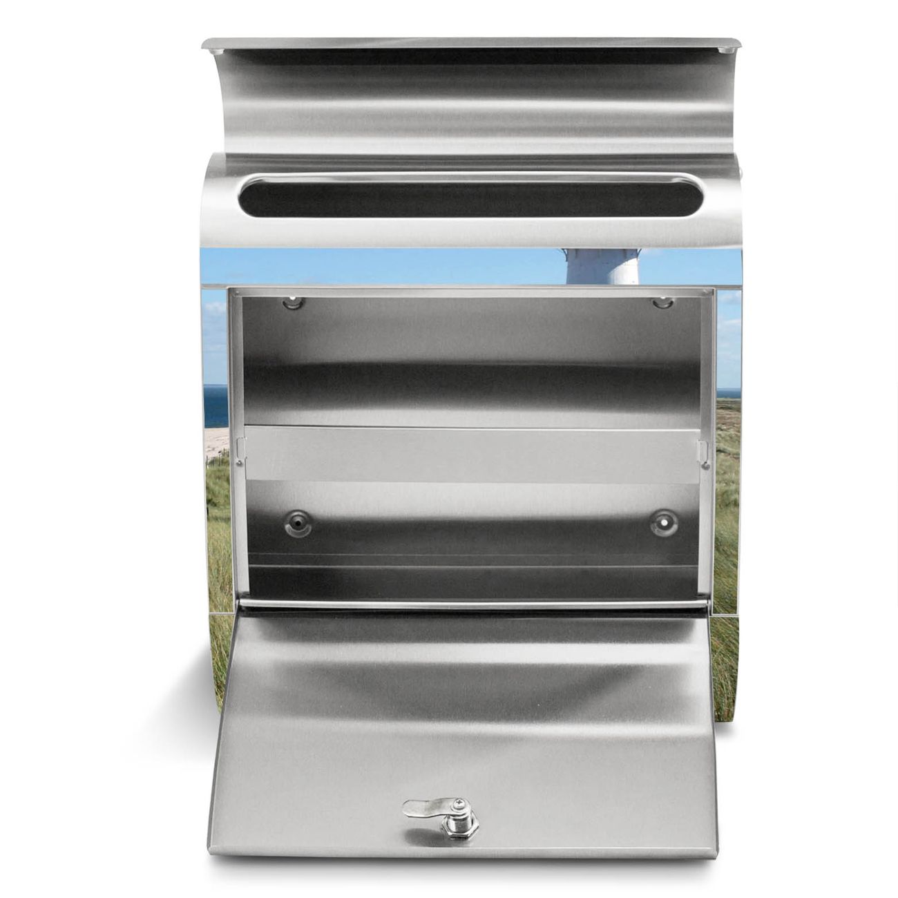 Der banjado Edelstahl Standbriefkasten mit Motiv Leuchtturm und eigenem Wunschtext bietet Ihnen mit seinem Fassungsvermögen genügend Platz auch für große A4 Sendungen. Das integrierte Zeitungsfach eignet sich hervorragend, um unkompliziert die Tageszeitung zu fassen.