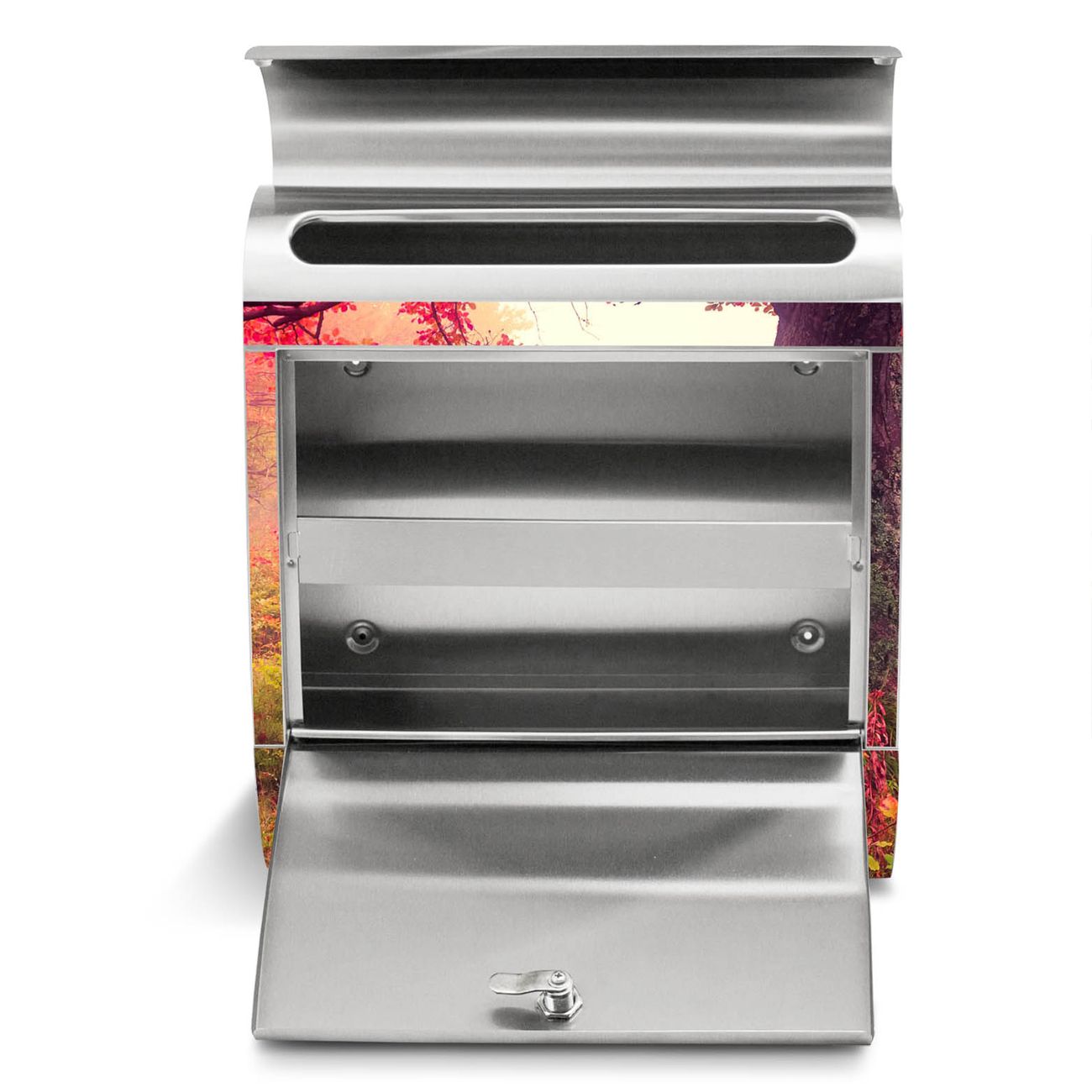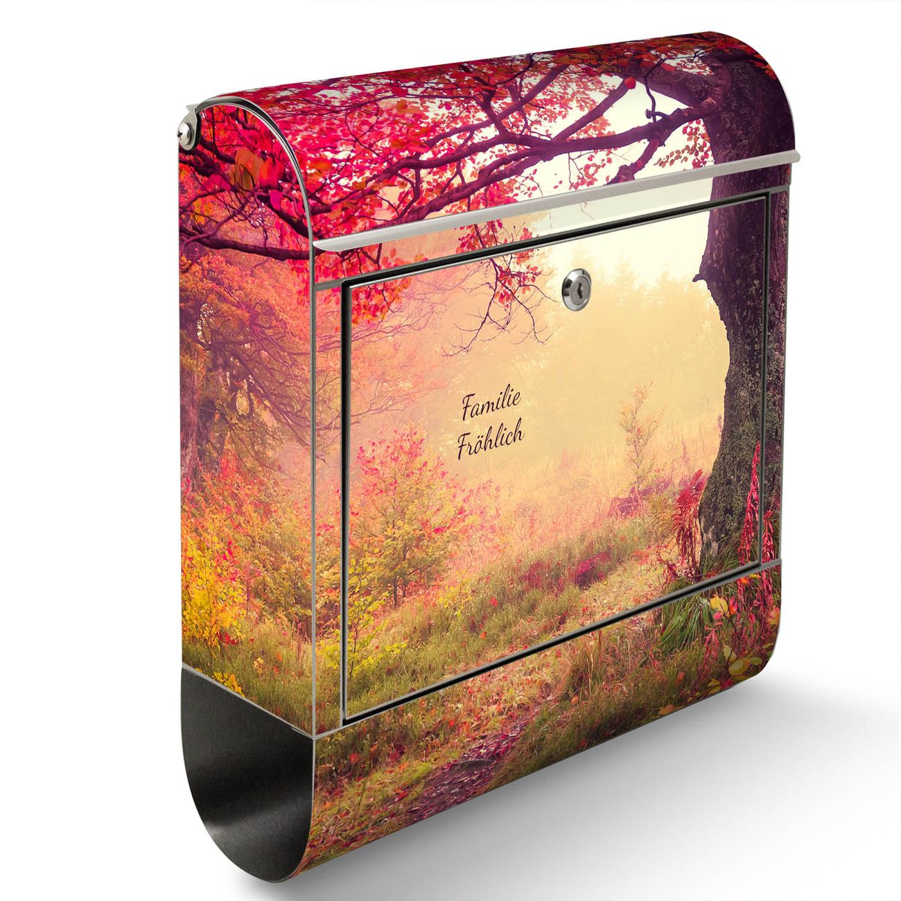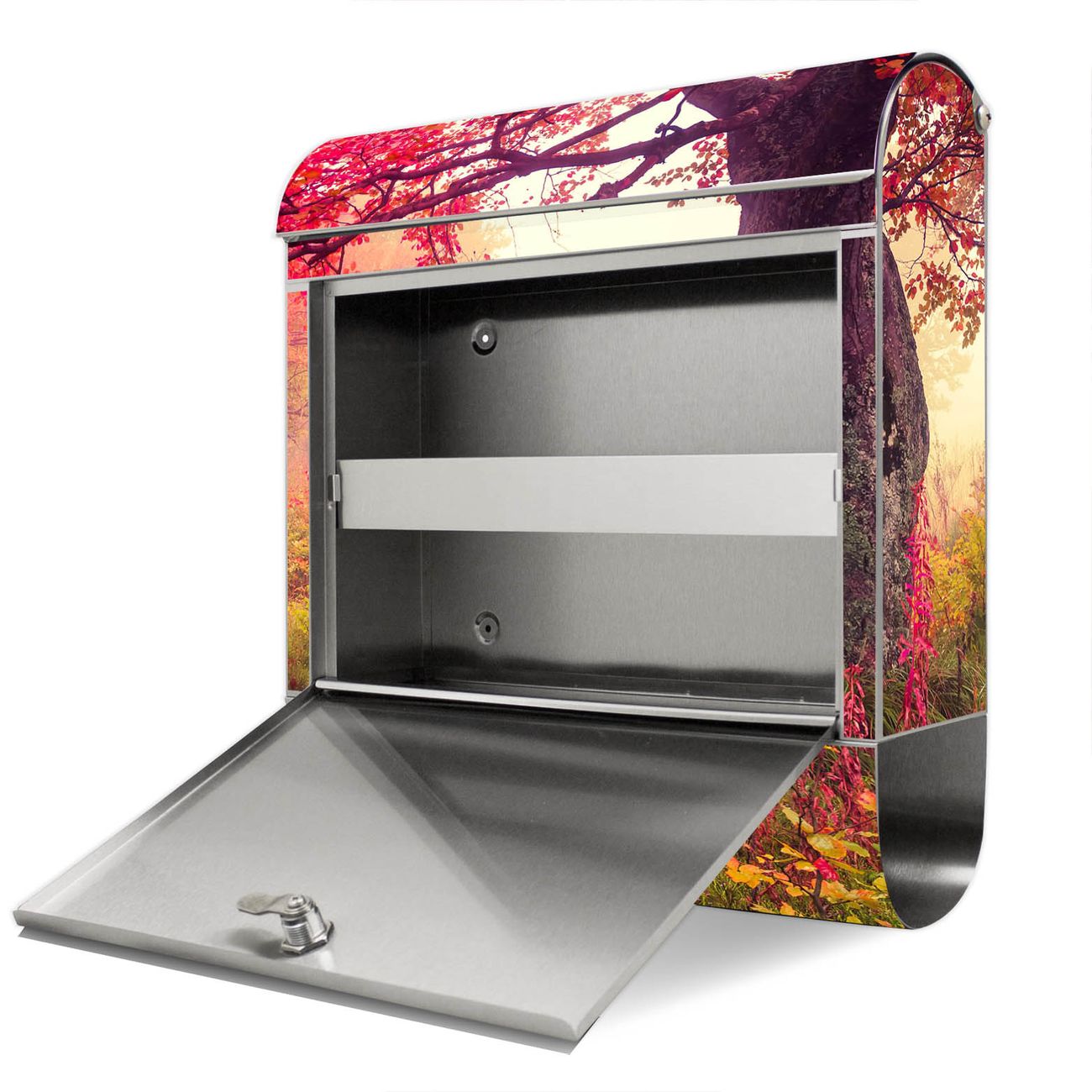 Der Motivstandbriefkasten hat ein sehr ansprechendes und ausgefallenes Design, damit entlocken Sie Ihren Nachbarn und dem Postboten ein Lächeln. Heben Sie Sich ab von der tristen grauen Masse, ohne auf Funktionalität zu verzichten. Der Briefkasten besteht aus hochwertigem 18/0 Edelstahl und die Wetter- und UV-resistenten Folie mit Lichtung Im Herbst Motiv ist zusätzlich mit einem Schutzlaminat überzogen. Der Standbriefkasten wird mit Montagematerial und zwei Schlüsseln geliefert.