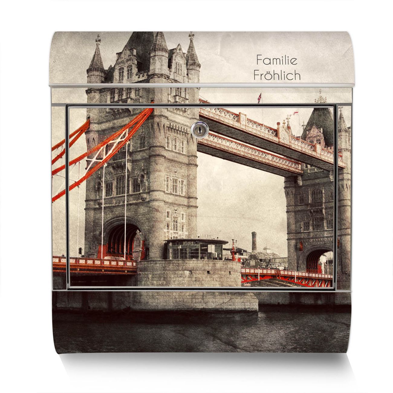 Der banjado Edelstahl Standbriefkasten mit Motiv London Bridge und eigenem Wunschtext bietet Ihnen mit seinem Fassungsvermögen genügend Platz auch für große A4 Sendungen. Das integrierte Zeitungsfach eignet sich hervorragend, um unkompliziert die Tageszeitung zu fassen.