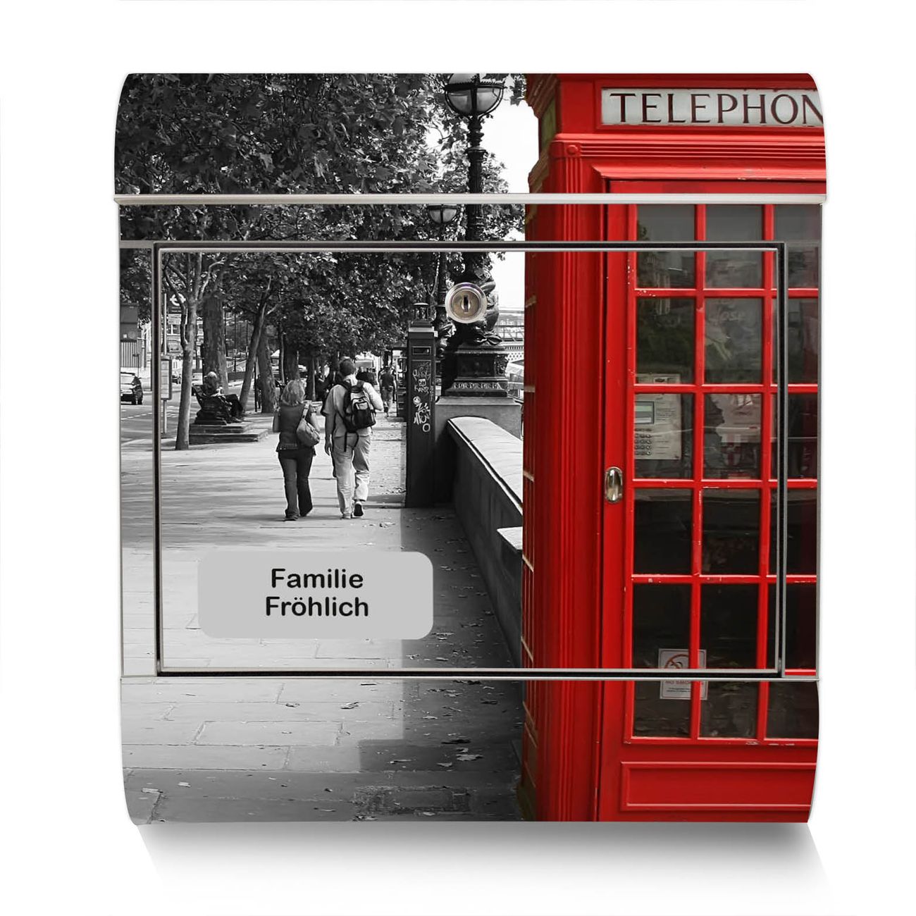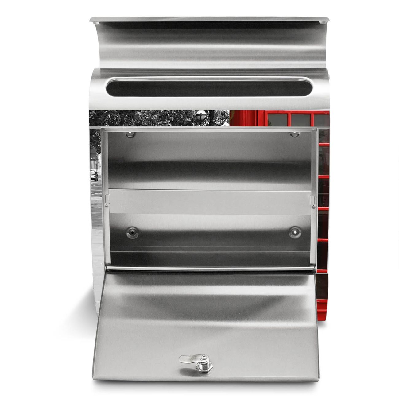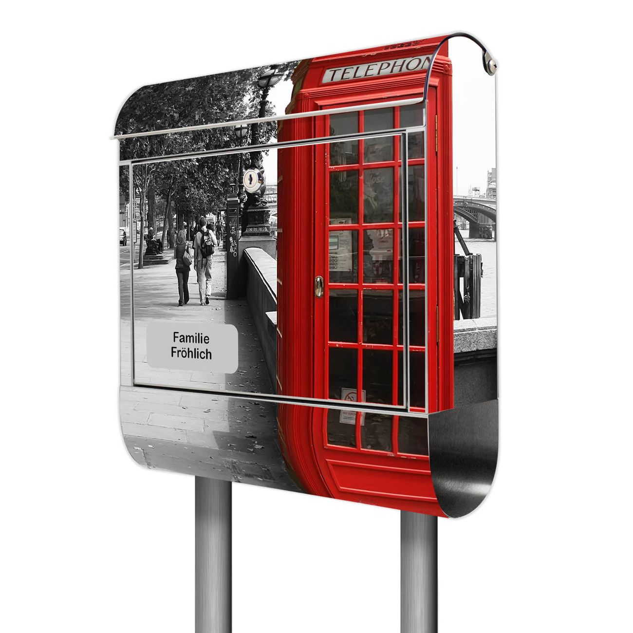 Der banjado Edelstahl Standbriefkasten mit Motiv London Red Telephone und eigenem Wunschtext bietet Ihnen mit seinem Fassungsvermögen genügend Platz auch für große A4 Sendungen. Das integrierte Zeitungsfach eignet sich hervorragend, um unkompliziert die Tageszeitung zu fassen.