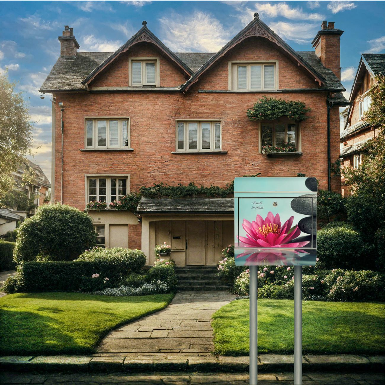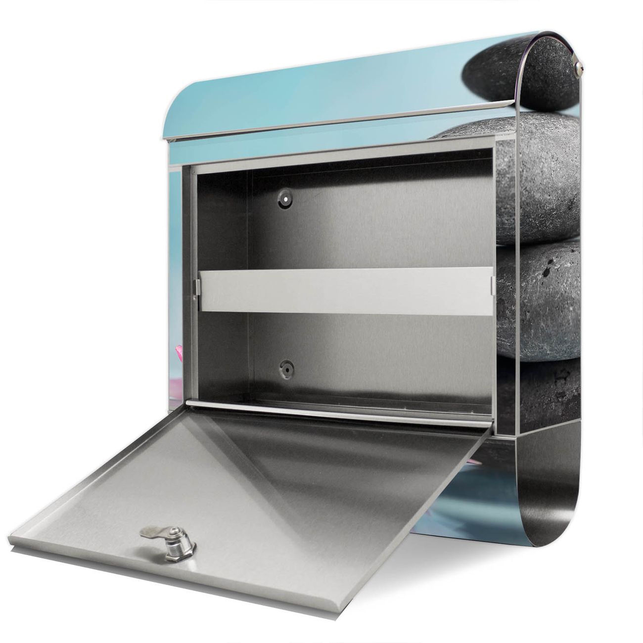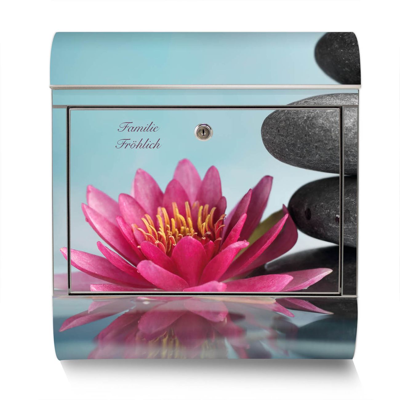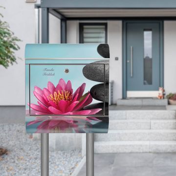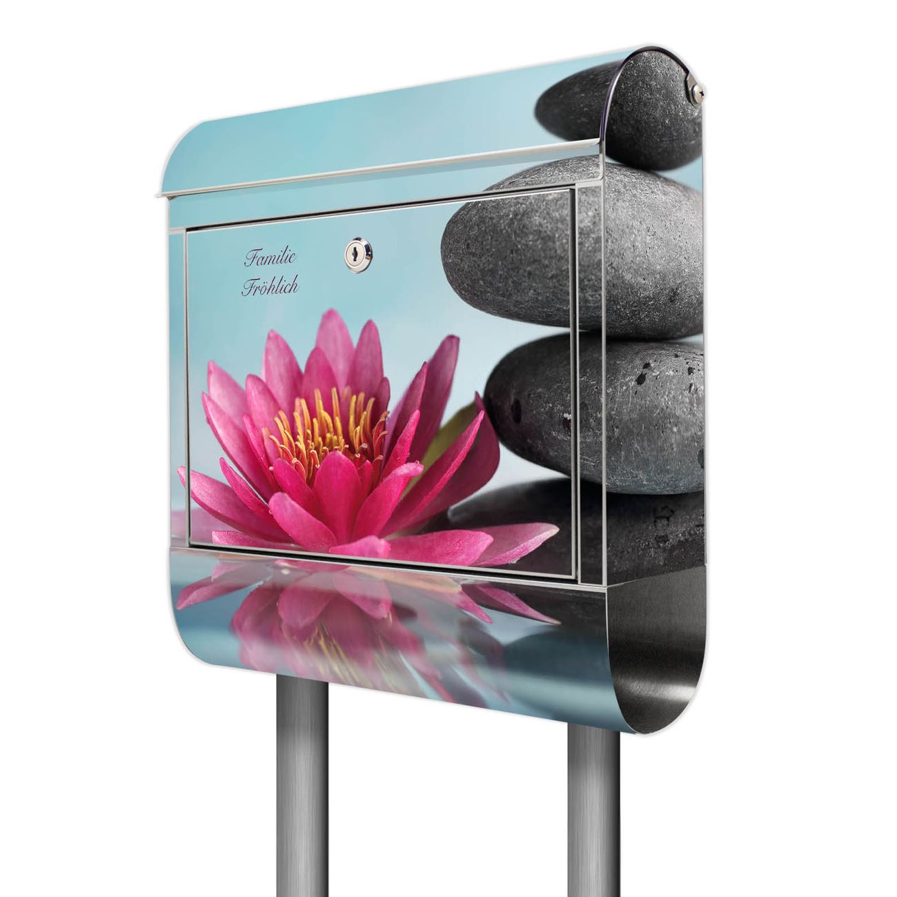 Der banjado Edelstahl Standbriefkasten mit Motiv Lotus Und Steine und eigenem Wunschtext bietet Ihnen mit seinem Fassungsvermögen genügend Platz auch für große A4 Sendungen. Das integrierte Zeitungsfach eignet sich hervorragend, um unkompliziert die Tageszeitung zu fassen.