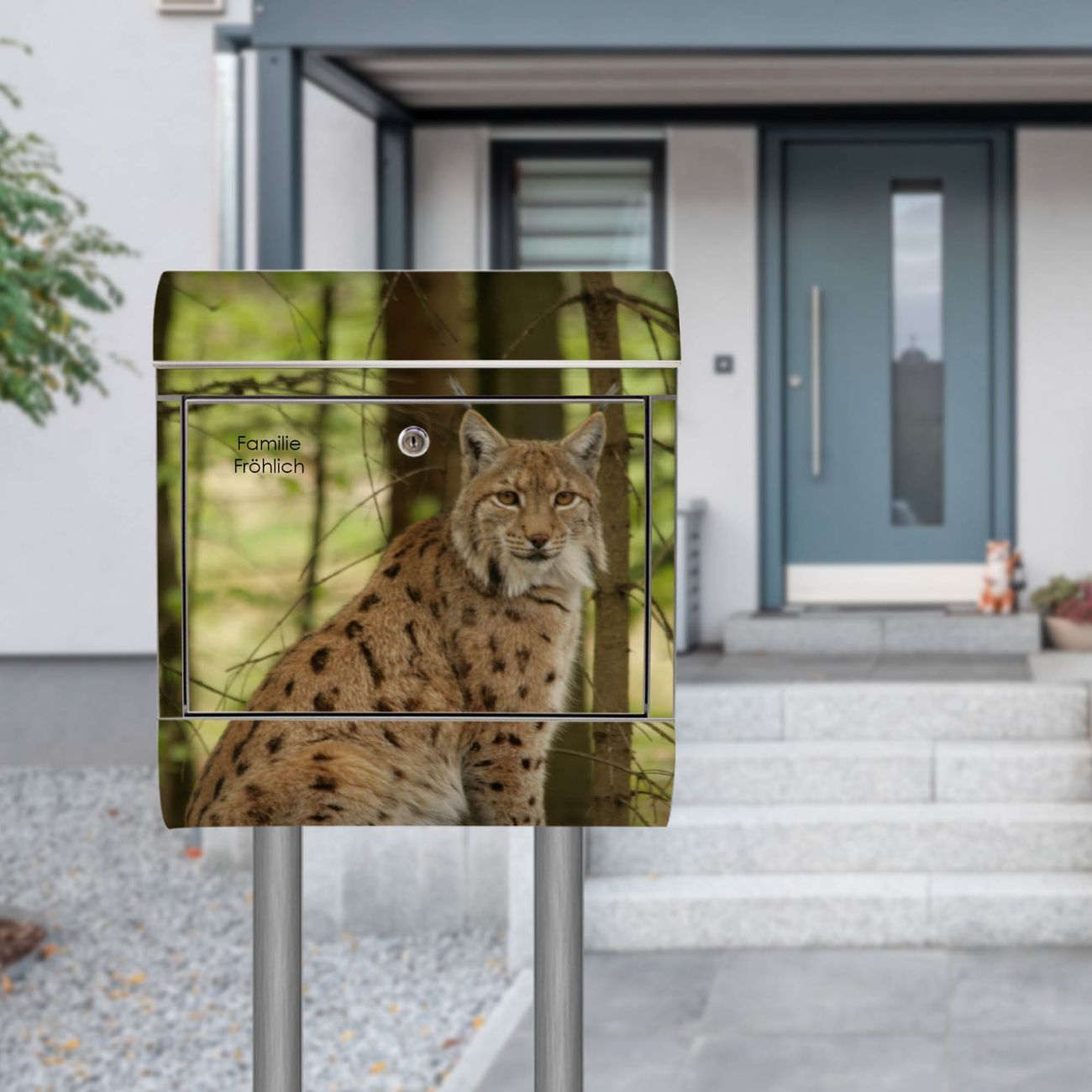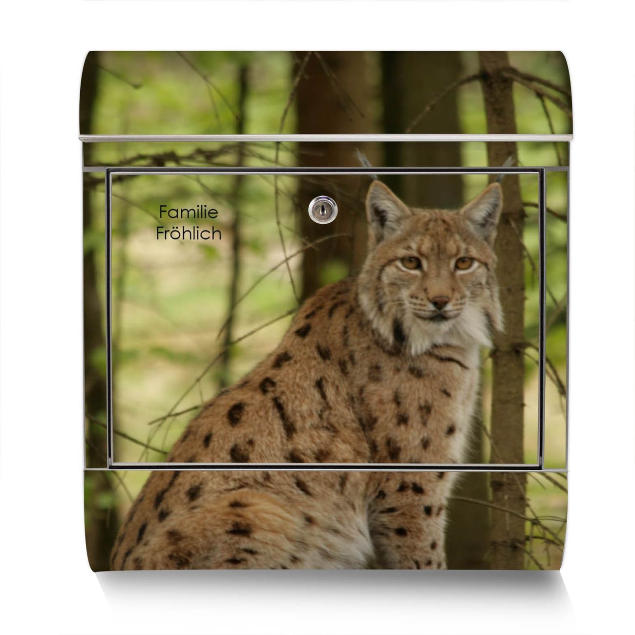 Der Motivstandbriefkasten hat ein sehr ansprechendes und ausgefallenes Design, damit entlocken Sie Ihren Nachbarn und dem Postboten ein Lächeln. Heben Sie Sich ab von der tristen grauen Masse, ohne auf Funktionalität zu verzichten. Der Briefkasten besteht aus hochwertigem 18/0 Edelstahl und die Wetter- und UV-resistenten Folie mit Luchs Motiv ist zusätzlich mit einem Schutzlaminat überzogen. Der Standbriefkasten wird mit Montagematerial und zwei Schlüsseln geliefert.