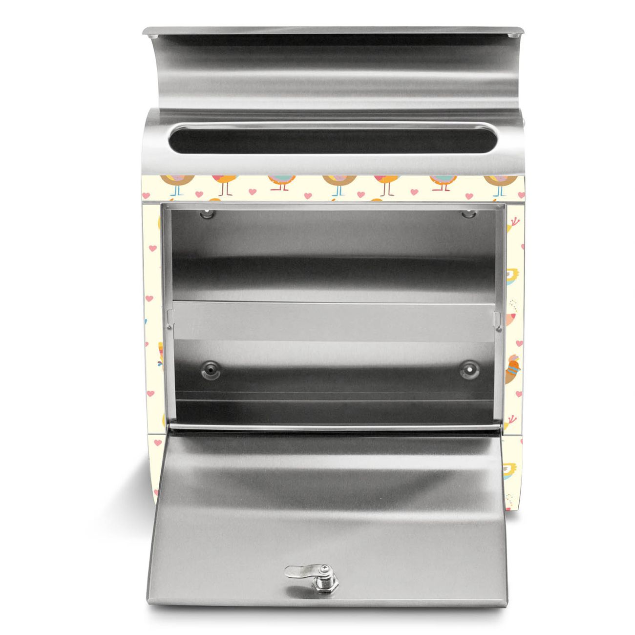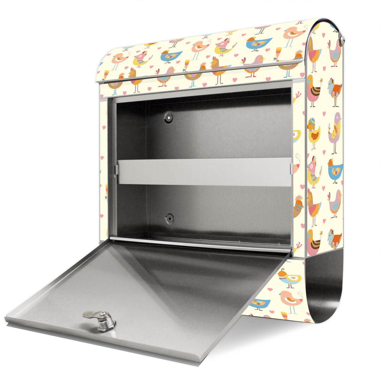 Der Motivstandbriefkasten hat ein sehr ansprechendes und ausgefallenes Design, damit entlocken Sie Ihren Nachbarn und dem Postboten ein Lächeln. Heben Sie Sich ab von der tristen grauen Masse, ohne auf Funktionalität zu verzichten. Der Briefkasten besteht aus hochwertigem 18/0 Edelstahl und die Wetter- und UV-resistenten Folie mit Lustige Vögel Motiv ist zusätzlich mit einem Schutzlaminat überzogen. Der Standbriefkasten wird mit Montagematerial und zwei Schlüsseln geliefert.