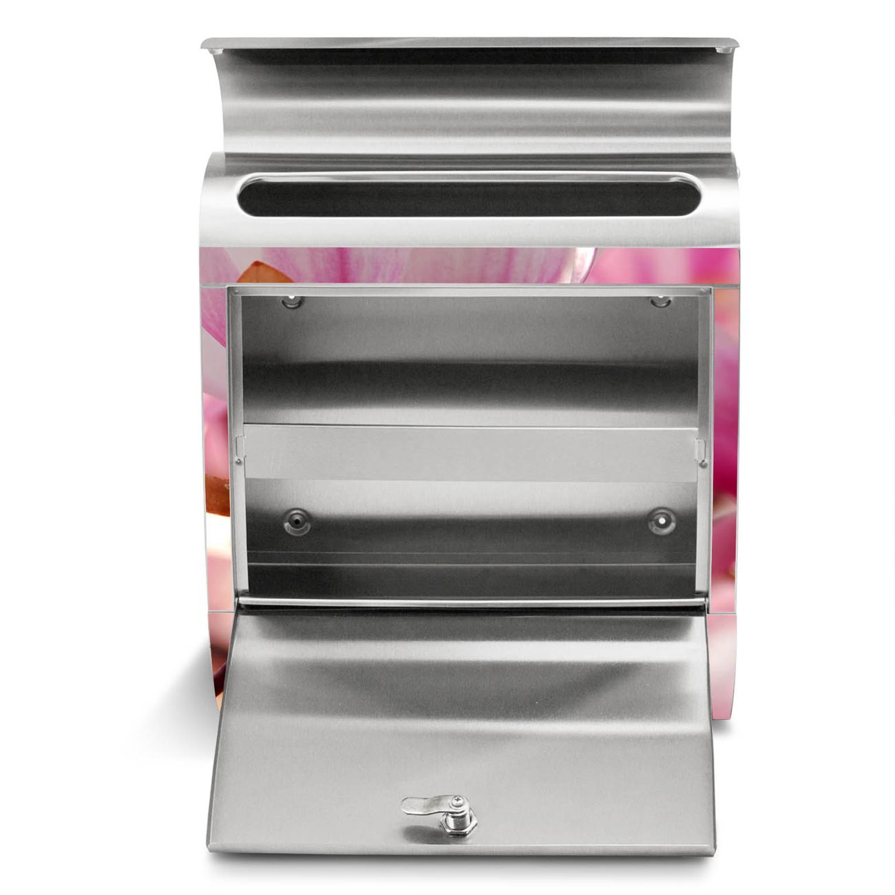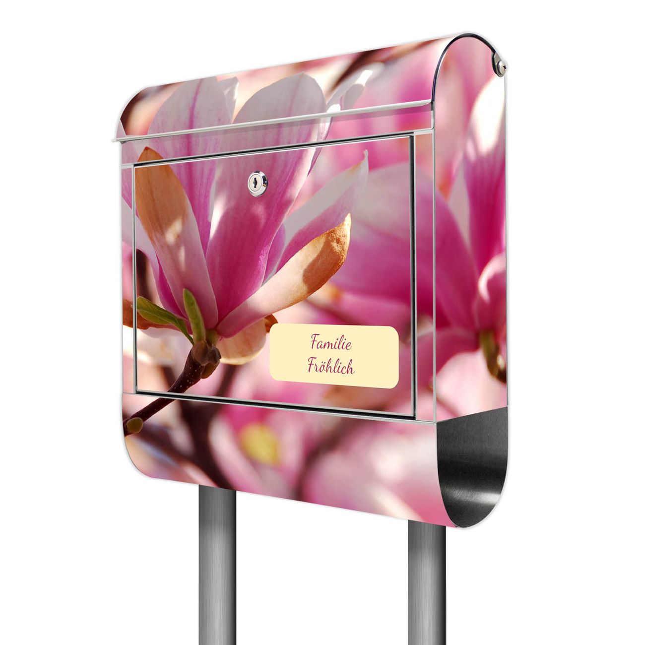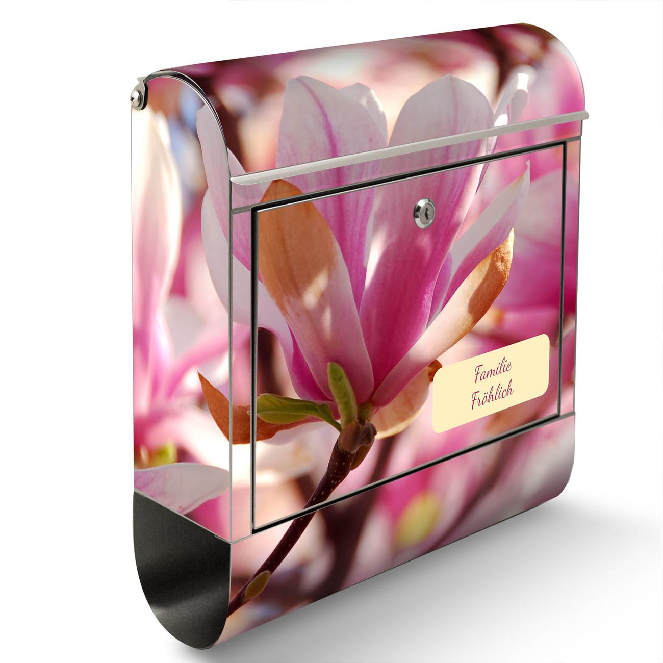 Der Motivstandbriefkasten hat ein sehr ansprechendes und ausgefallenes Design, damit entlocken Sie Ihren Nachbarn und dem Postboten ein Lächeln. Heben Sie Sich ab von der tristen grauen Masse, ohne auf Funktionalität zu verzichten. Der Briefkasten besteht aus hochwertigem 18/0 Edelstahl und die Wetter- und UV-resistenten Folie mit Magnolia Motiv ist zusätzlich mit einem Schutzlaminat überzogen. Der Standbriefkasten wird mit Montagematerial und zwei Schlüsseln geliefert.