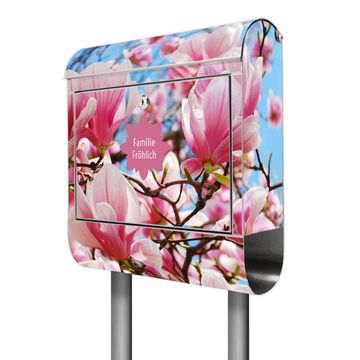 Der banjado Edelstahl Standbriefkasten mit Motiv Magnolienbaum und eigenem Wunschtext bietet Ihnen mit seinem Fassungsvermögen genügend Platz auch für große A4 Sendungen. Das integrierte Zeitungsfach eignet sich hervorragend, um unkompliziert die Tageszeitung zu fassen.