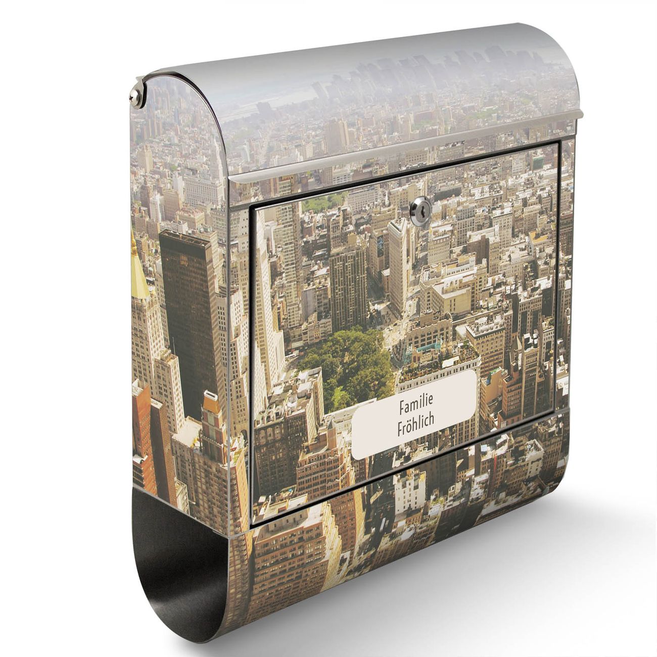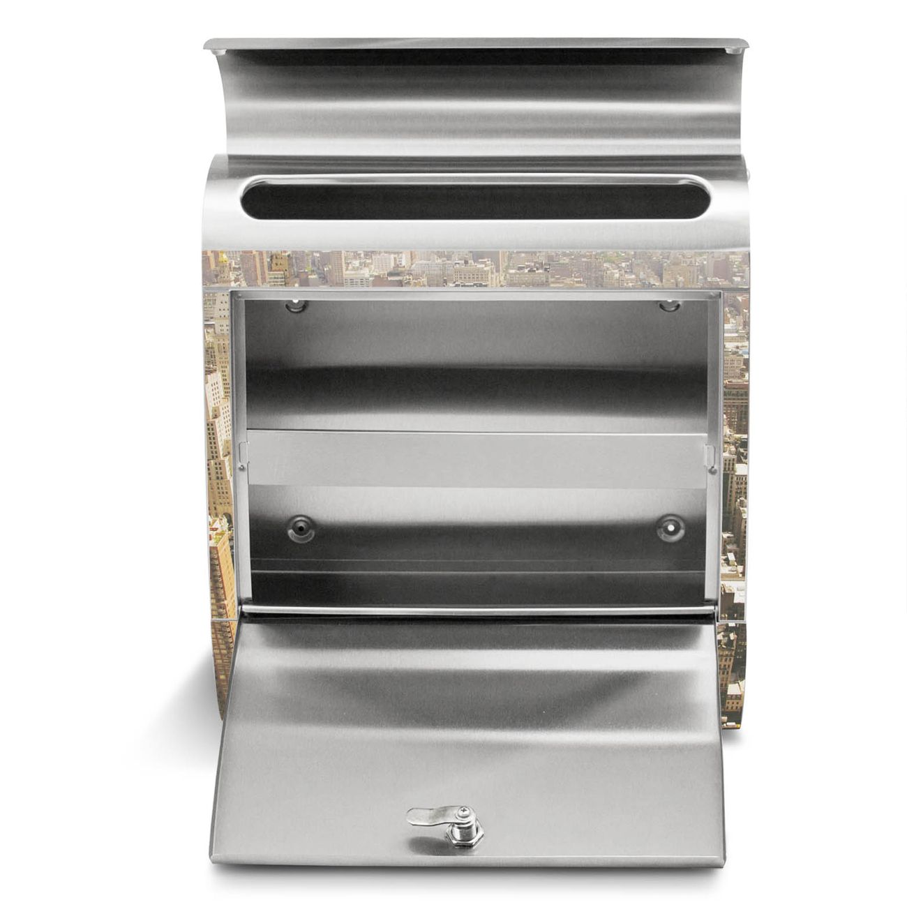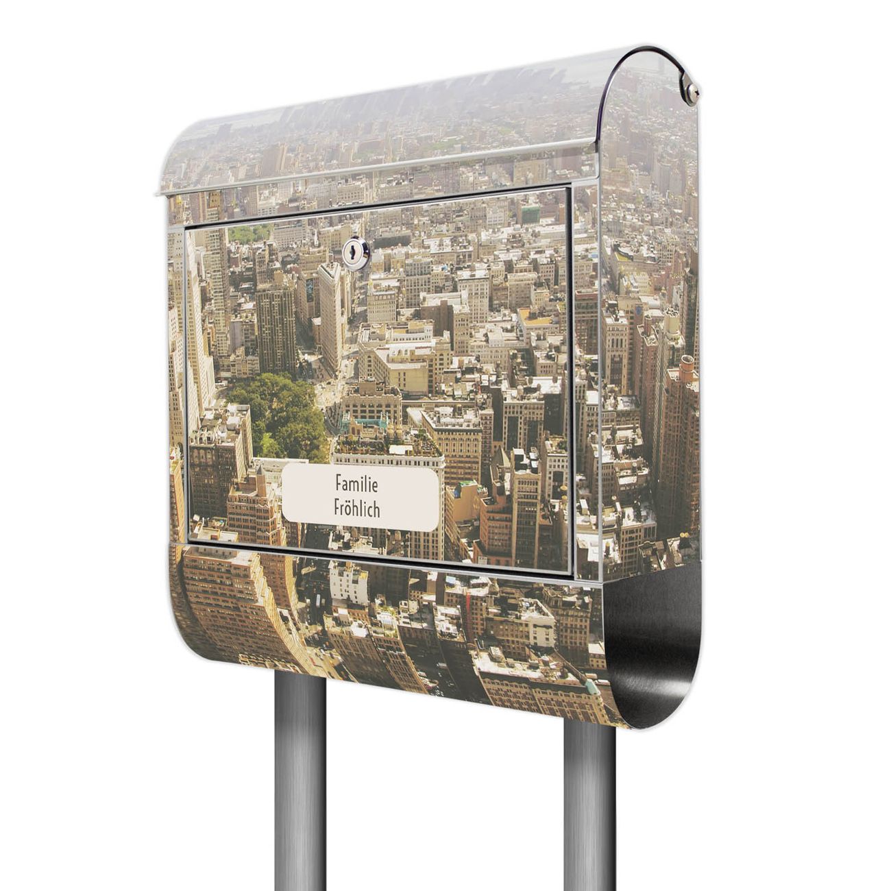 Der banjado Edelstahl Standbriefkasten mit Motiv Manhattan 1 und eigenem Wunschtext bietet Ihnen mit seinem Fassungsvermögen genügend Platz auch für große A4 Sendungen. Das integrierte Zeitungsfach eignet sich hervorragend, um unkompliziert die Tageszeitung zu fassen.
