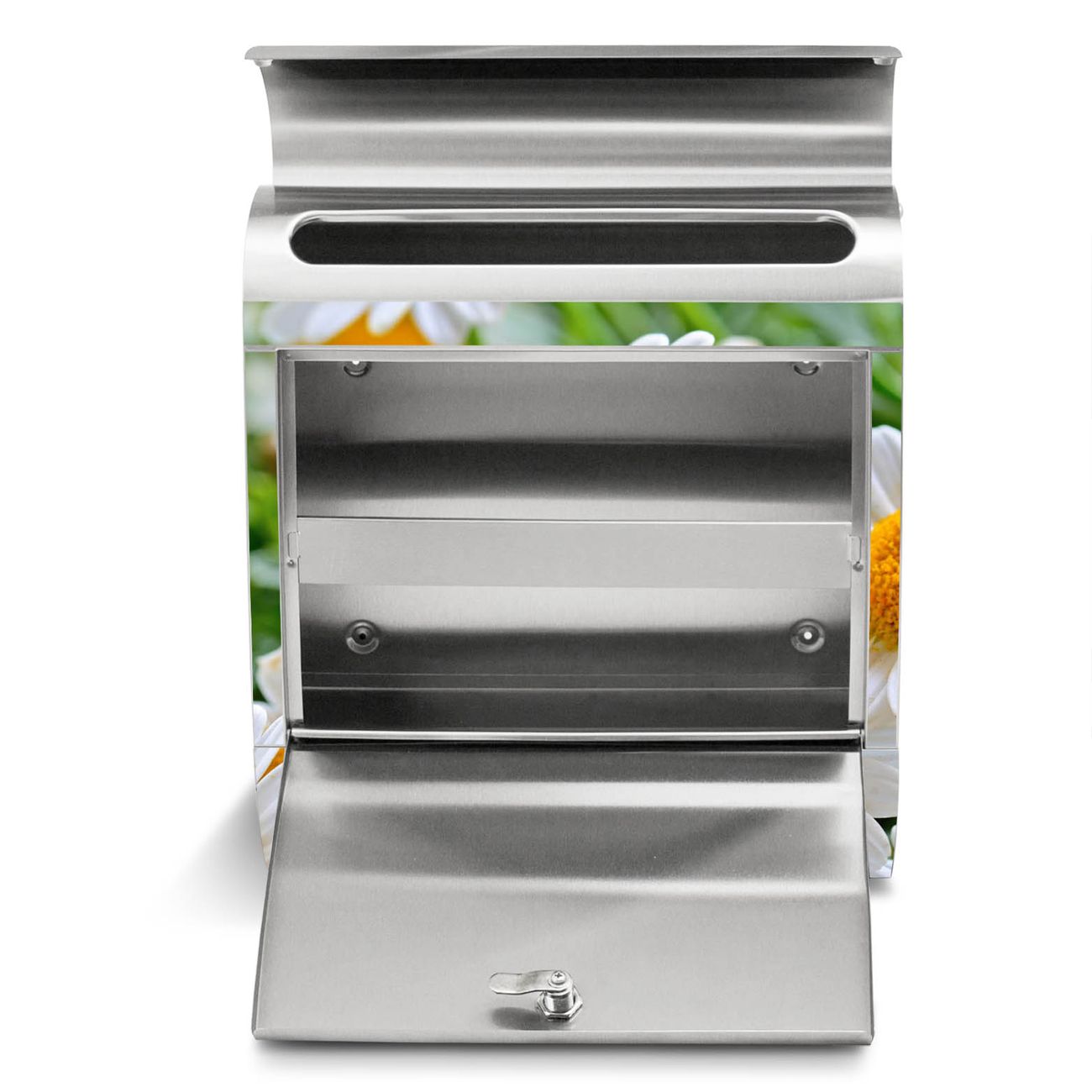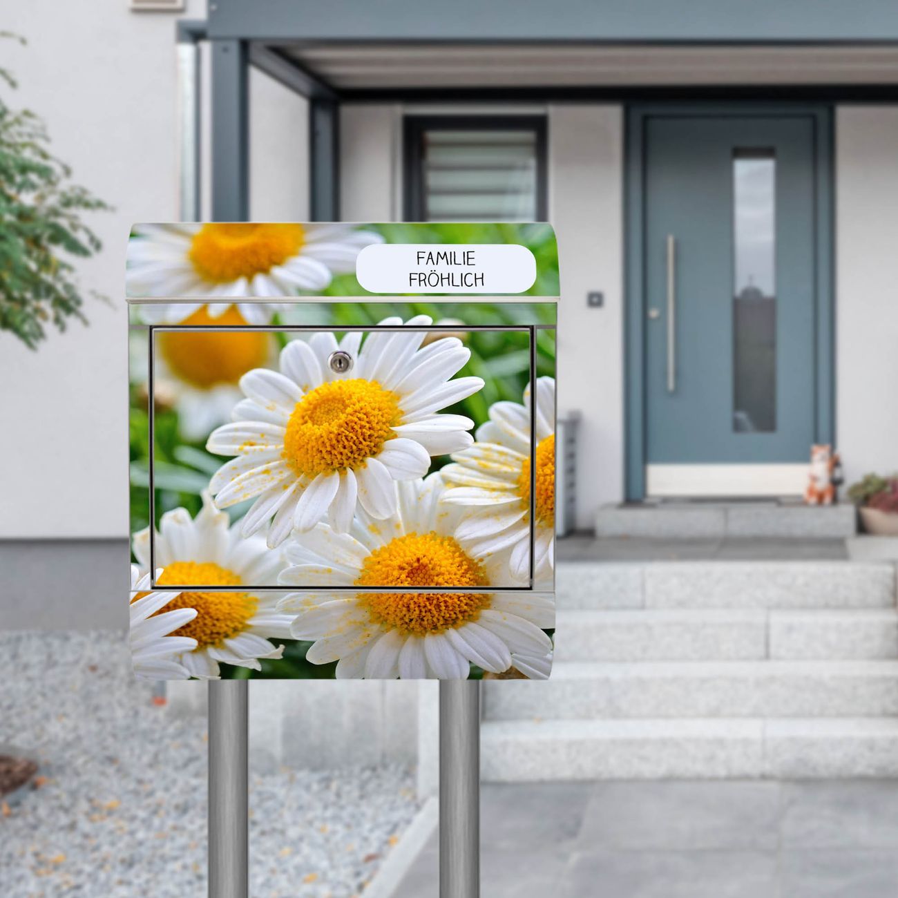 Der banjado Edelstahl Standbriefkasten mit Motiv Margeriten Illustration und eigenem Wunschtext bietet Ihnen mit seinem Fassungsvermögen genügend Platz auch für große A4 Sendungen. Das integrierte Zeitungsfach eignet sich hervorragend, um unkompliziert die Tageszeitung zu fassen.