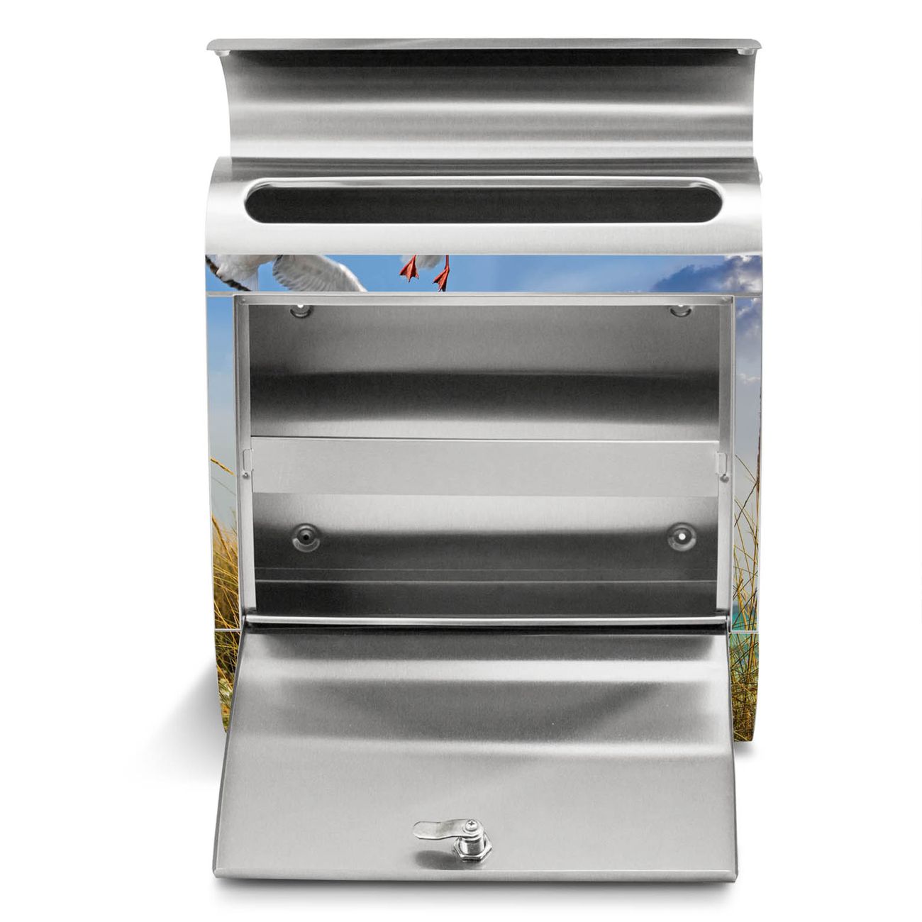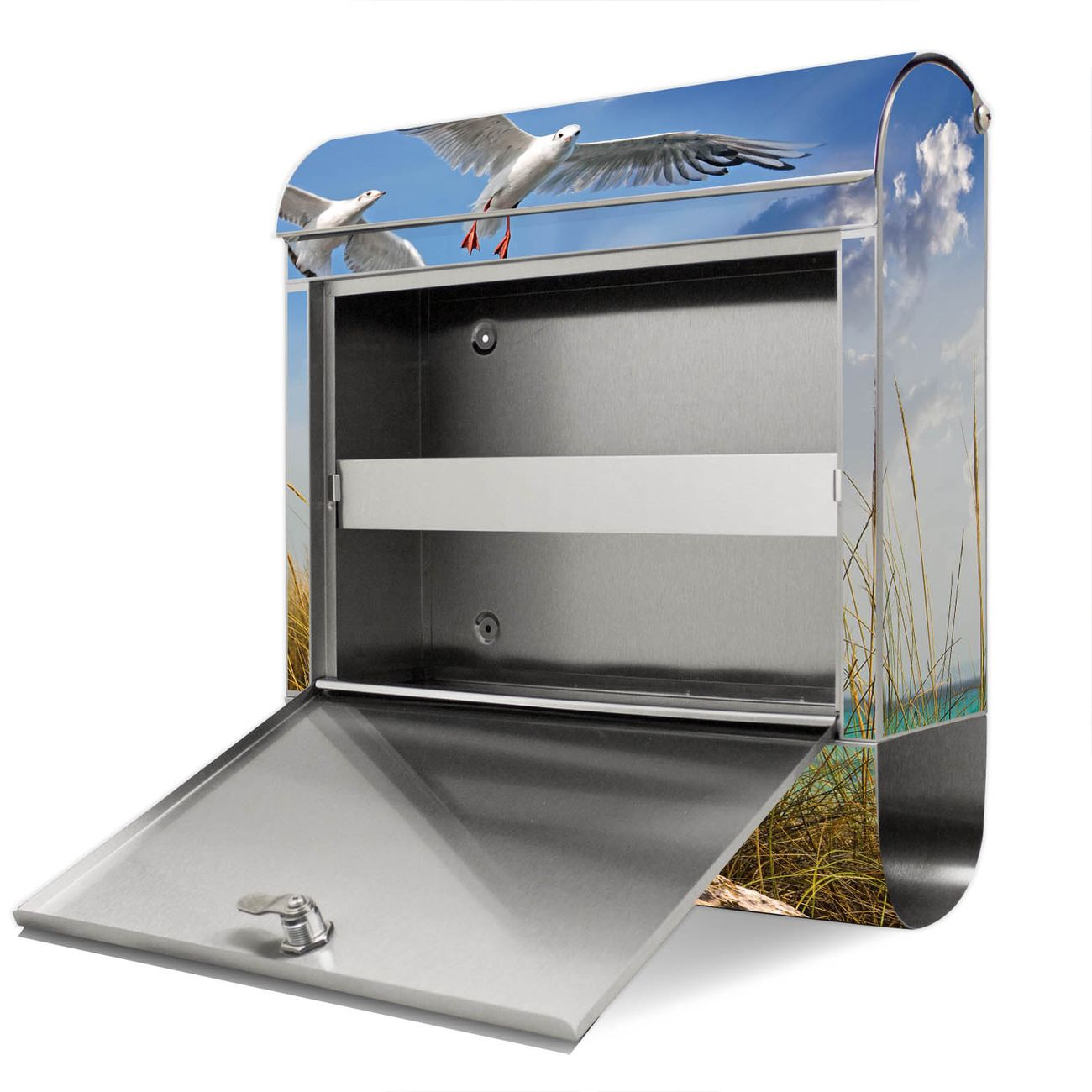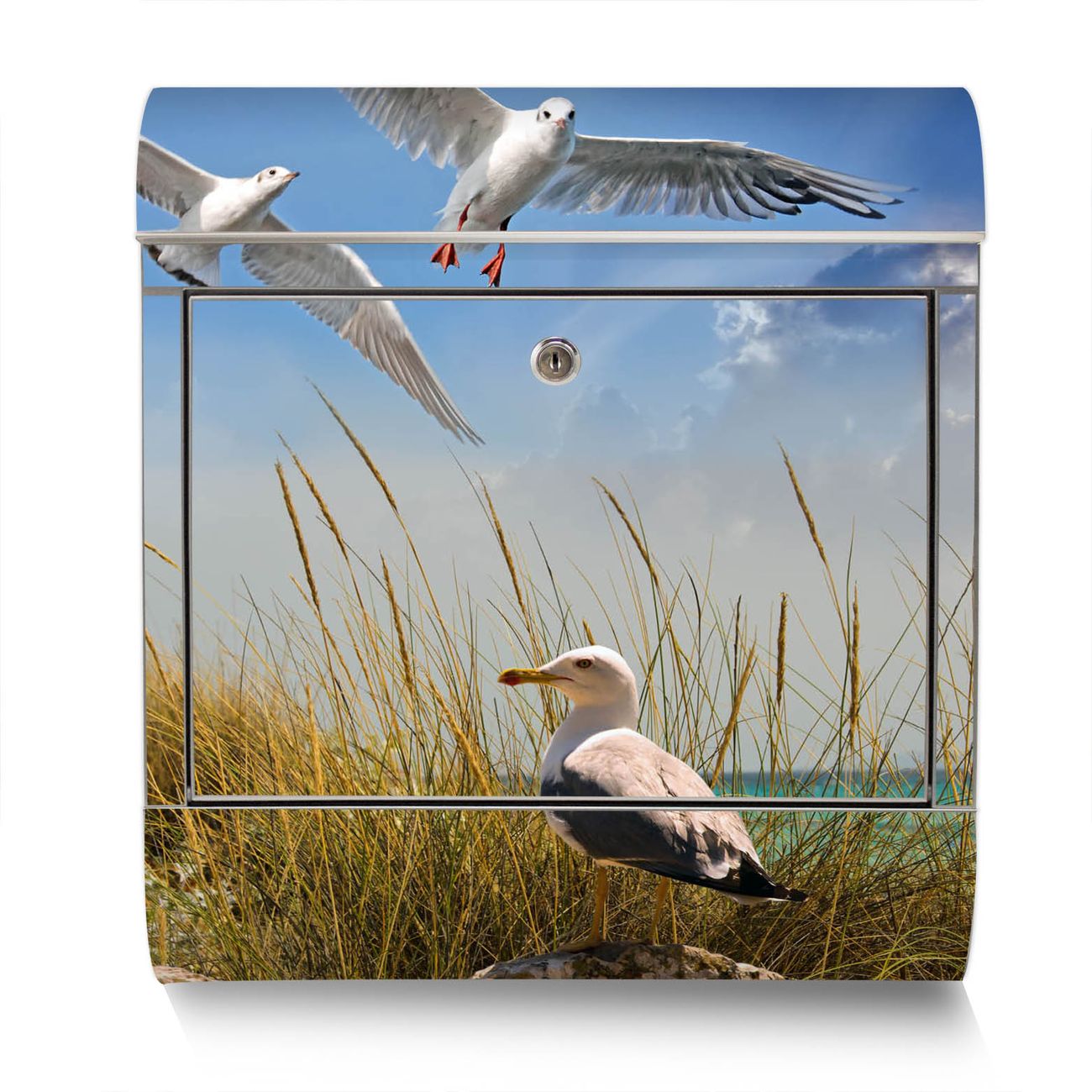 Der Motivstandbriefkasten hat ein sehr ansprechendes und ausgefallenes Design, damit entlocken Sie Ihren Nachbarn und dem Postboten ein Lächeln. Heben Sie Sich ab von der tristen grauen Masse, ohne auf Funktionalität zu verzichten. Der Briefkasten besteht aus hochwertigem 18/0 Edelstahl und die Wetter- und UV-resistenten Folie mit Möwen Motiv ist zusätzlich mit einem Schutzlaminat überzogen. Der Standbriefkasten wird mit Montagematerial und zwei Schlüsseln geliefert.