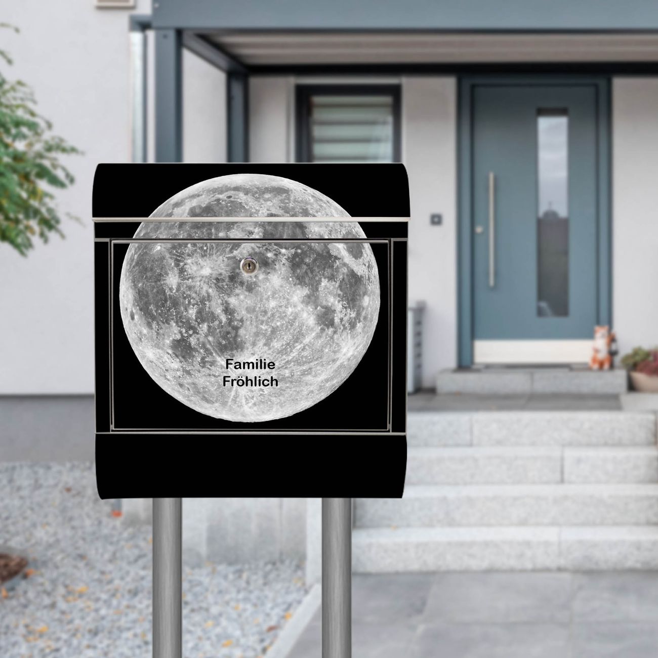 Der Motivstandbriefkasten hat ein sehr ansprechendes und ausgefallenes Design, damit entlocken Sie Ihren Nachbarn und dem Postboten ein Lächeln. Heben Sie Sich ab von der tristen grauen Masse, ohne auf Funktionalität zu verzichten. Der Briefkasten besteht aus hochwertigem 18/0 Edelstahl und die Wetter- und UV-resistenten Folie mit Mond Motiv ist zusätzlich mit einem Schutzlaminat überzogen. Der Standbriefkasten wird mit Montagematerial und zwei Schlüsseln geliefert.