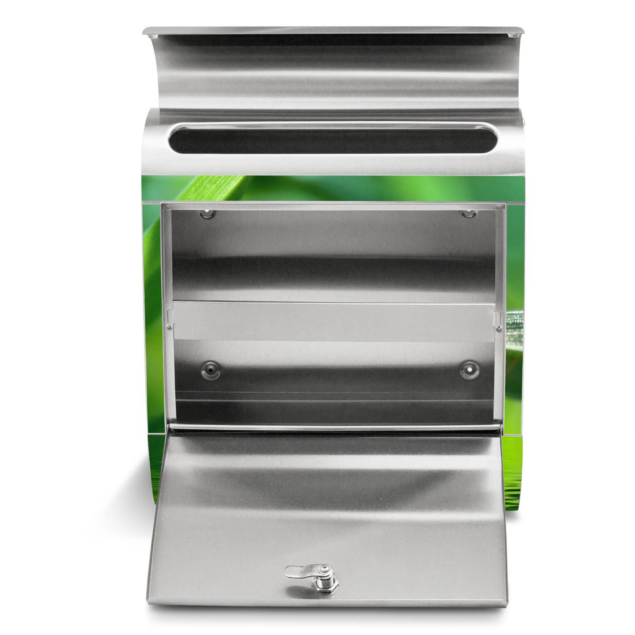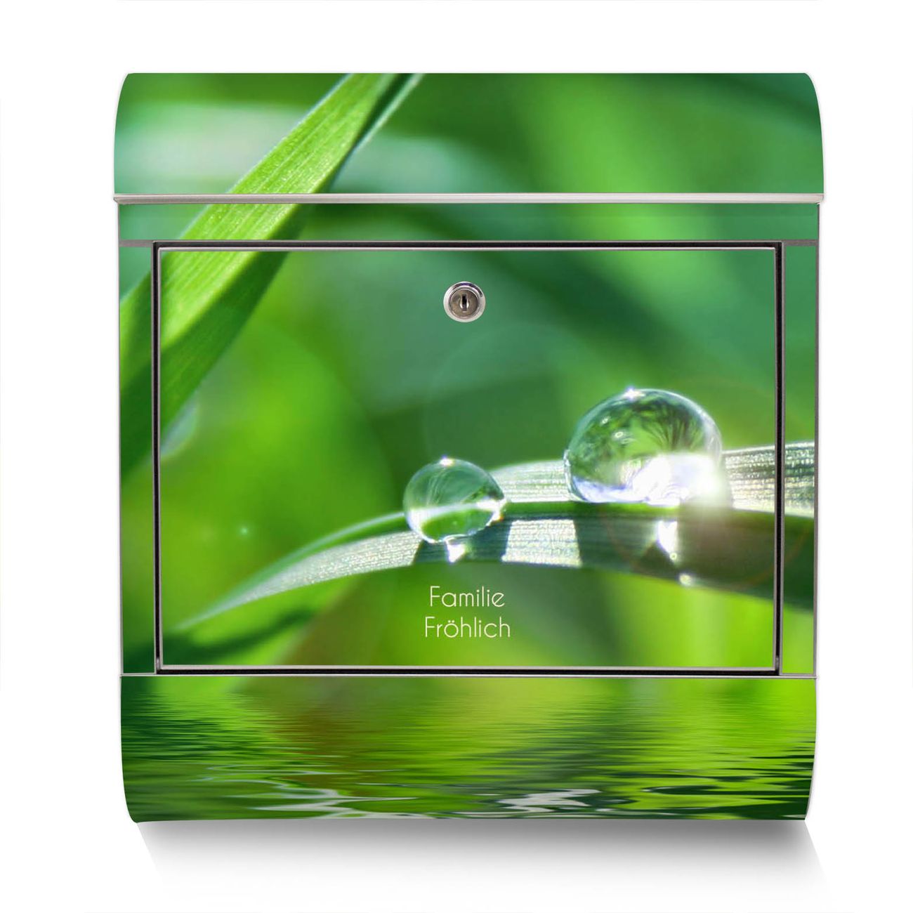 Der banjado Edelstahl Standbriefkasten mit Motiv Morgentau und eigenem Wunschtext bietet Ihnen mit seinem Fassungsvermögen genügend Platz auch für große A4 Sendungen. Das integrierte Zeitungsfach eignet sich hervorragend, um unkompliziert die Tageszeitung zu fassen.