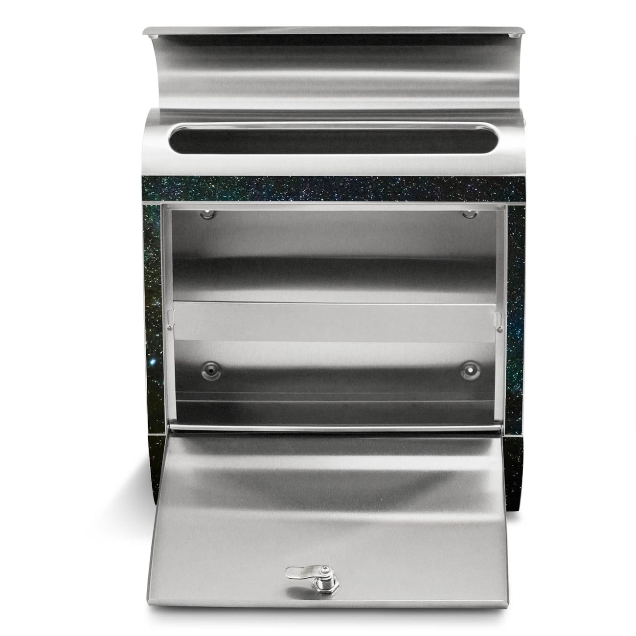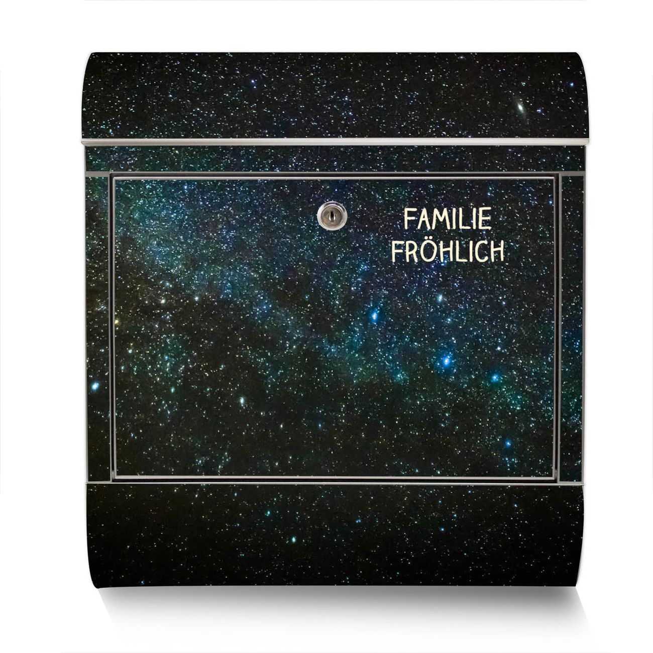 Der banjado Edelstahl Standbriefkasten mit Motiv Nachthimmel und eigenem Wunschtext bietet Ihnen mit seinem Fassungsvermögen genügend Platz auch für große A4 Sendungen. Das integrierte Zeitungsfach eignet sich hervorragend, um unkompliziert die Tageszeitung zu fassen.