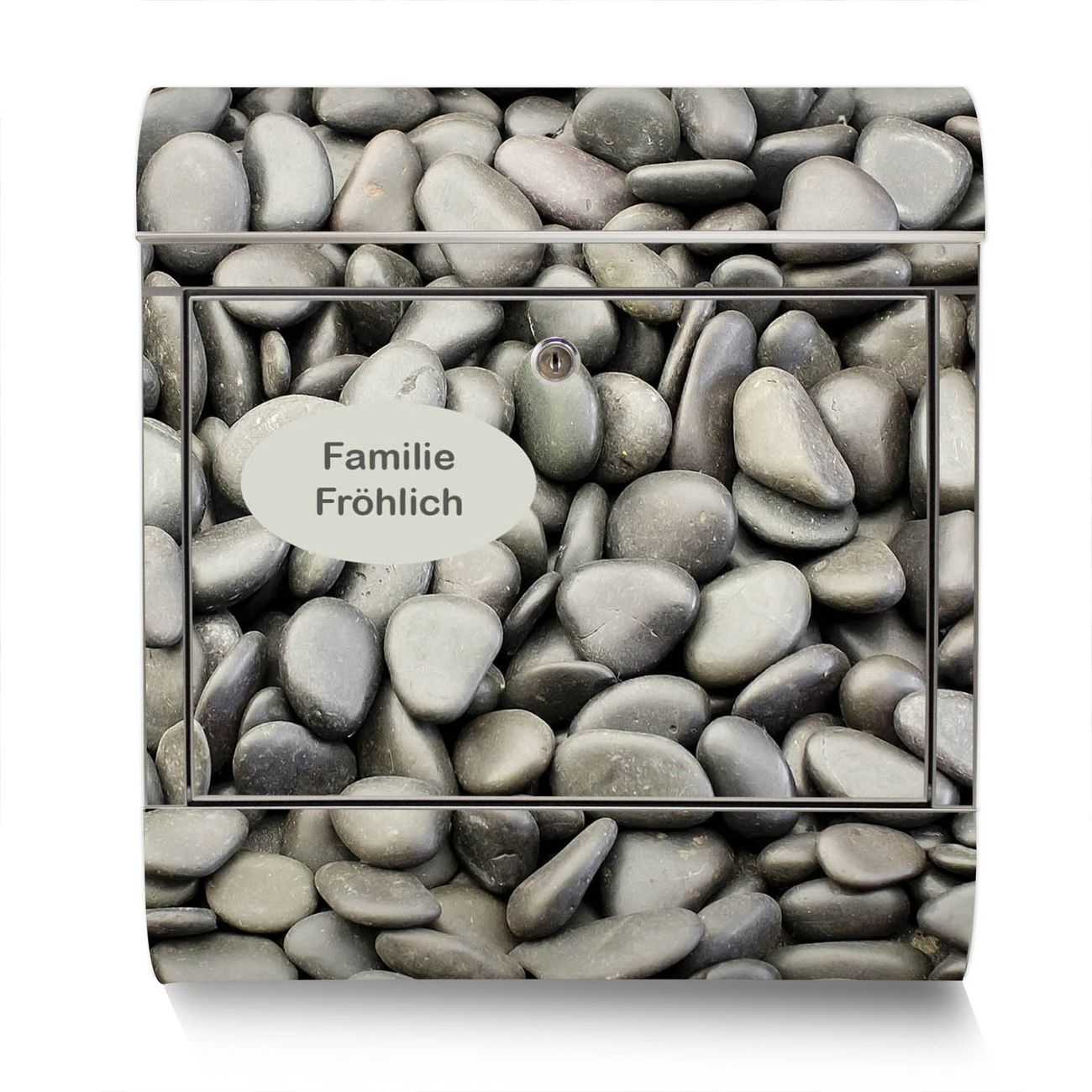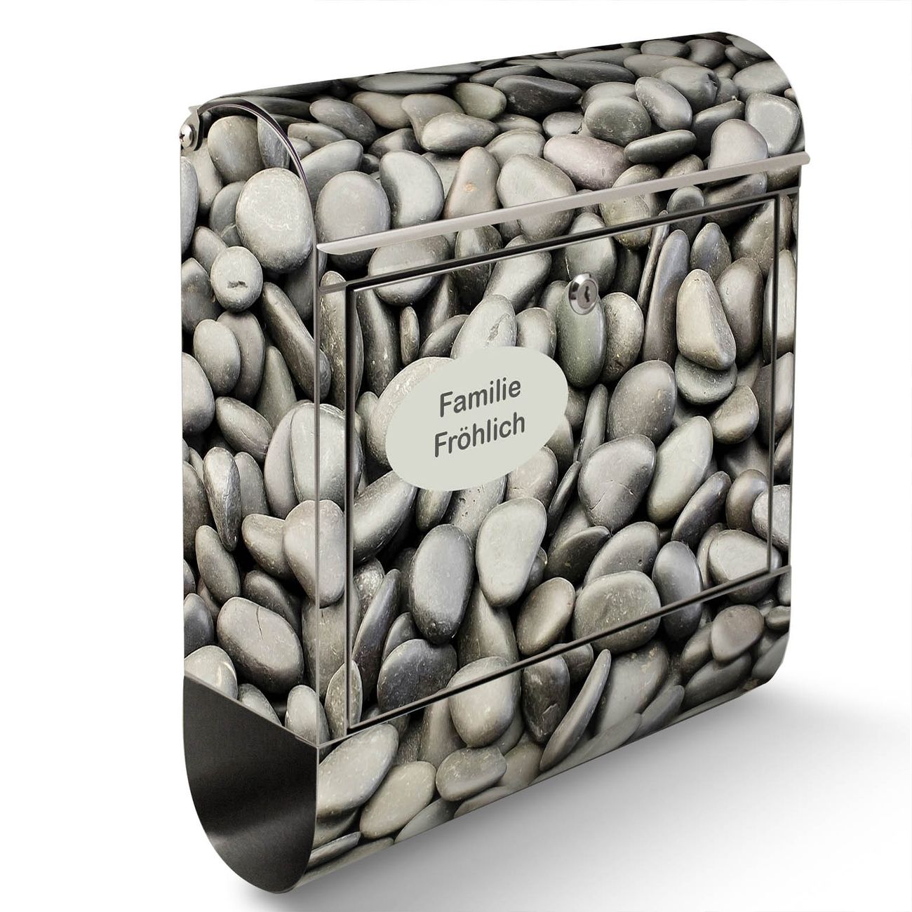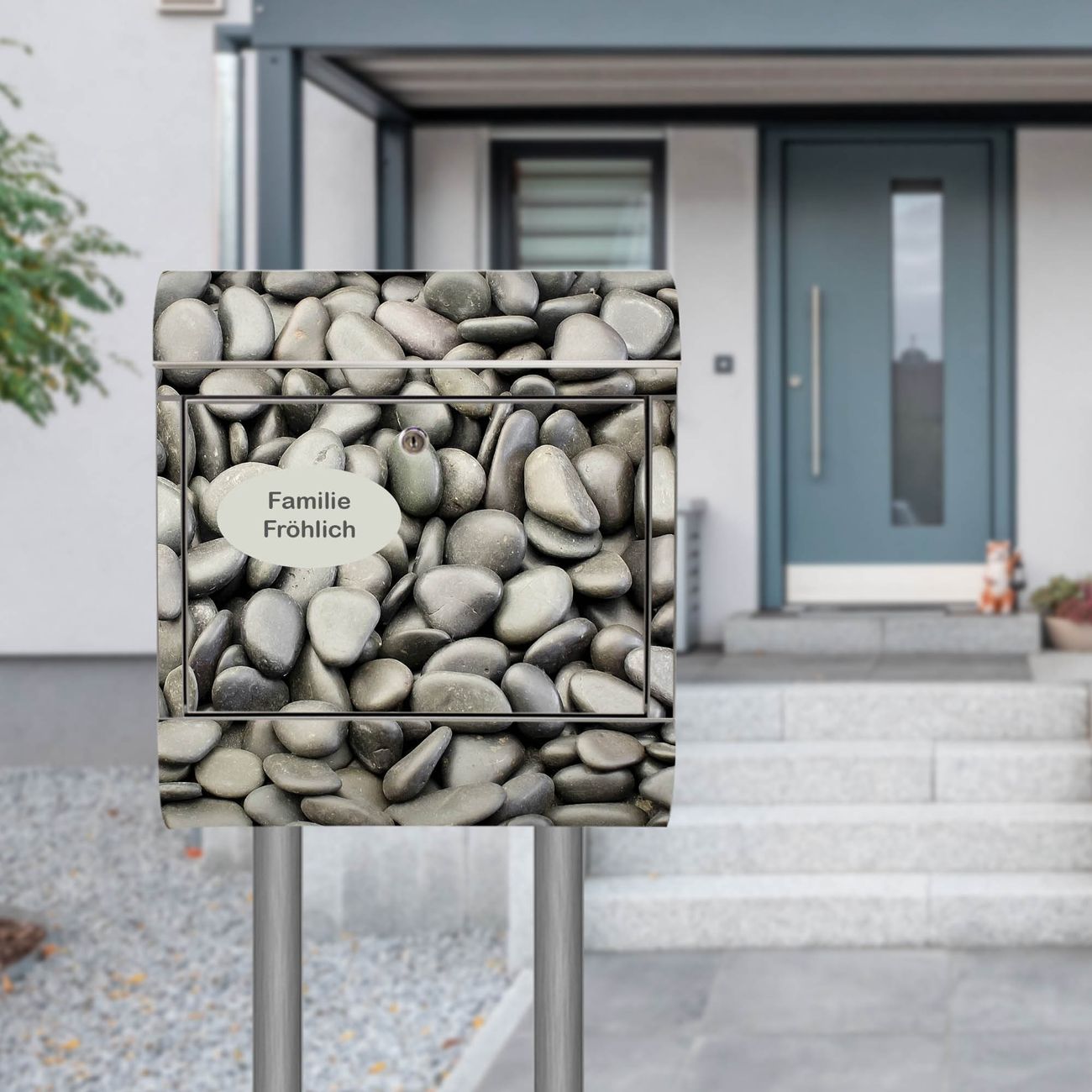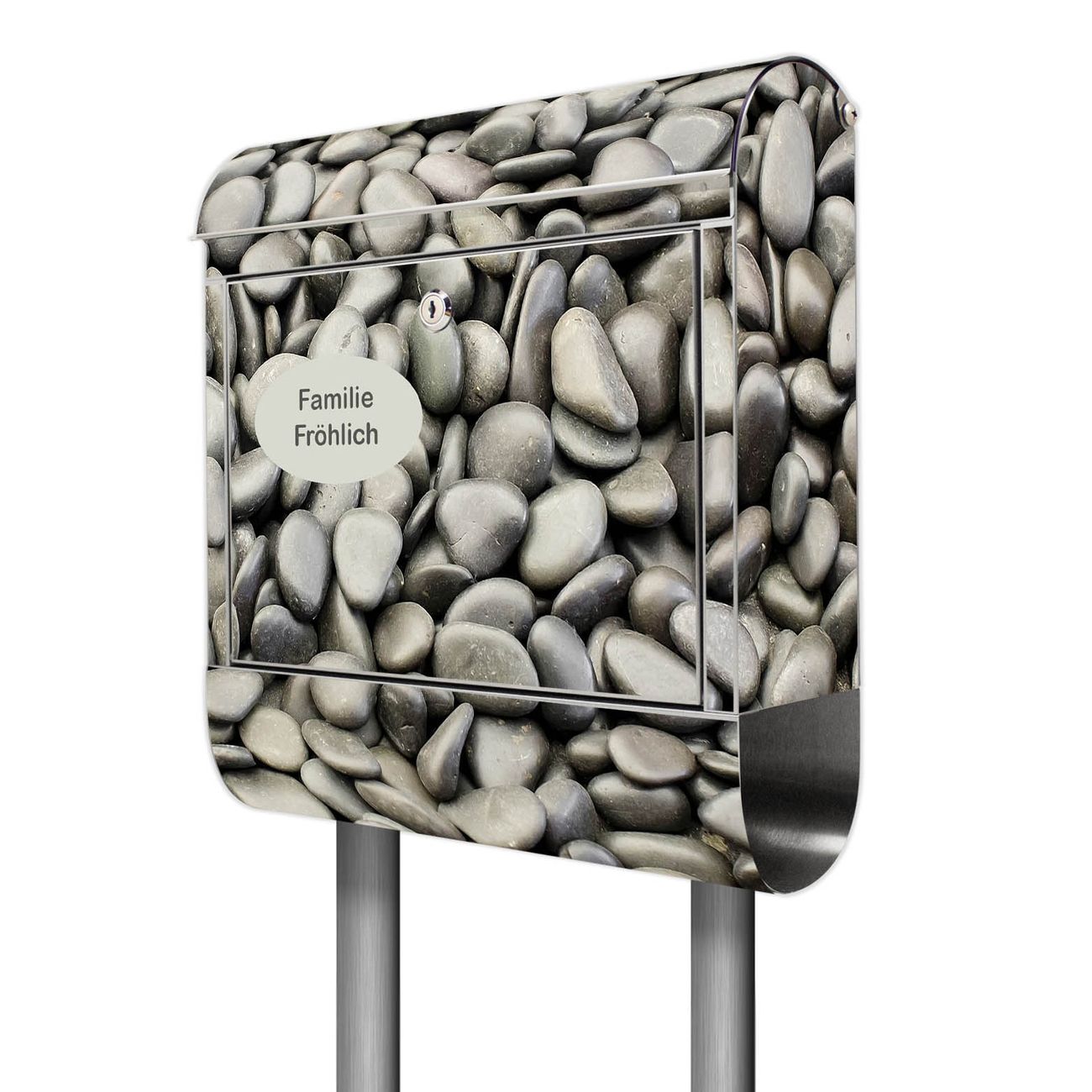 Der banjado Edelstahl Standbriefkasten mit Motiv Nasse Kiesel und eigenem Wunschtext bietet Ihnen mit seinem Fassungsvermögen genügend Platz auch für große A4 Sendungen. Das integrierte Zeitungsfach eignet sich hervorragend, um unkompliziert die Tageszeitung zu fassen.