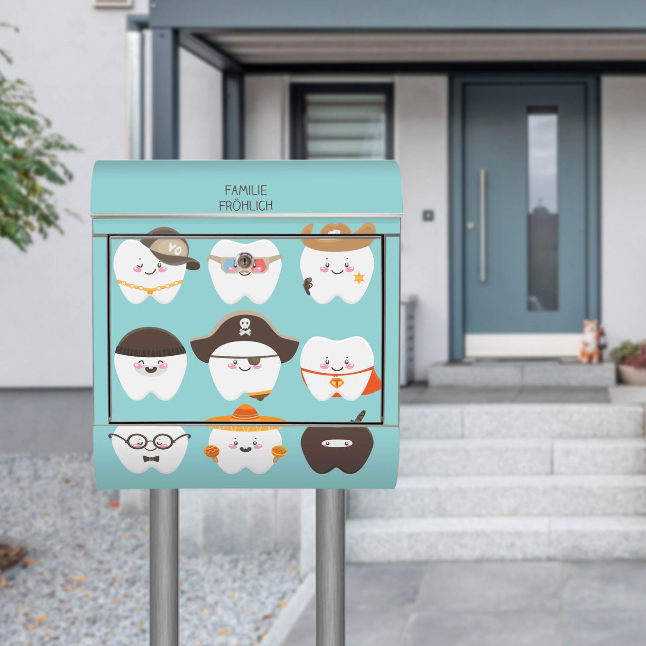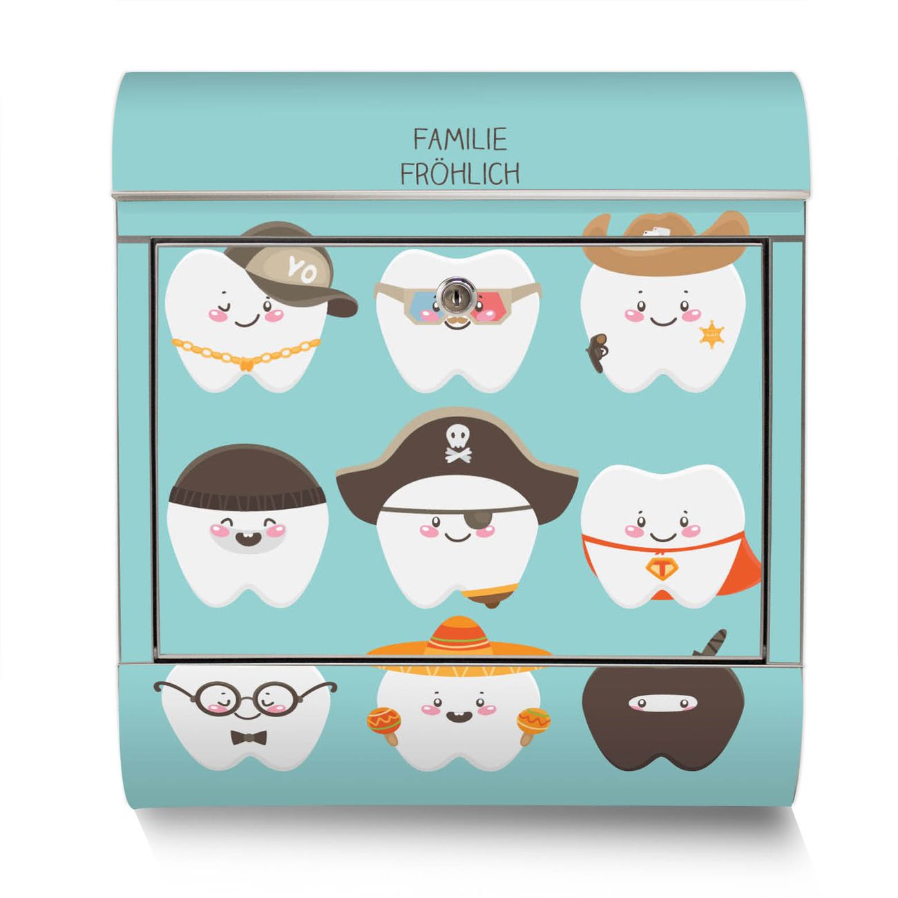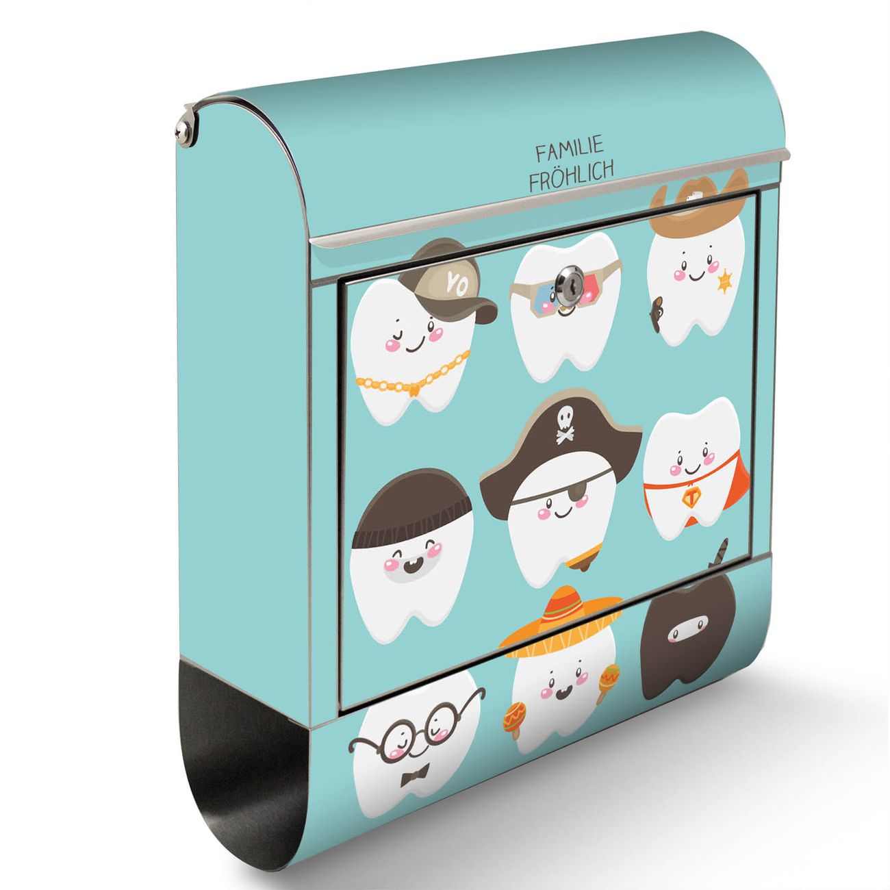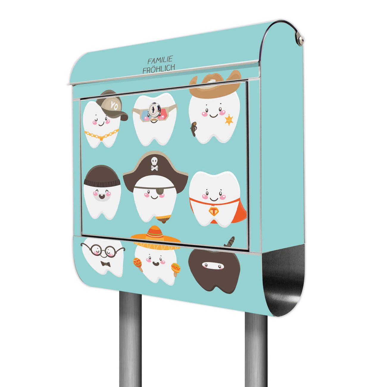 Der Motivstandbriefkasten hat ein sehr ansprechendes und ausgefallenes Design, damit entlocken Sie Ihren Nachbarn und dem Postboten ein Lächeln. Heben Sie Sich ab von der tristen grauen Masse, ohne auf Funktionalität zu verzichten. Der Briefkasten besteht aus hochwertigem 18/0 Edelstahl und die Wetter- und UV-resistenten Folie mit Neun Zähne Motiv ist zusätzlich mit einem Schutzlaminat überzogen. Der Standbriefkasten wird mit Montagematerial und zwei Schlüsseln geliefert.