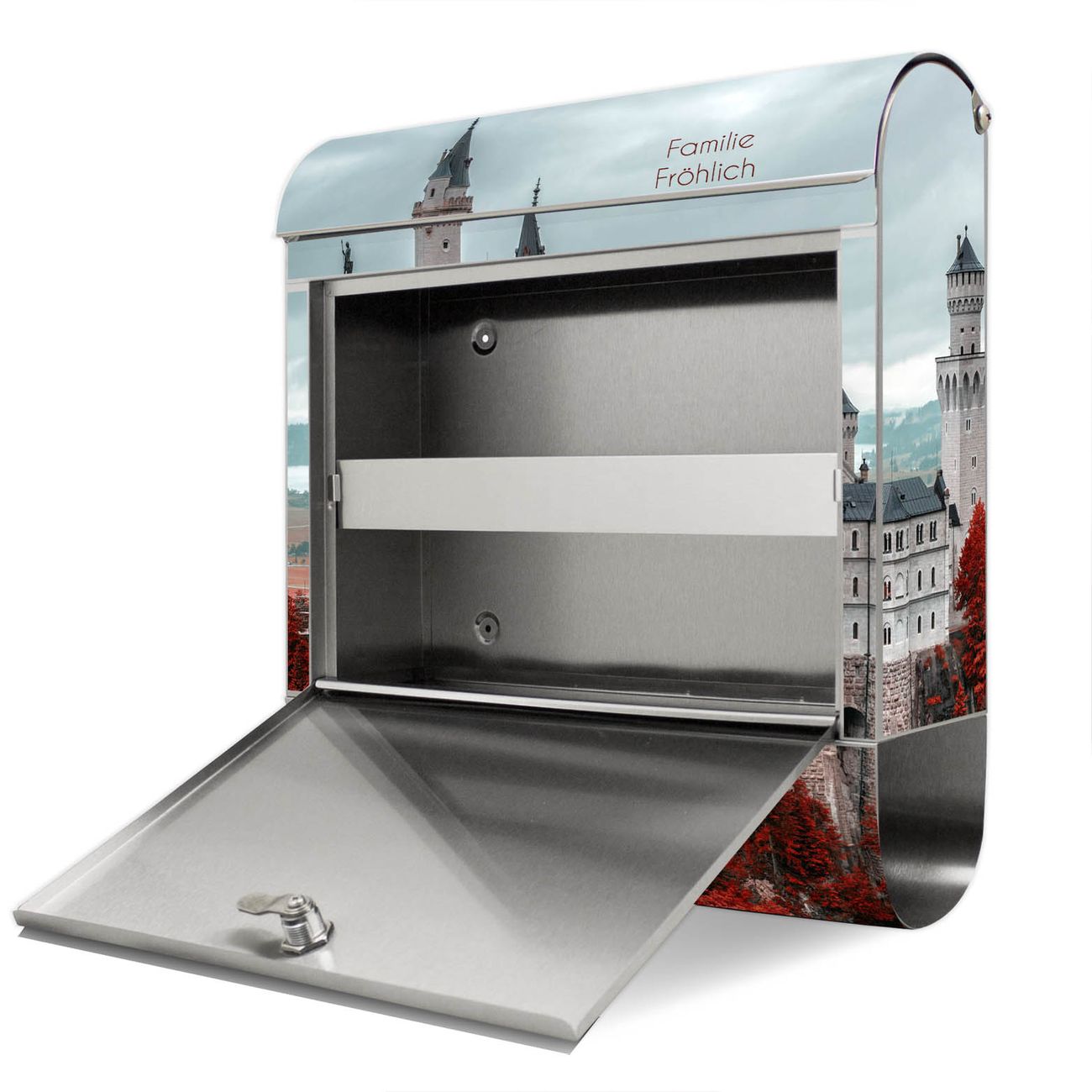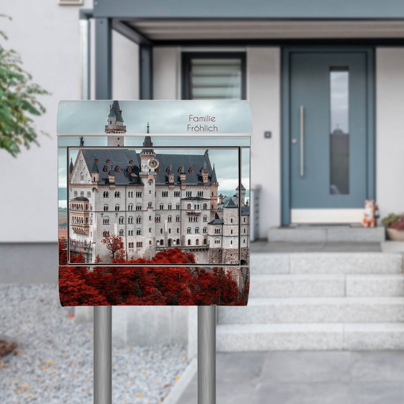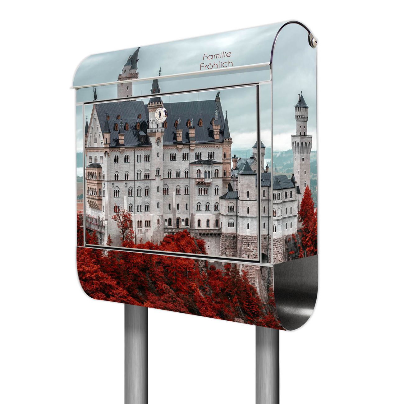 Der banjado Edelstahl Standbriefkasten mit Motiv Neuschwanstein und eigenem Wunschtext bietet Ihnen mit seinem Fassungsvermögen genügend Platz auch für große A4 Sendungen. Das integrierte Zeitungsfach eignet sich hervorragend, um unkompliziert die Tageszeitung zu fassen.