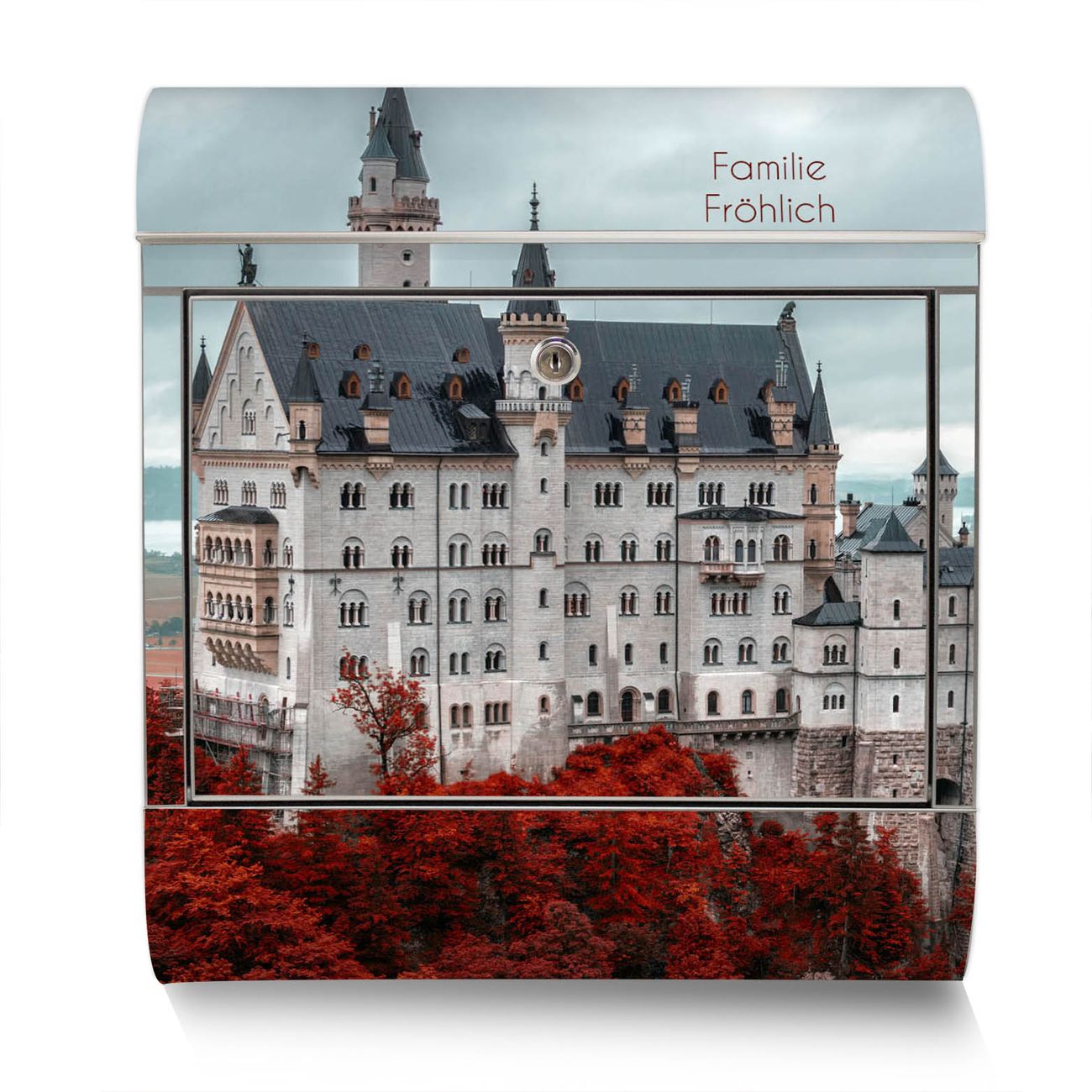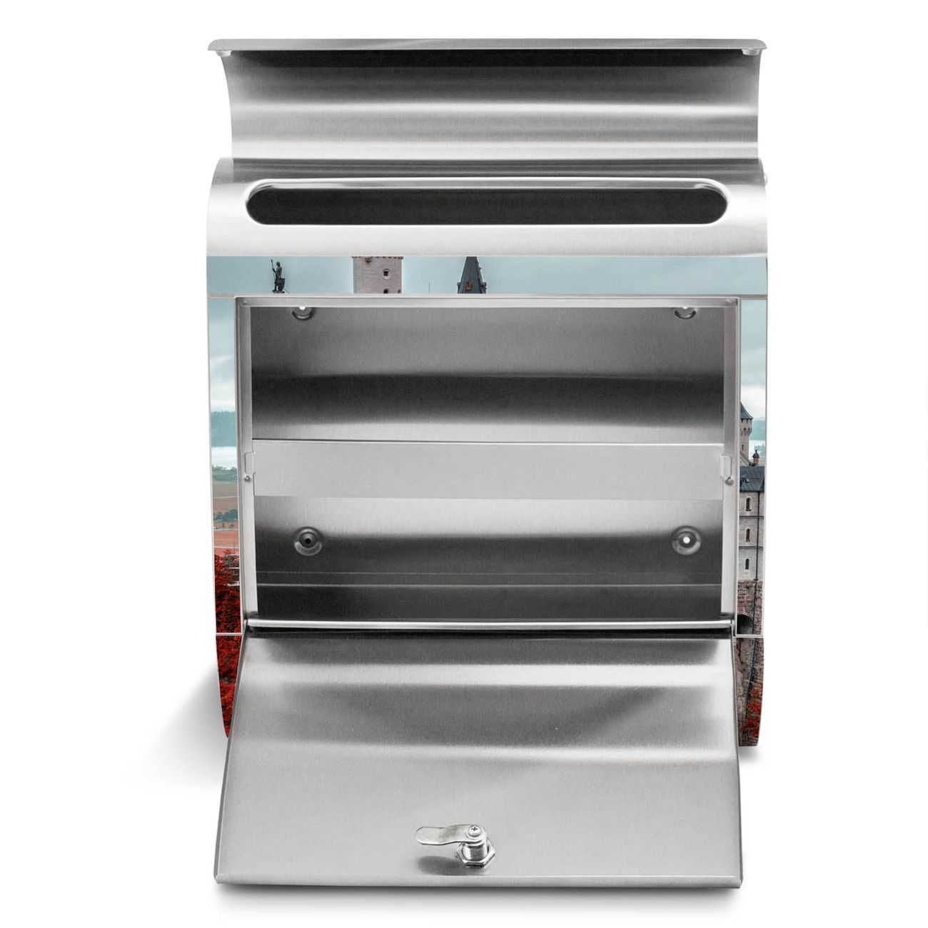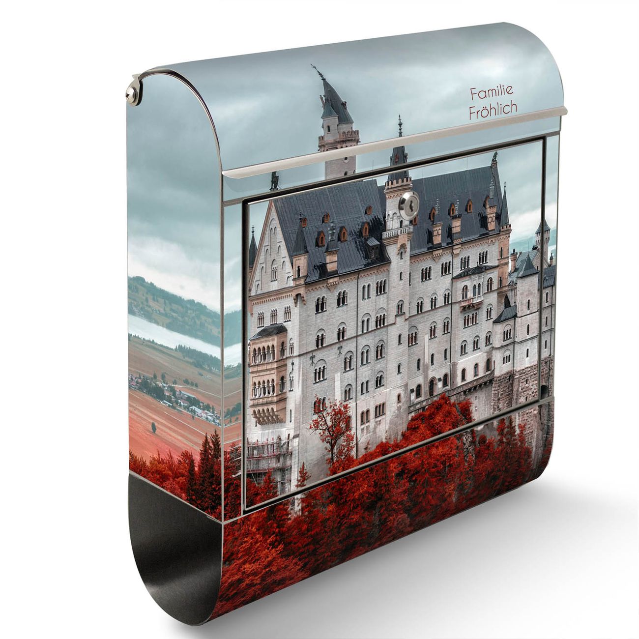 Der banjado Edelstahl Standbriefkasten mit Motiv Neuschwanstein und eigenem Wunschtext bietet Ihnen mit seinem Fassungsvermögen genügend Platz auch für große A4 Sendungen. Das integrierte Zeitungsfach eignet sich hervorragend, um unkompliziert die Tageszeitung zu fassen.