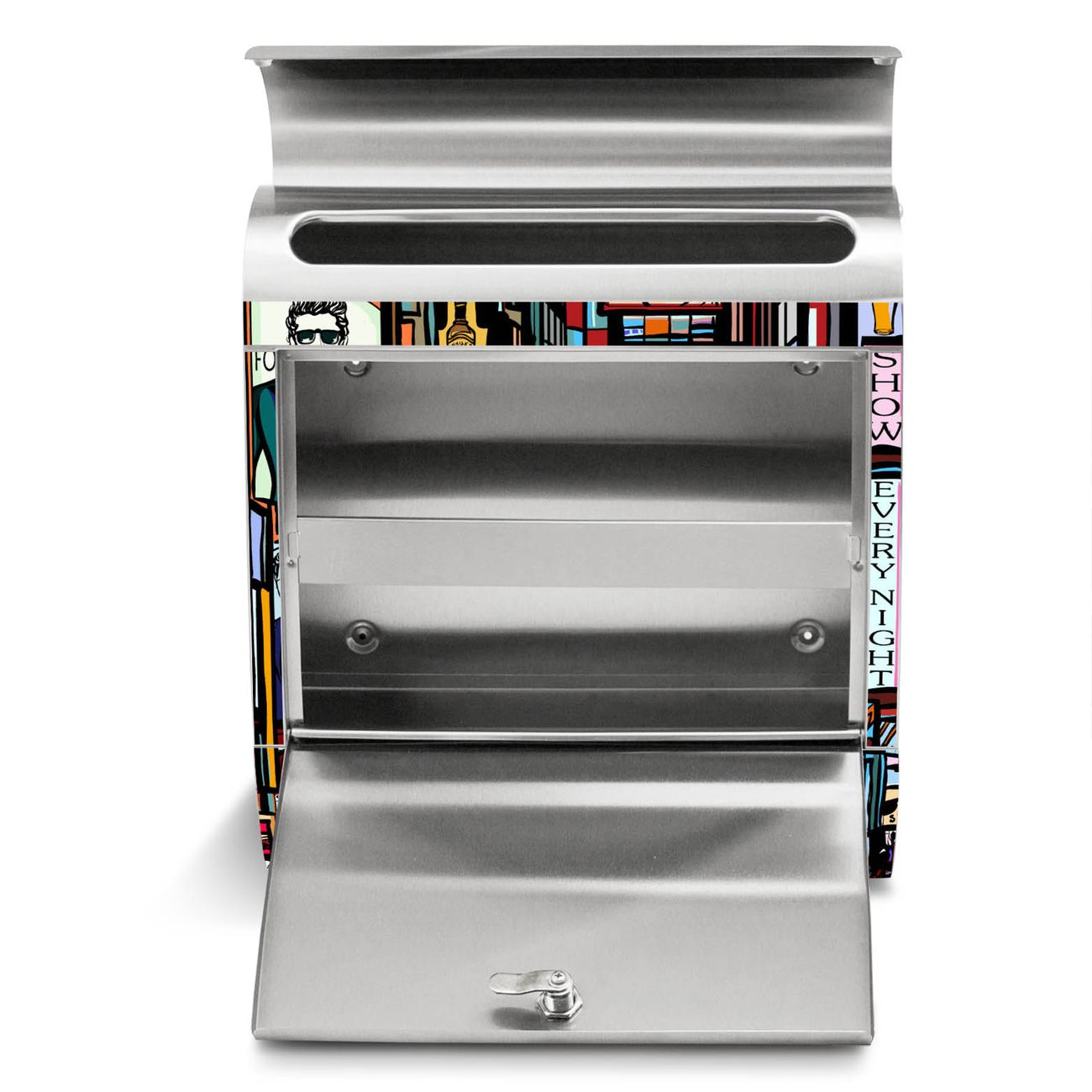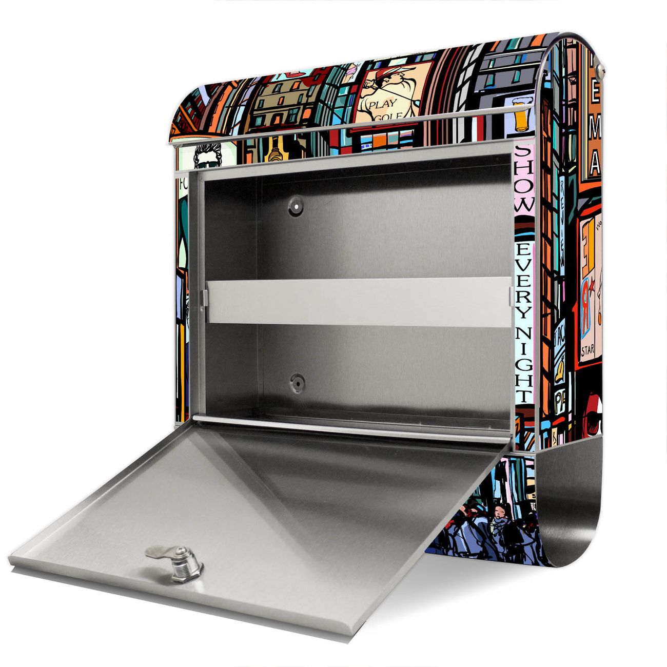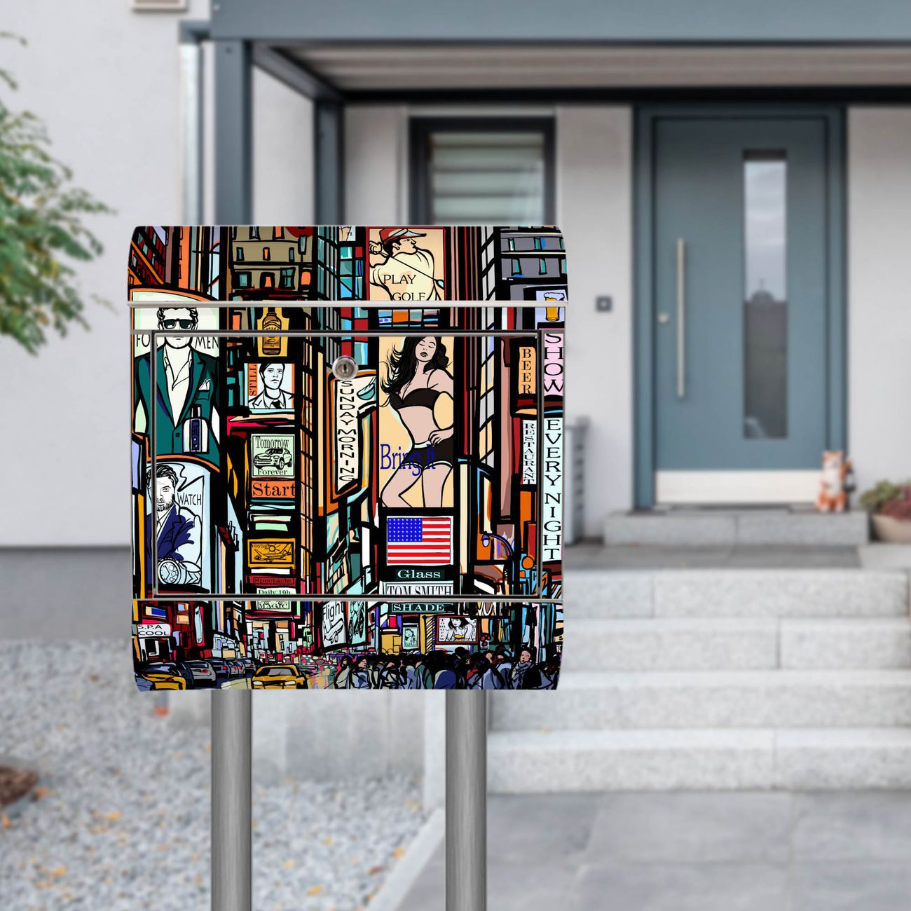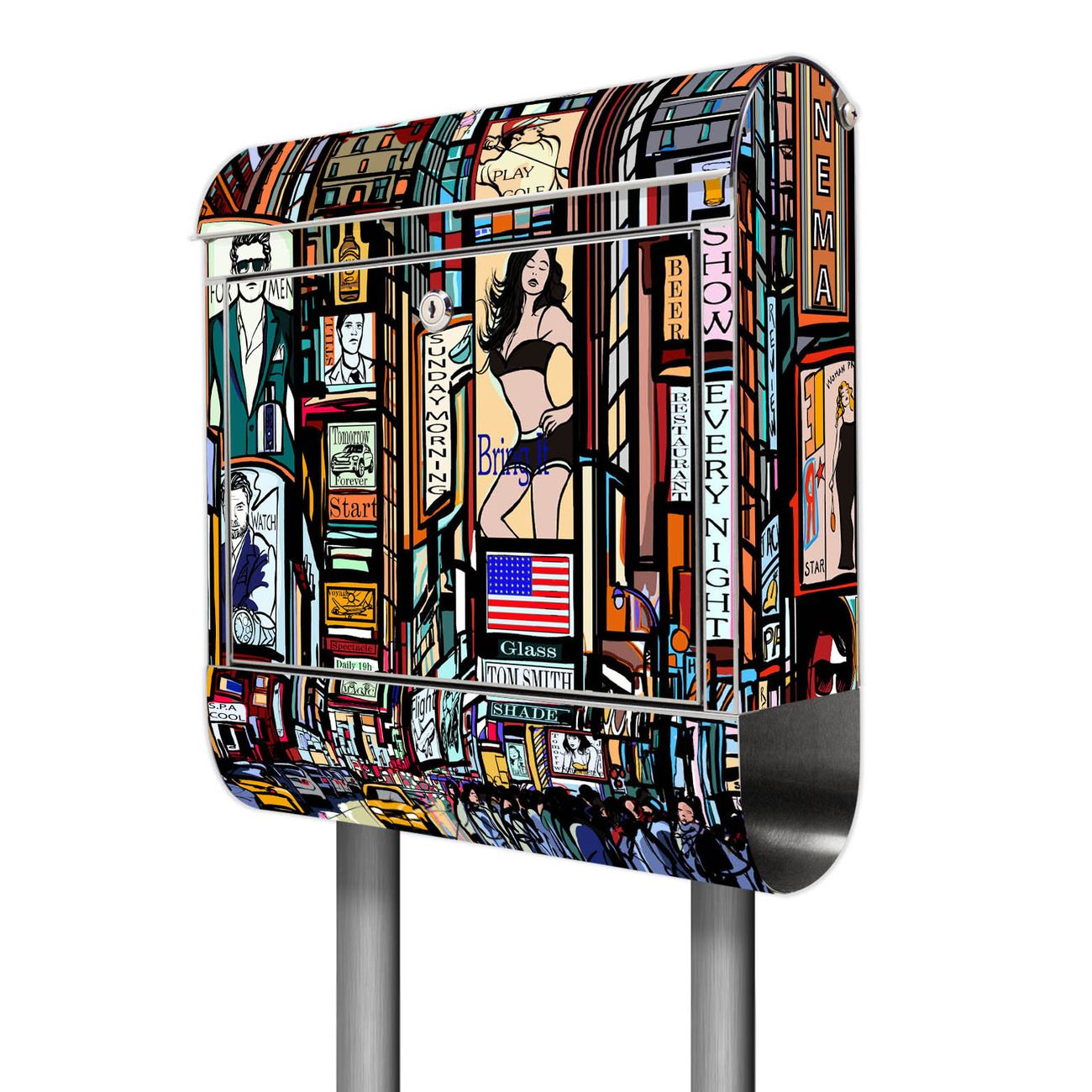 Der Motivstandbriefkasten hat ein sehr ansprechendes und ausgefallenes Design, damit entlocken Sie Ihren Nachbarn und dem Postboten ein Lächeln. Heben Sie Sich ab von der tristen grauen Masse, ohne auf Funktionalität zu verzichten. Der Briefkasten besteht aus hochwertigem 18/0 Edelstahl und die Wetter- und UV-resistenten Folie mit New York Show Motiv ist zusätzlich mit einem Schutzlaminat überzogen. Der Standbriefkasten wird mit Montagematerial und zwei Schlüsseln geliefert.