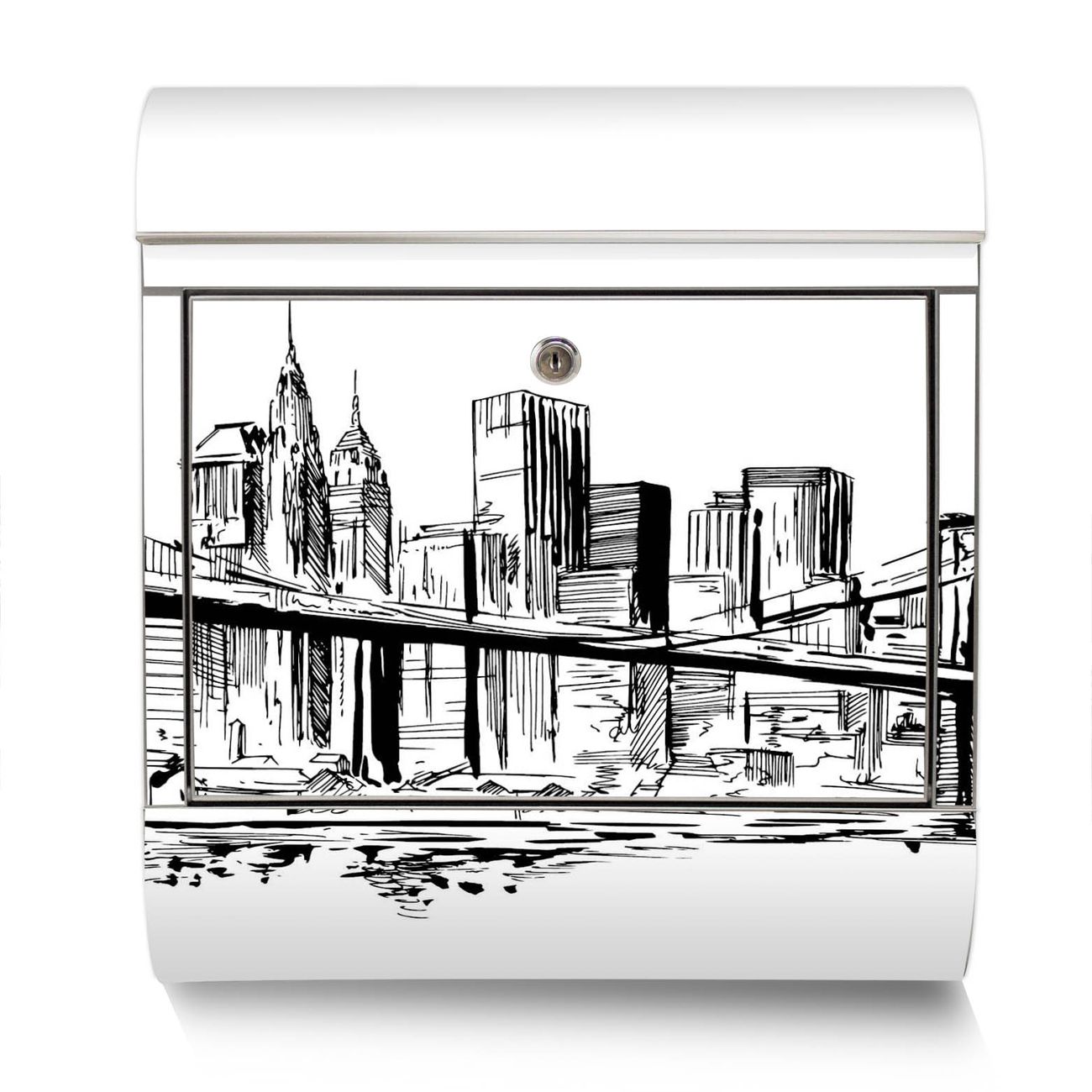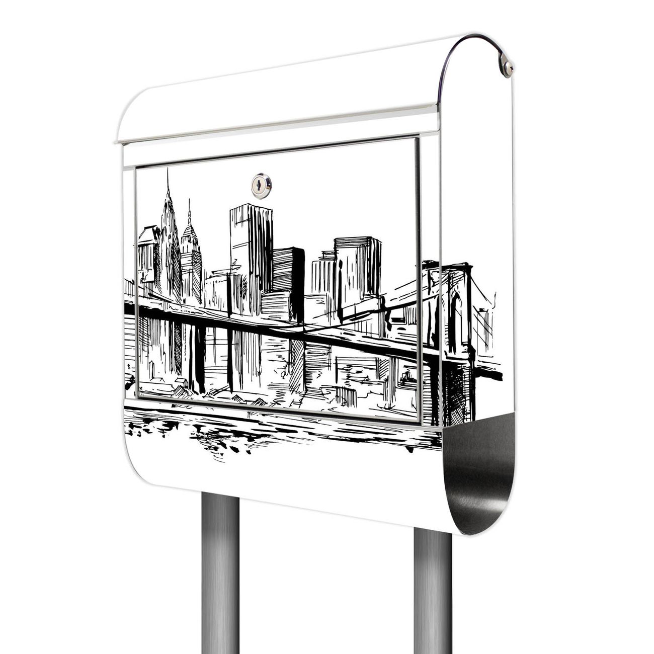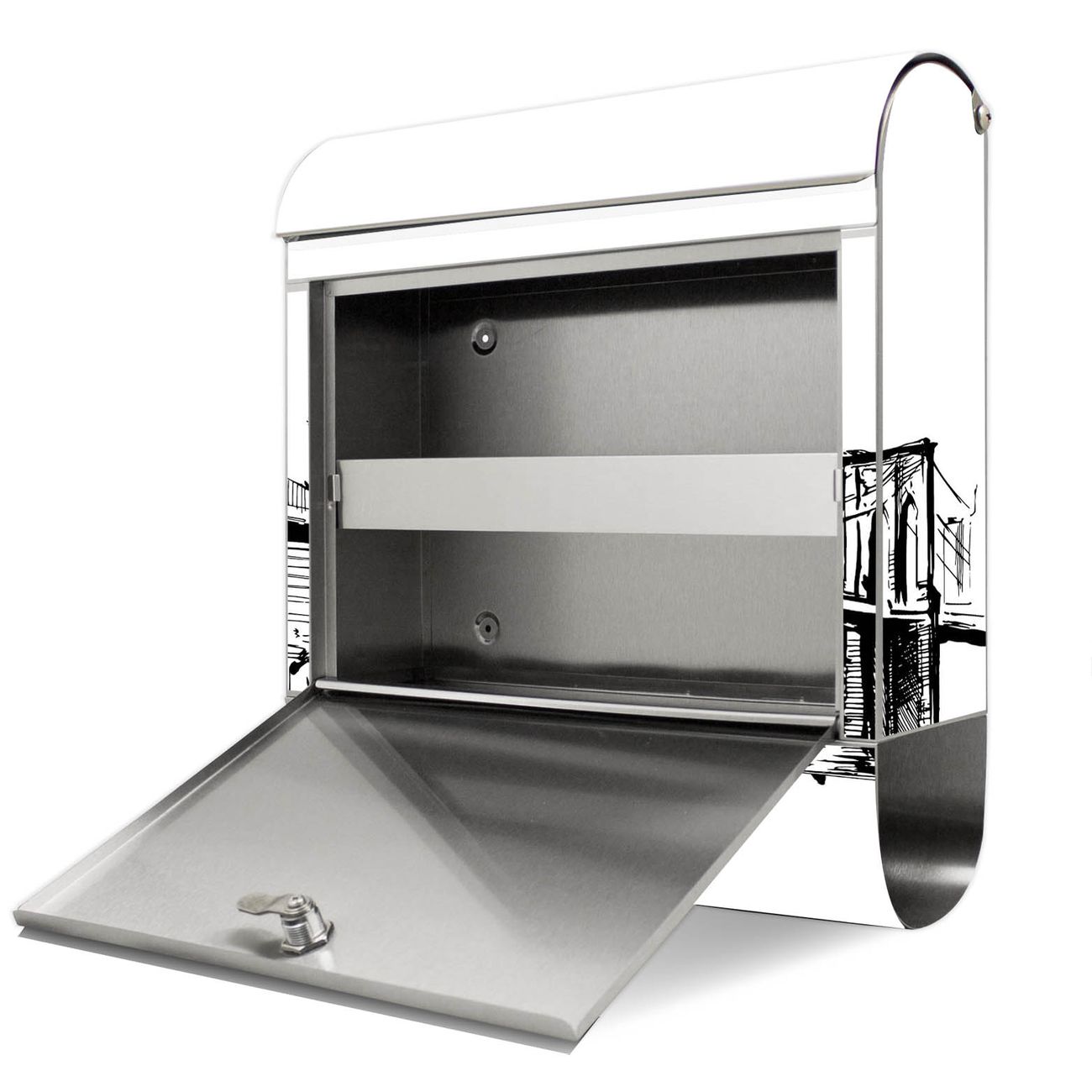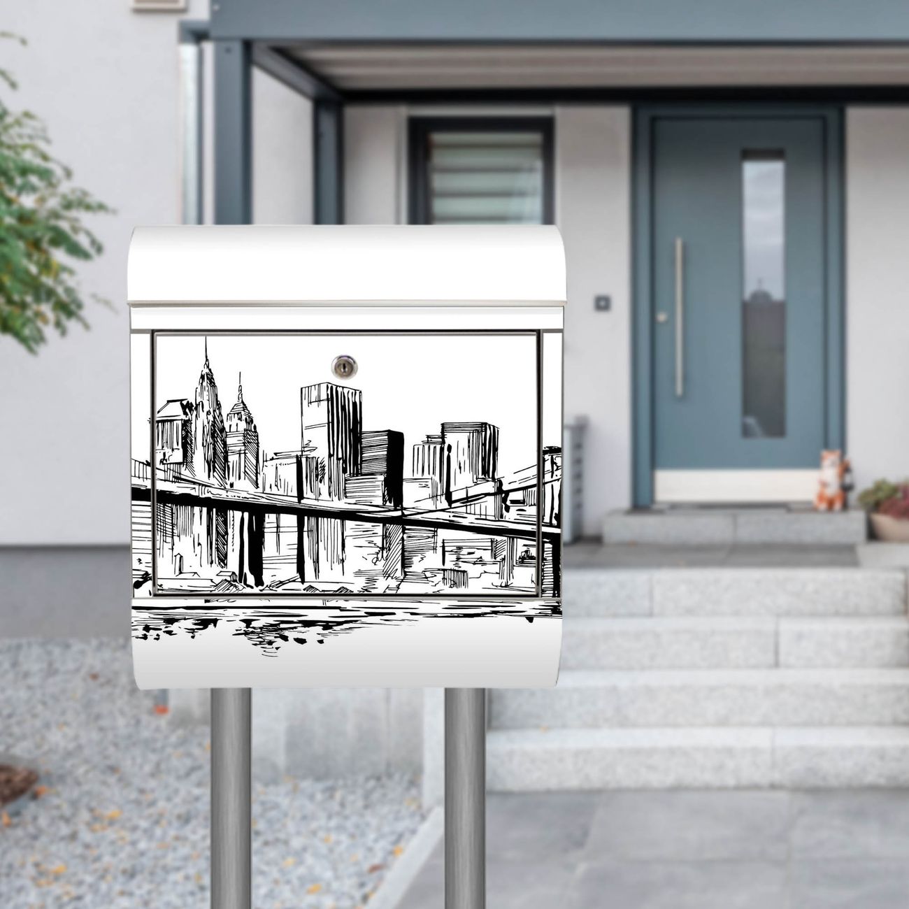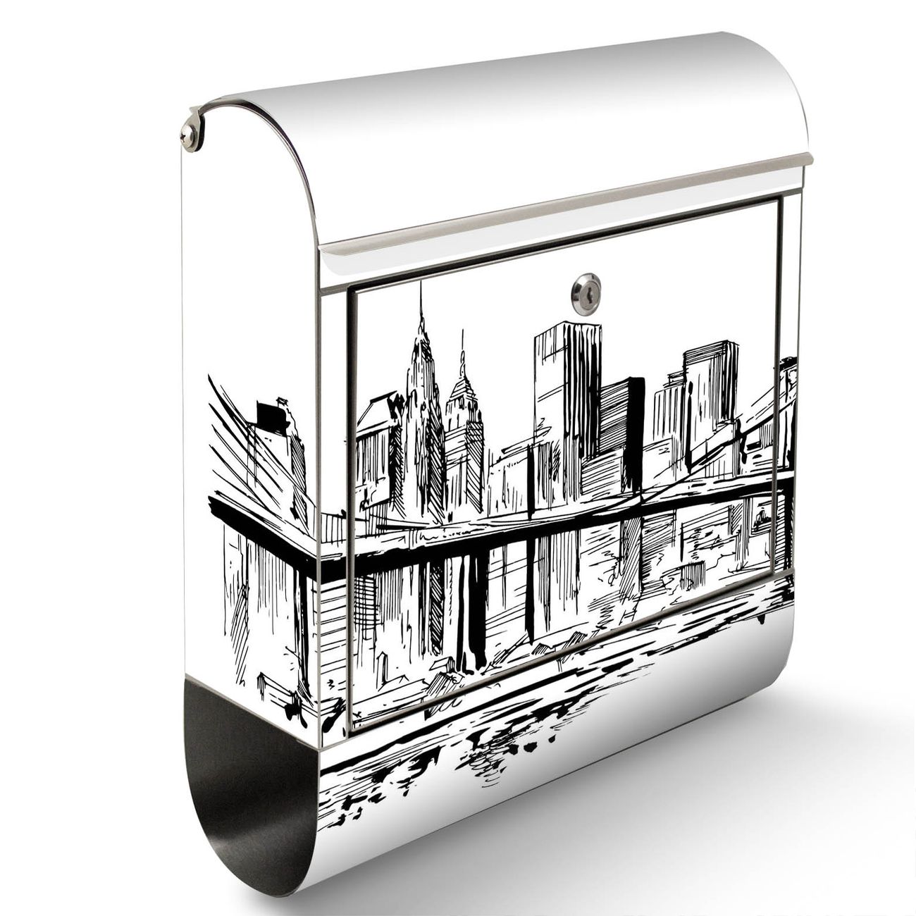 Der Motivstandbriefkasten hat ein sehr ansprechendes und ausgefallenes Design, damit entlocken Sie Ihren Nachbarn und dem Postboten ein Lächeln. Heben Sie Sich ab von der tristen grauen Masse, ohne auf Funktionalität zu verzichten. Der Briefkasten besteht aus hochwertigem 18/0 Edelstahl und die Wetter- und UV-resistenten Folie mit New York Skizze Motiv ist zusätzlich mit einem Schutzlaminat überzogen. Der Standbriefkasten wird mit Montagematerial und zwei Schlüsseln geliefert.