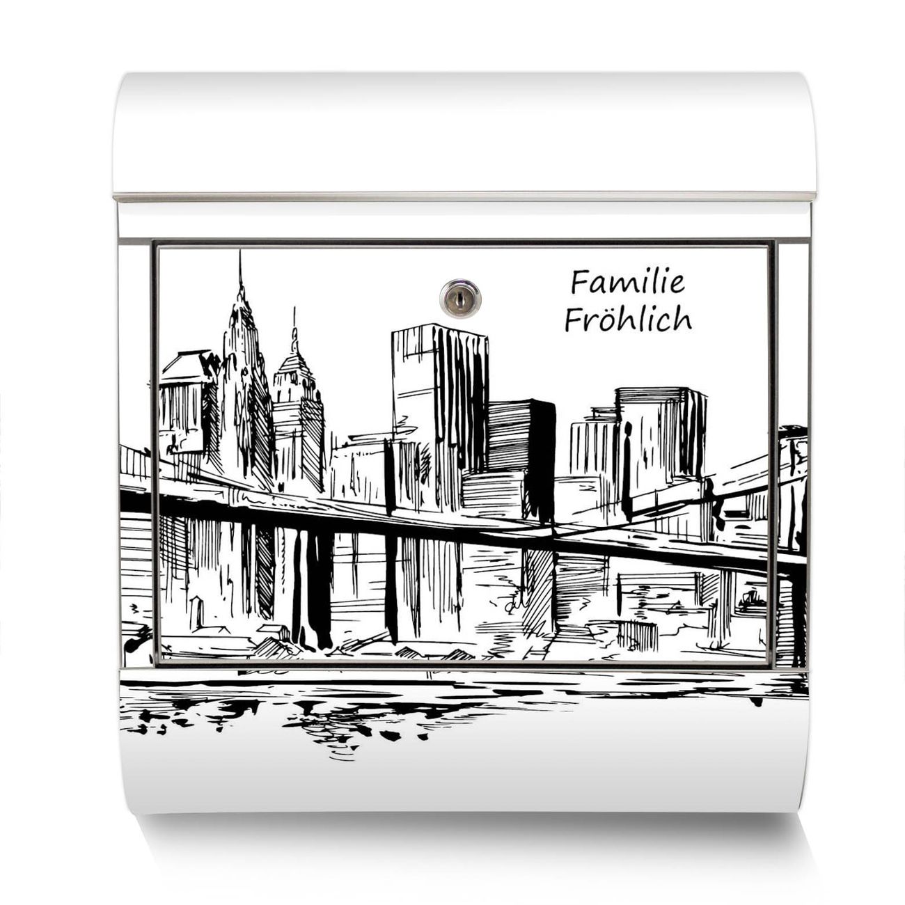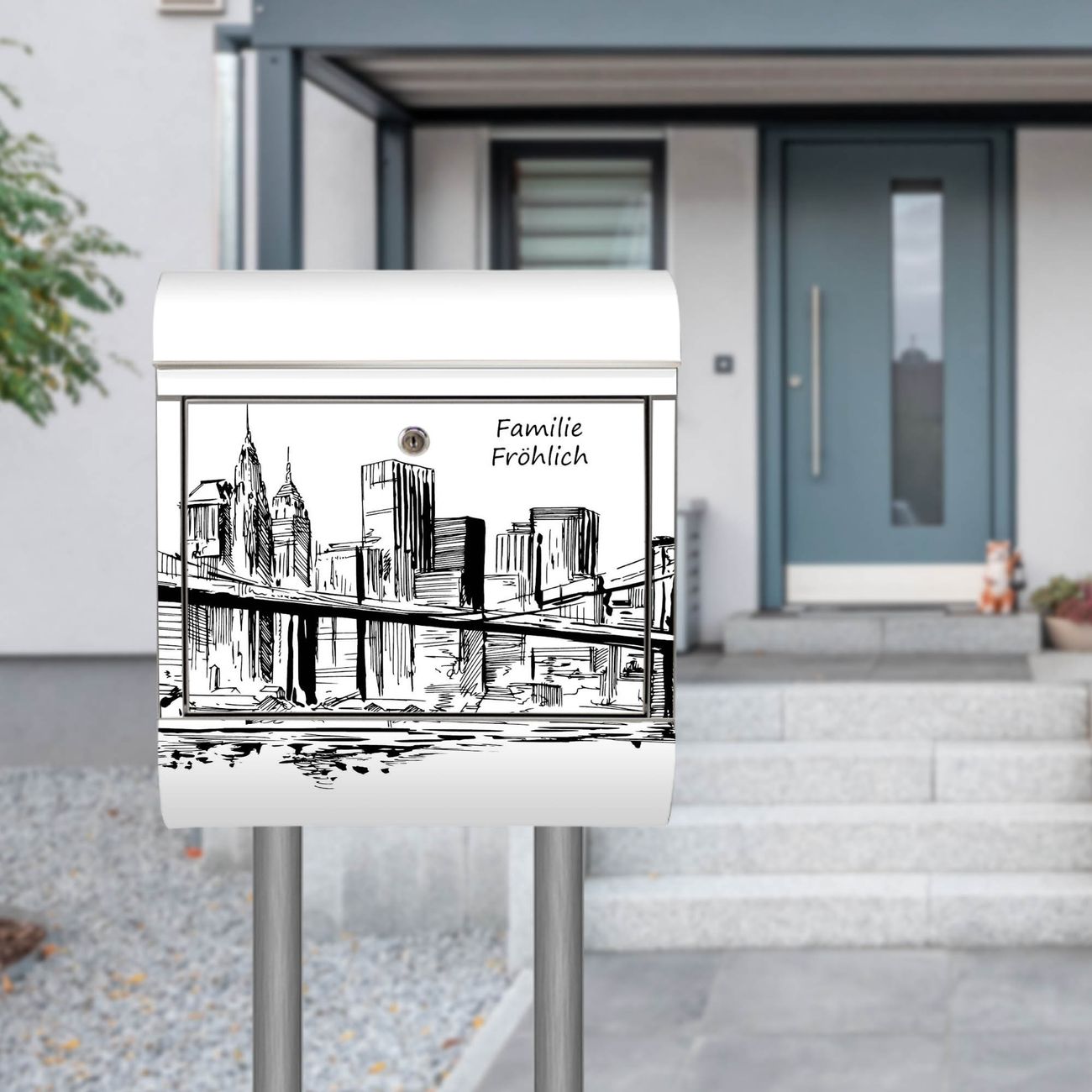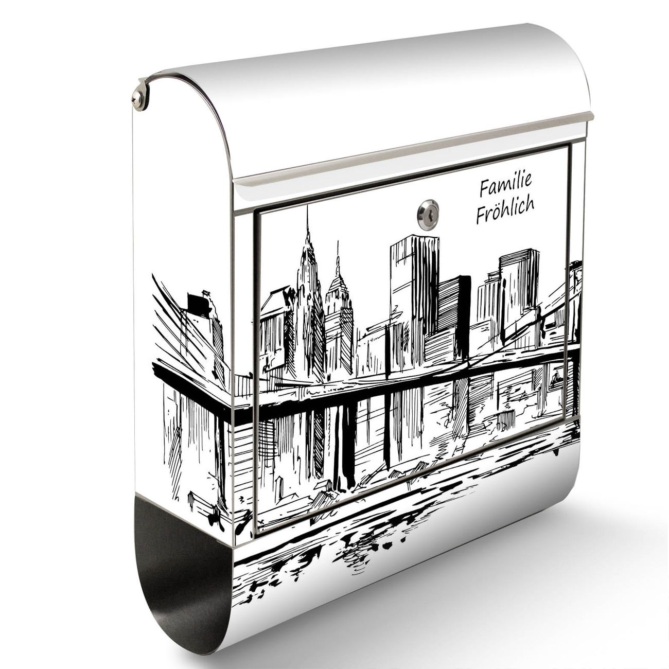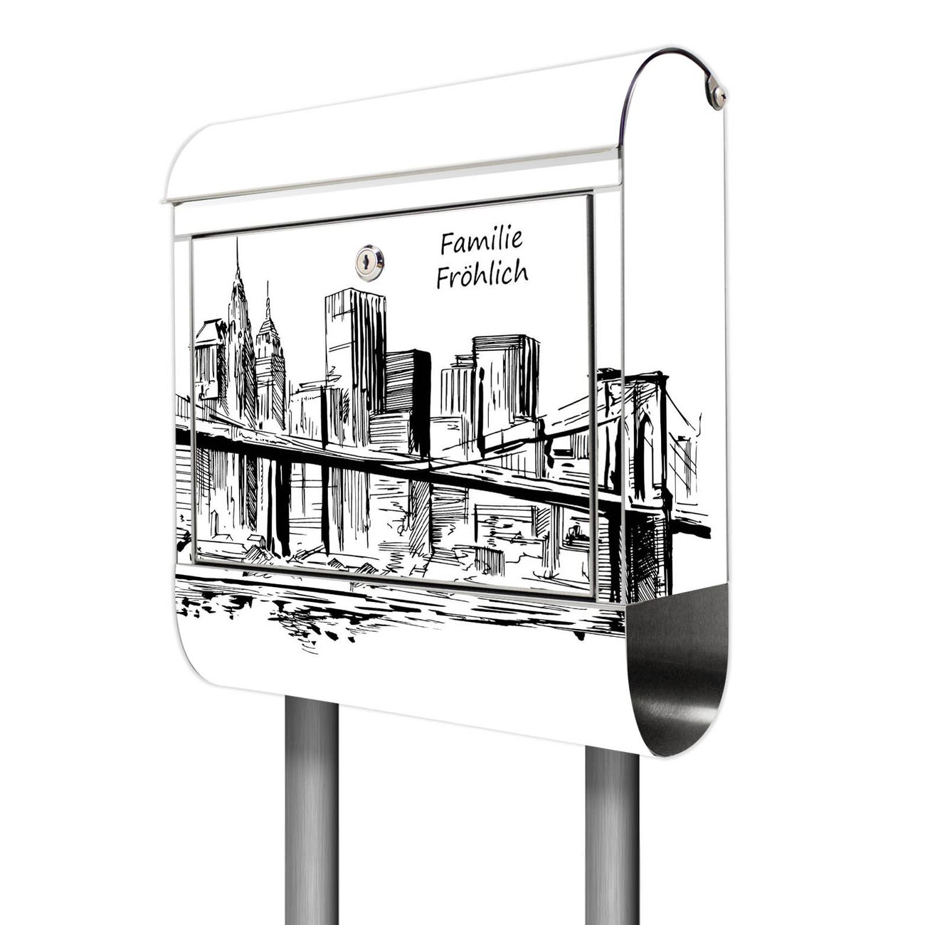 Der banjado Edelstahl Standbriefkasten mit Motiv New York Skizze und eigenem Wunschtext bietet Ihnen mit seinem Fassungsvermögen genügend Platz auch für große A4 Sendungen. Das integrierte Zeitungsfach eignet sich hervorragend, um unkompliziert die Tageszeitung zu fassen.