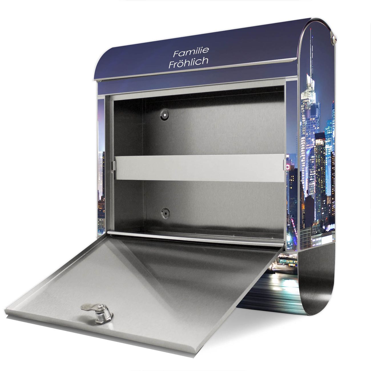 Der banjado Edelstahl Standbriefkasten mit Motiv New York und eigenem Wunschtext bietet Ihnen mit seinem Fassungsvermögen genügend Platz auch für große A4 Sendungen. Das integrierte Zeitungsfach eignet sich hervorragend, um unkompliziert die Tageszeitung zu fassen.