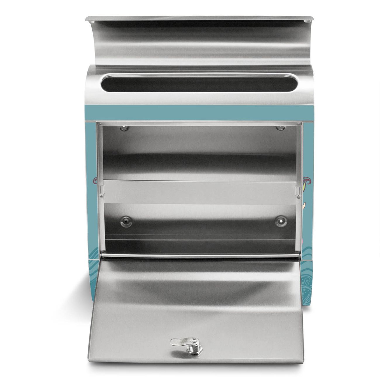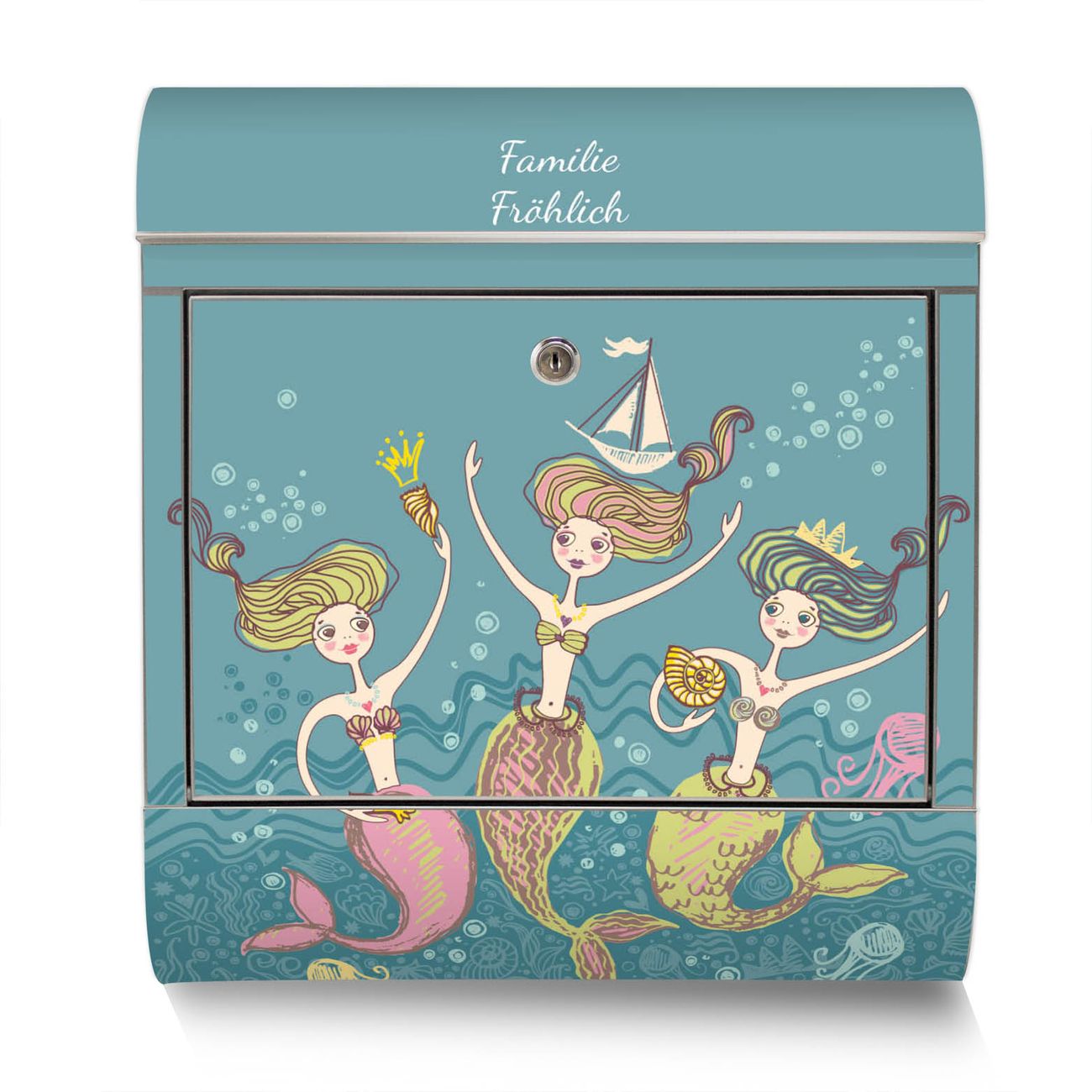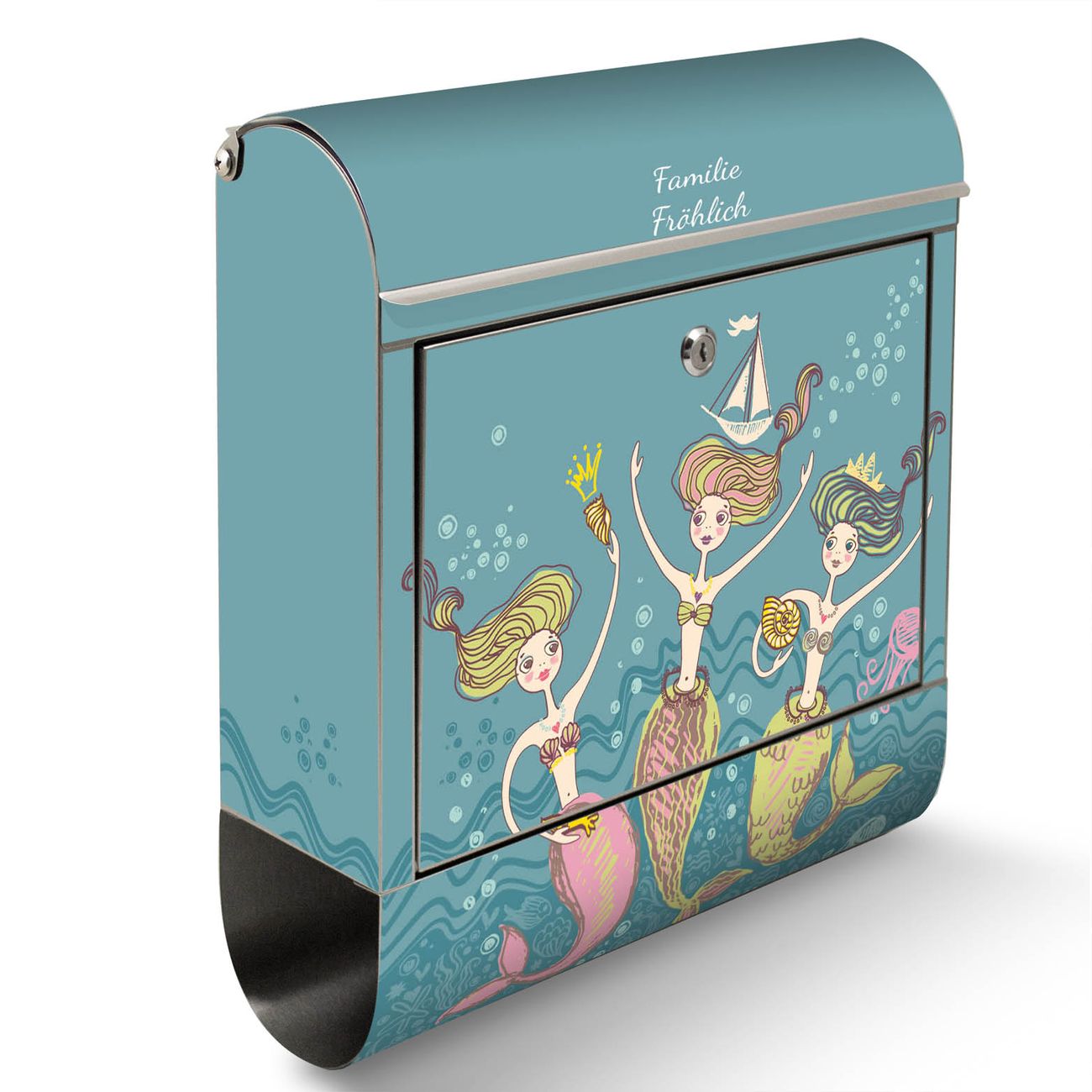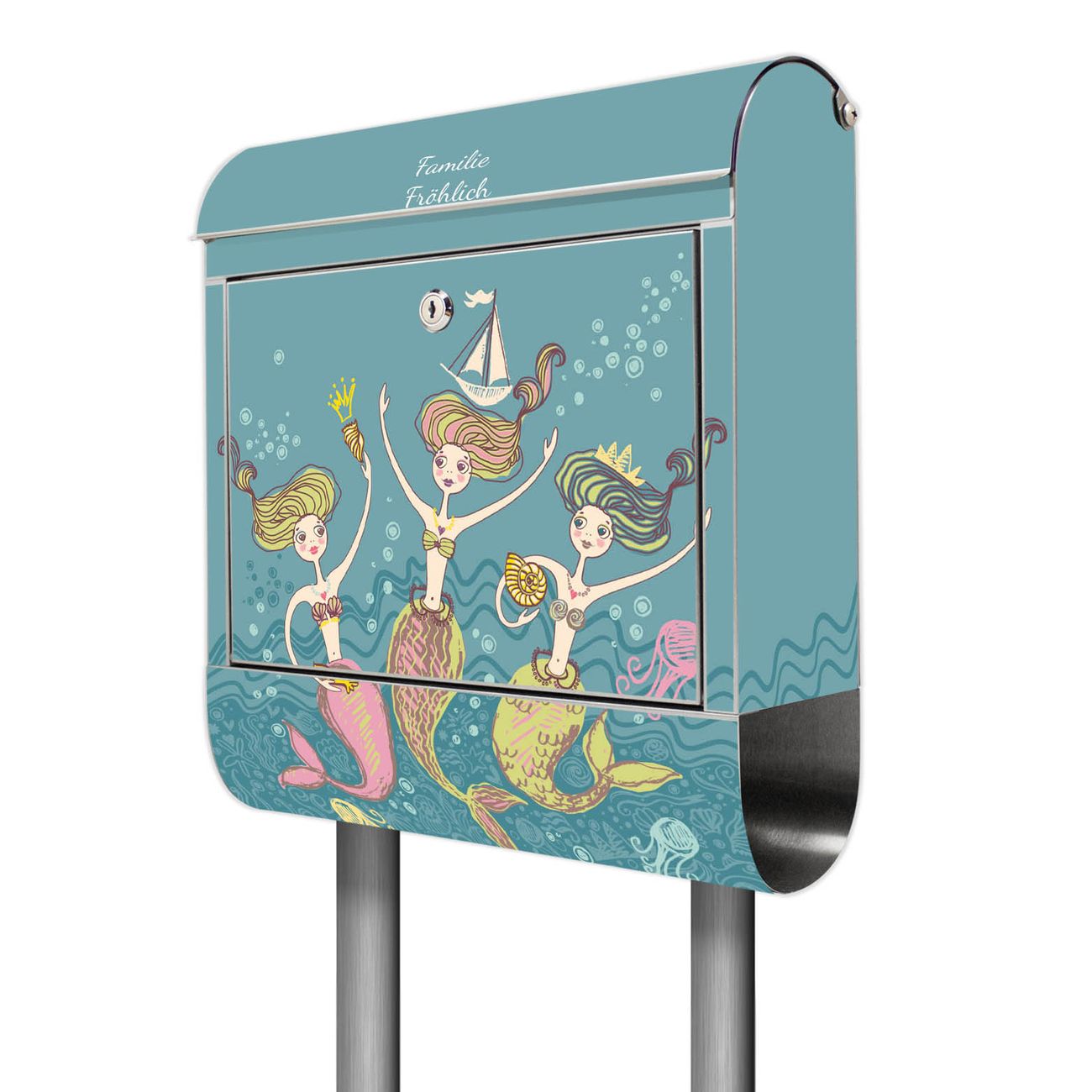 Der Motivstandbriefkasten hat ein sehr ansprechendes und ausgefallenes Design, damit entlocken Sie Ihren Nachbarn und dem Postboten ein Lächeln. Heben Sie Sich ab von der tristen grauen Masse, ohne auf Funktionalität zu verzichten. Der Briefkasten besteht aus hochwertigem 18/0 Edelstahl und die Wetter- und UV-resistenten Folie mit Nixen Motiv ist zusätzlich mit einem Schutzlaminat überzogen. Der Standbriefkasten wird mit Montagematerial und zwei Schlüsseln geliefert.