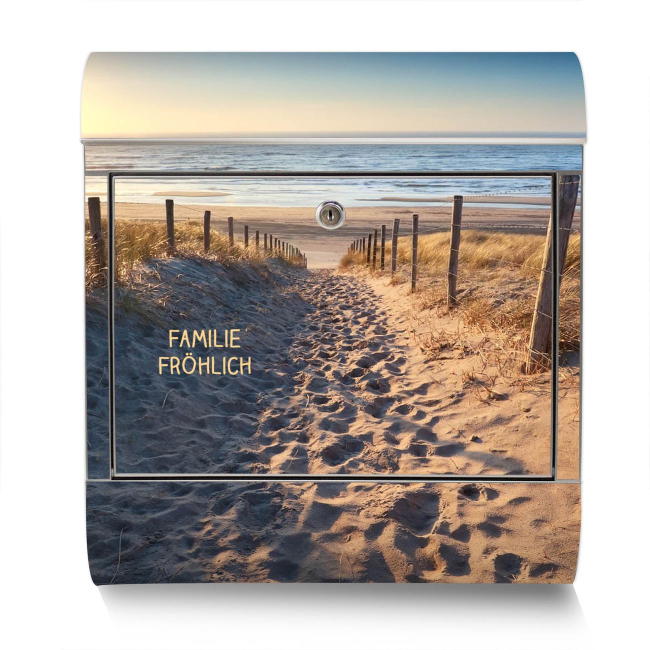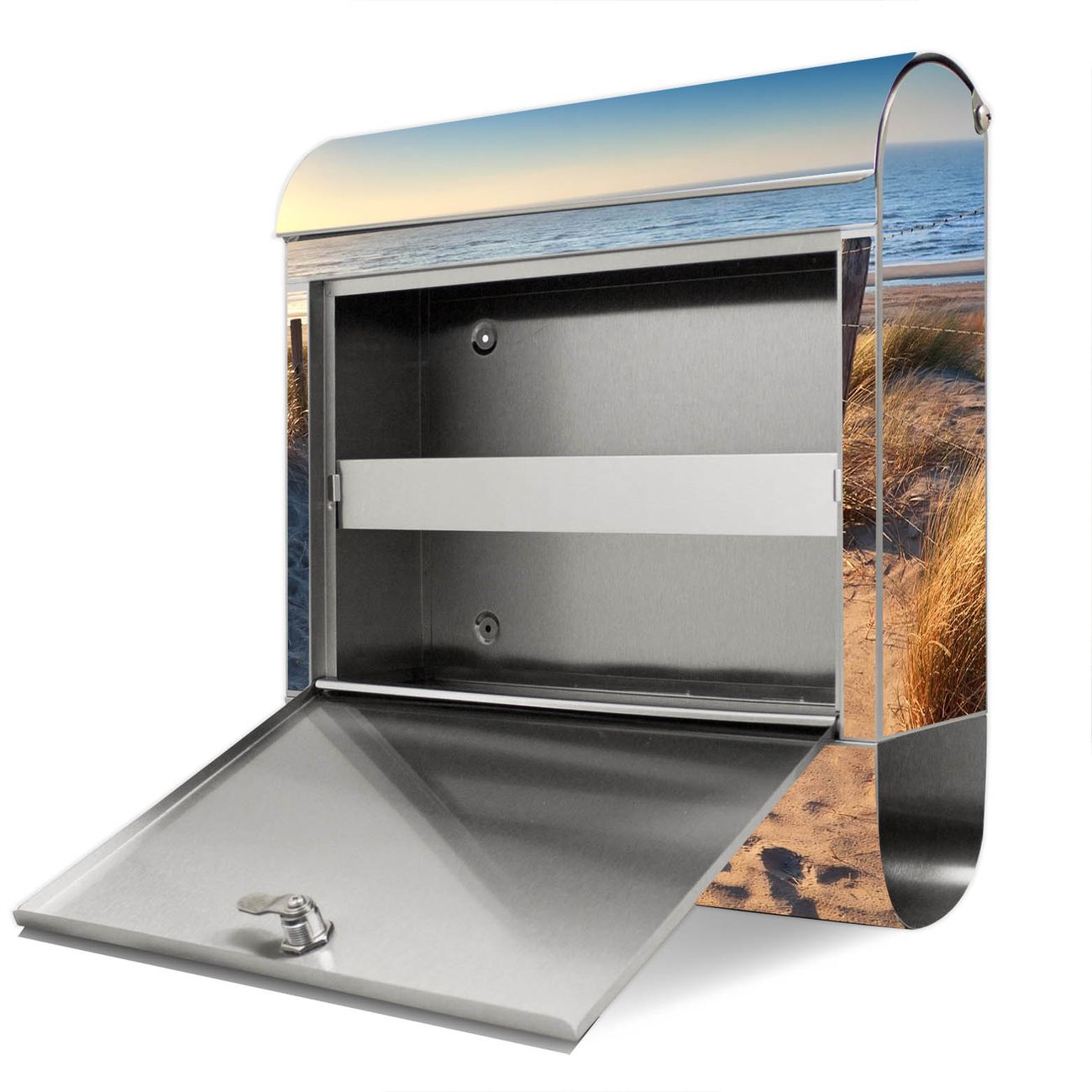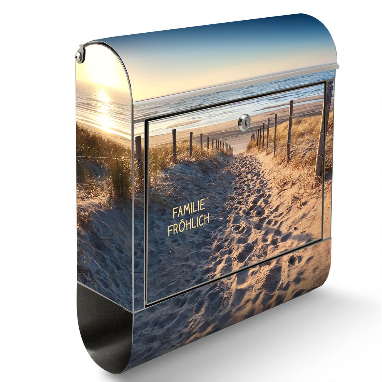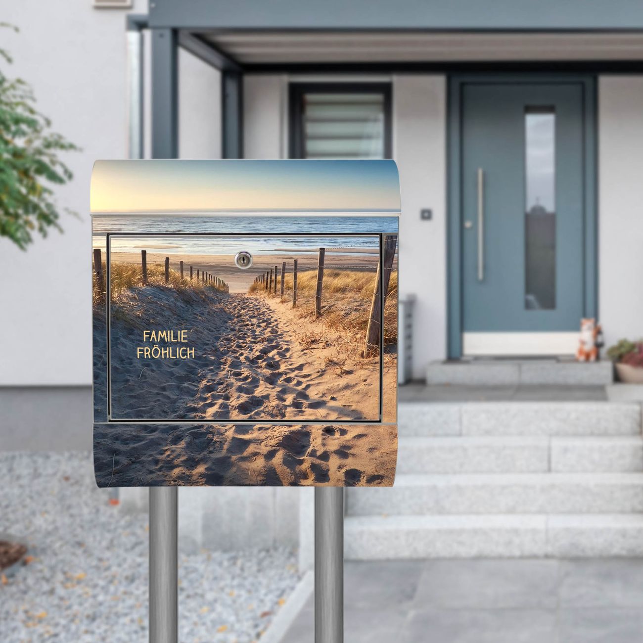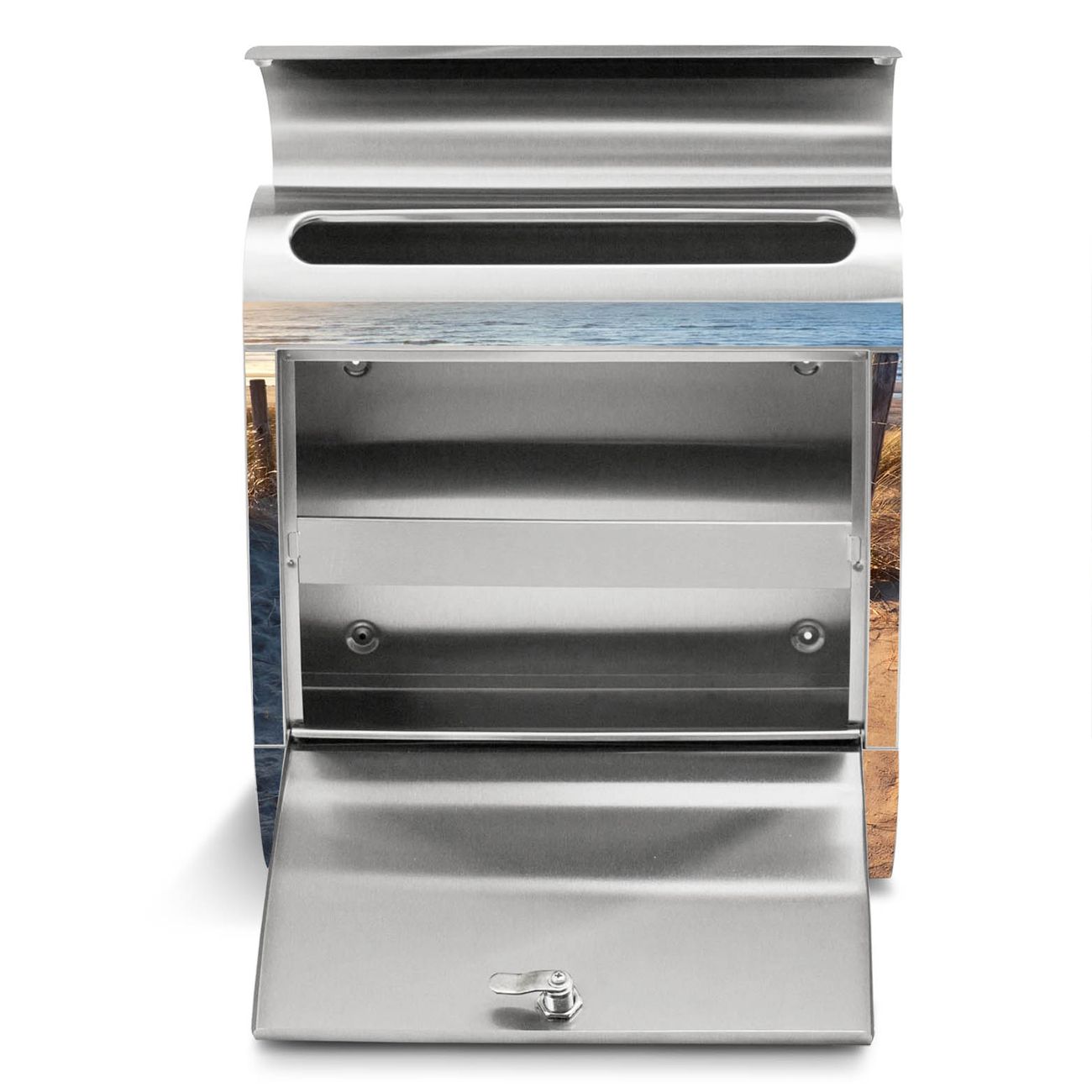 Der banjado Edelstahl Standbriefkasten mit Motiv Nordseestrand und eigenem Wunschtext bietet Ihnen mit seinem Fassungsvermögen genügend Platz auch für große A4 Sendungen. Das integrierte Zeitungsfach eignet sich hervorragend, um unkompliziert die Tageszeitung zu fassen.