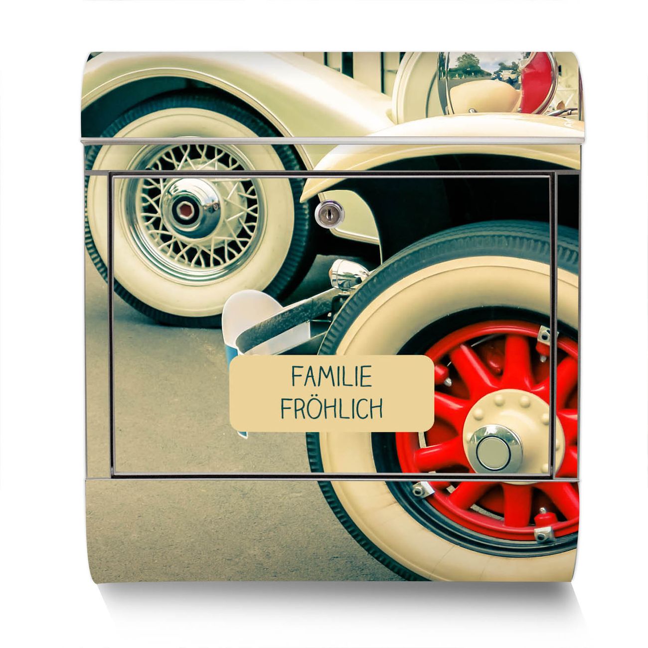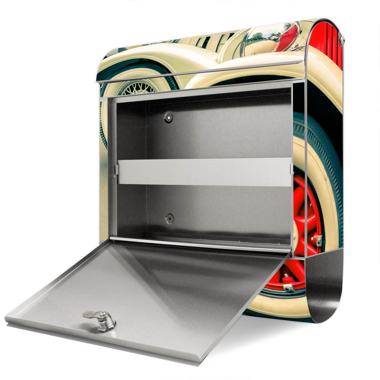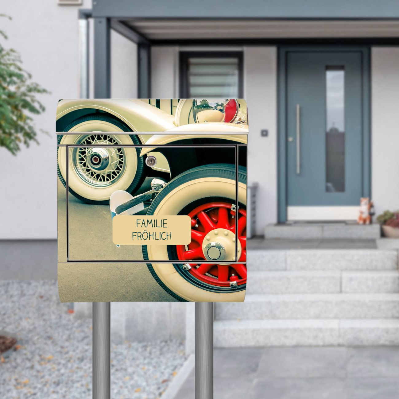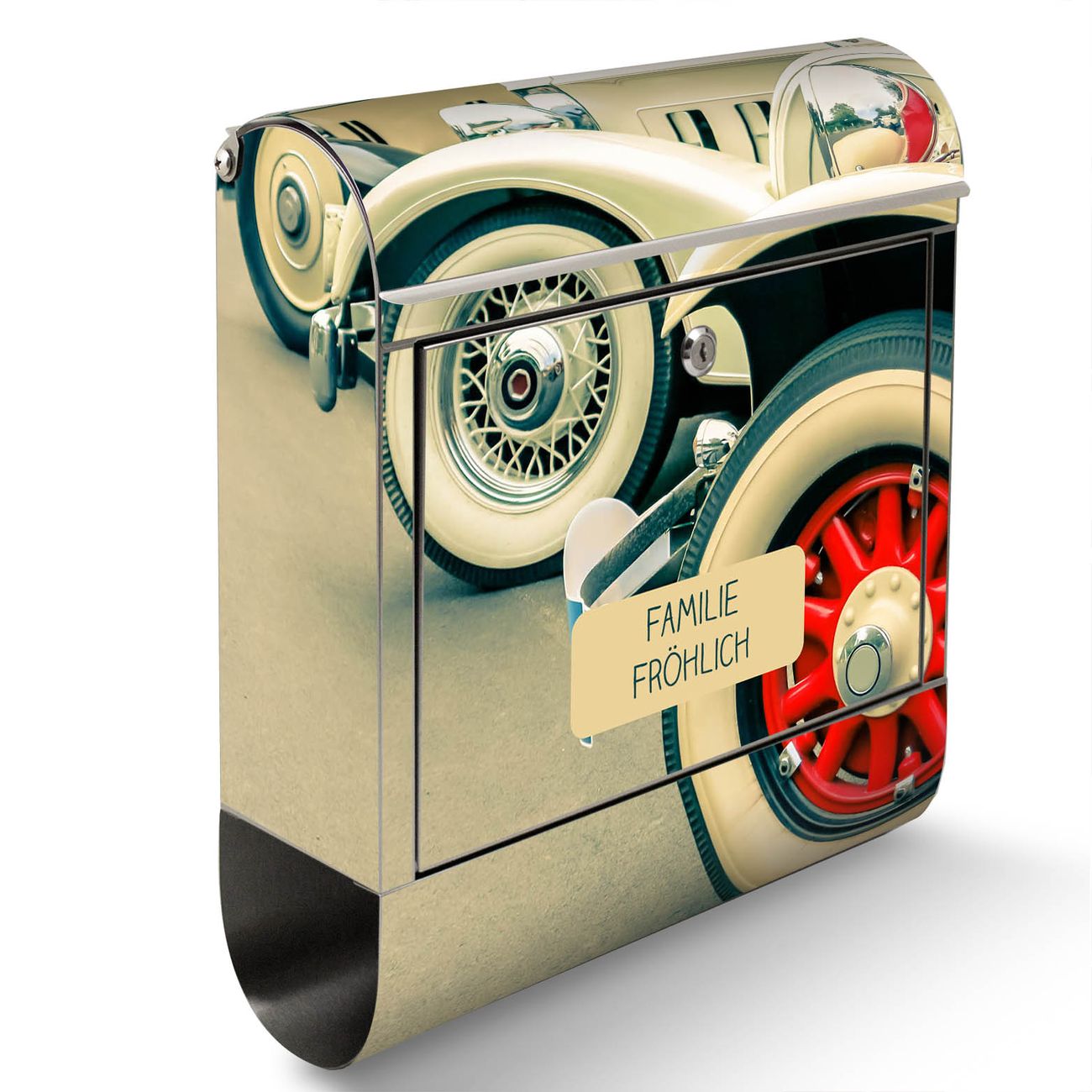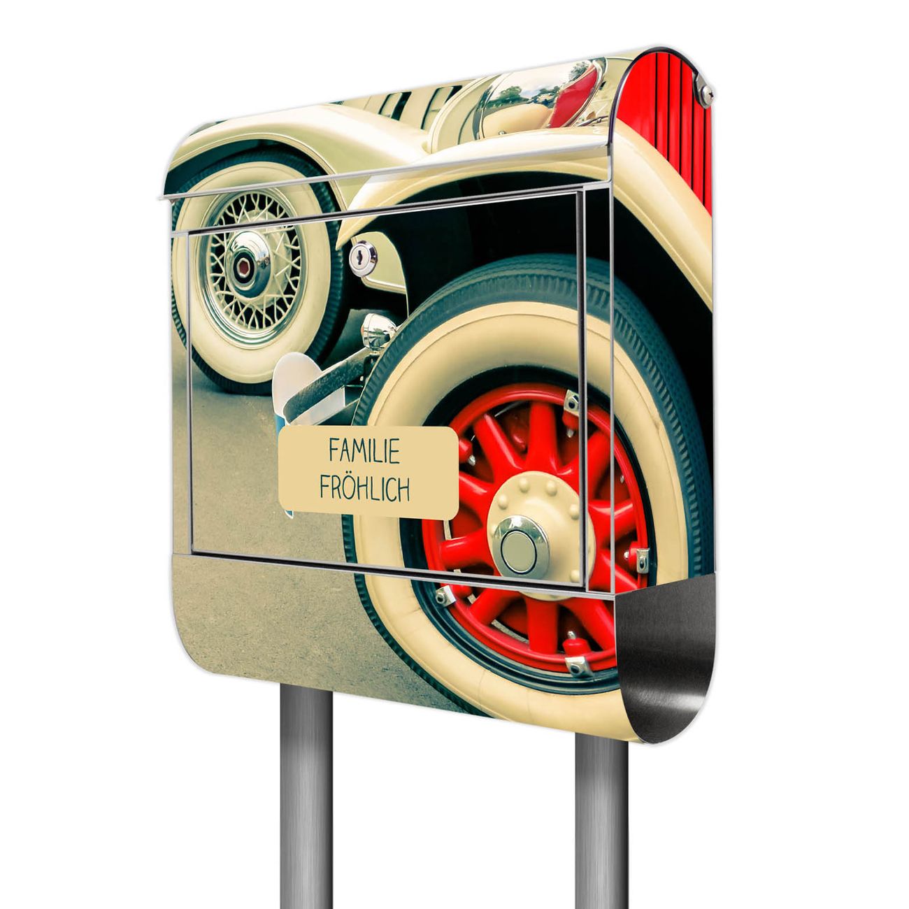 Der banjado Edelstahl Standbriefkasten mit Motiv Oldtimer Räder und eigenem Wunschtext bietet Ihnen mit seinem Fassungsvermögen genügend Platz auch für große A4 Sendungen. Das integrierte Zeitungsfach eignet sich hervorragend, um unkompliziert die Tageszeitung zu fassen.