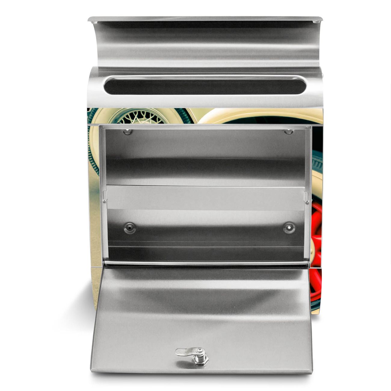 Der Motivstandbriefkasten hat ein sehr ansprechendes und ausgefallenes Design, damit entlocken Sie Ihren Nachbarn und dem Postboten ein Lächeln. Heben Sie Sich ab von der tristen grauen Masse, ohne auf Funktionalität zu verzichten. Der Briefkasten besteht aus hochwertigem 18/0 Edelstahl und die Wetter- und UV-resistenten Folie mit Oldtimer Räder Motiv ist zusätzlich mit einem Schutzlaminat überzogen. Der Standbriefkasten wird mit Montagematerial und zwei Schlüsseln geliefert.