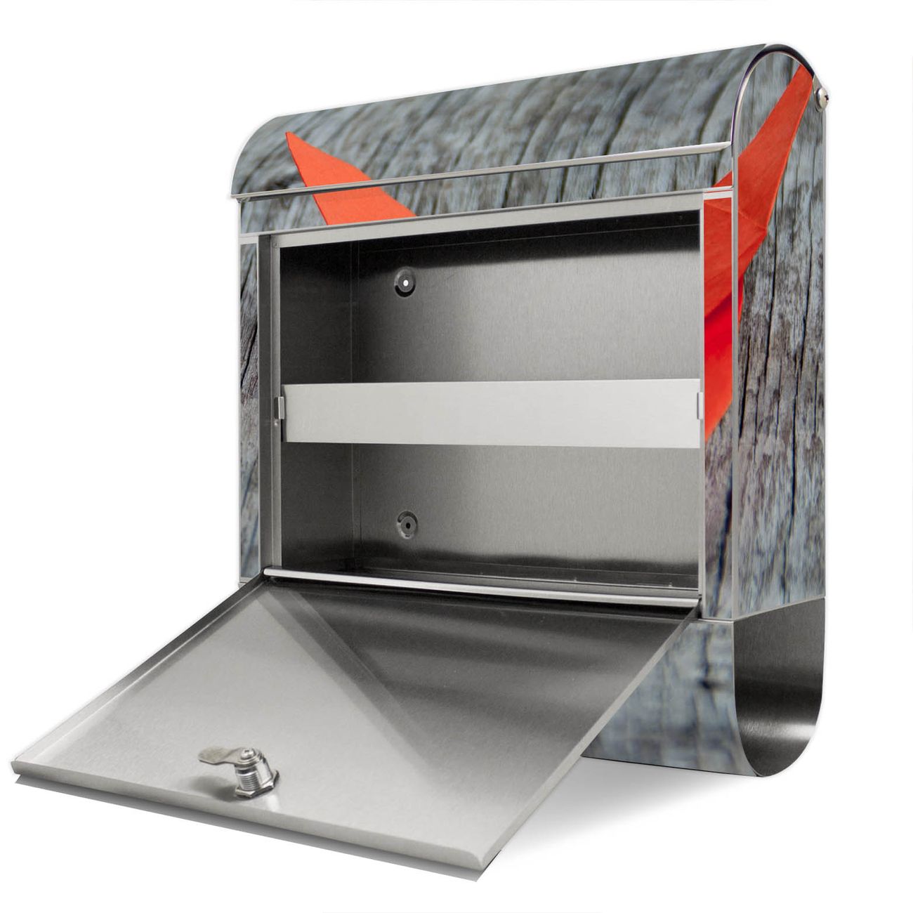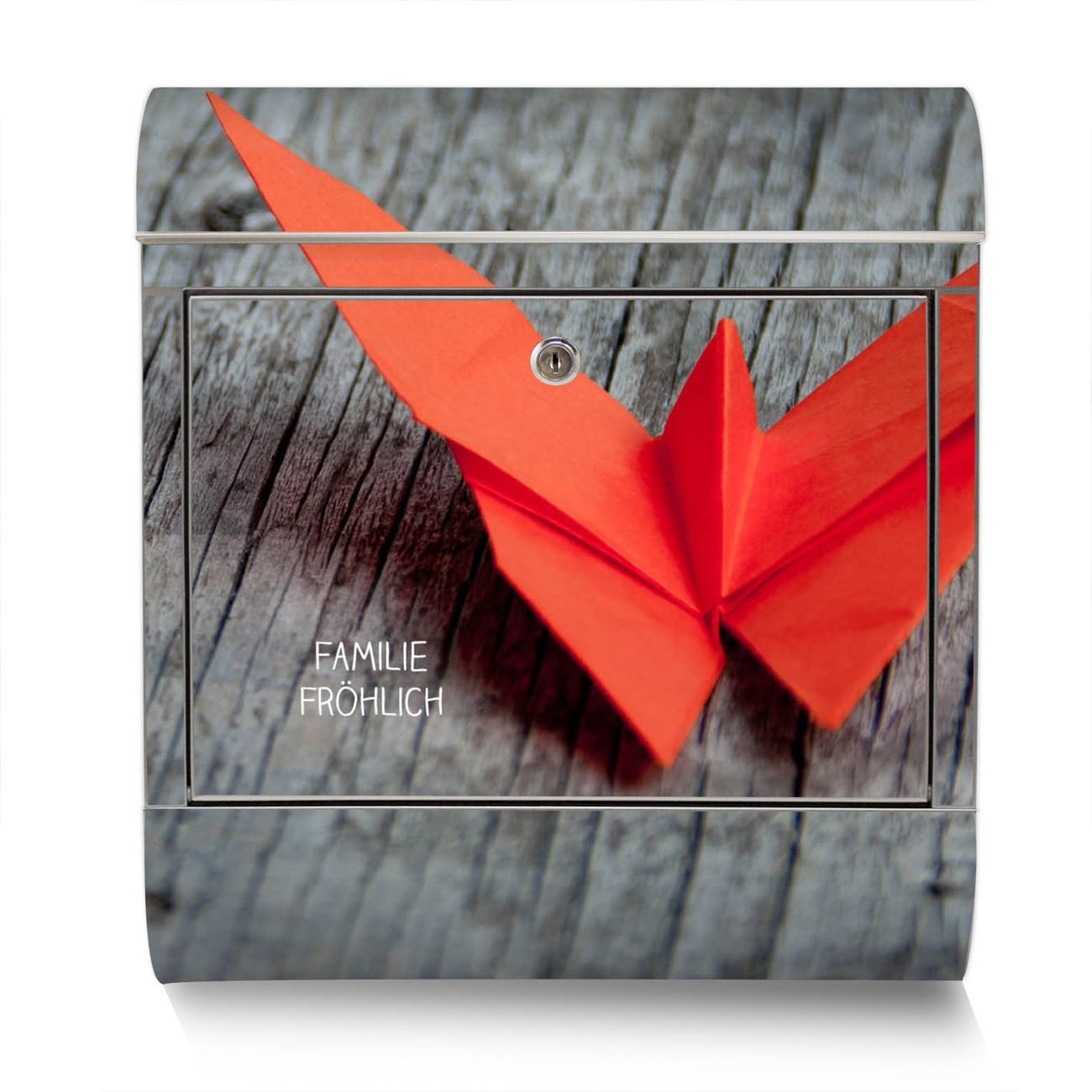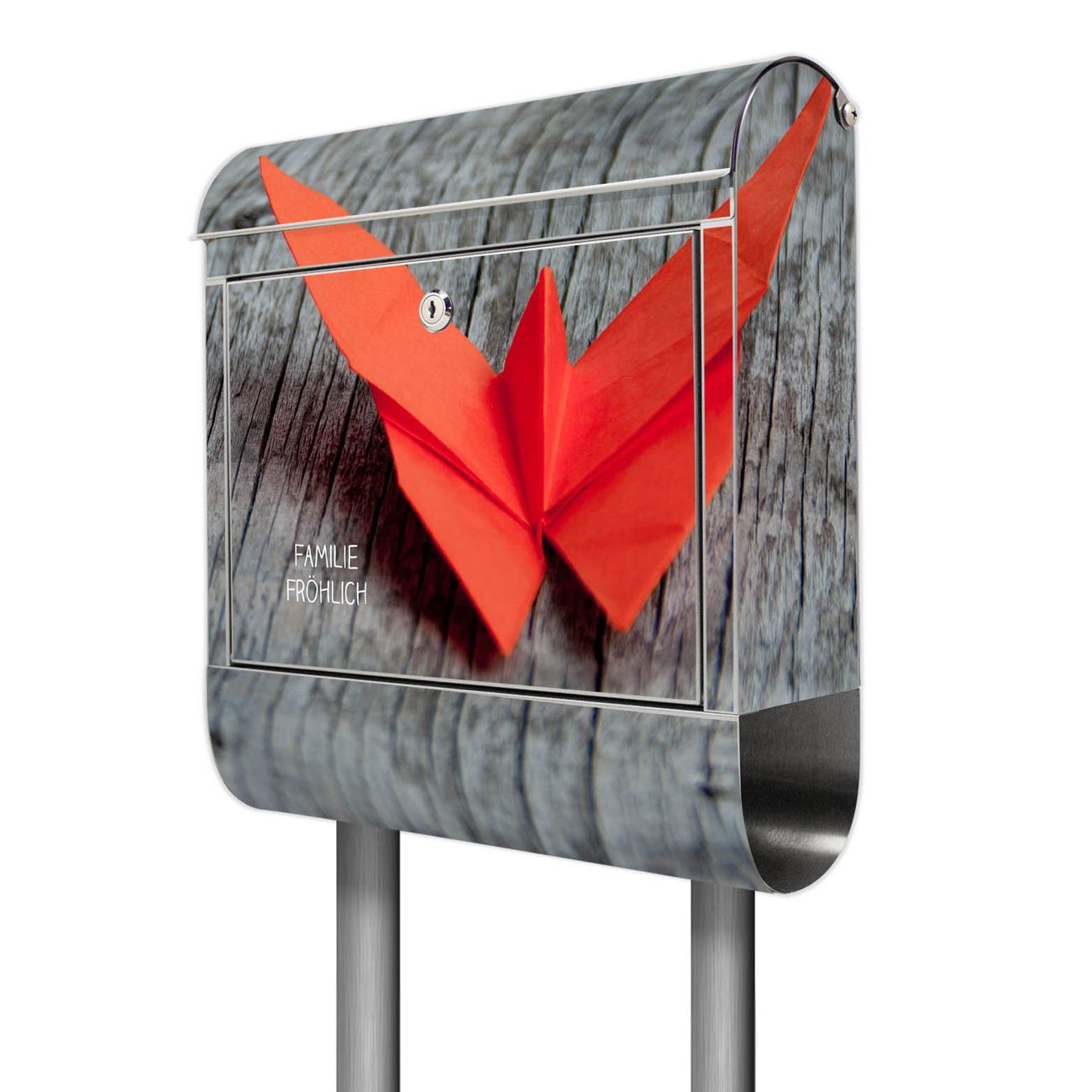 Der banjado Edelstahl Standbriefkasten mit Motiv Origami Schmetterling und eigenem Wunschtext bietet Ihnen mit seinem Fassungsvermögen genügend Platz auch für große A4 Sendungen. Das integrierte Zeitungsfach eignet sich hervorragend, um unkompliziert die Tageszeitung zu fassen.
