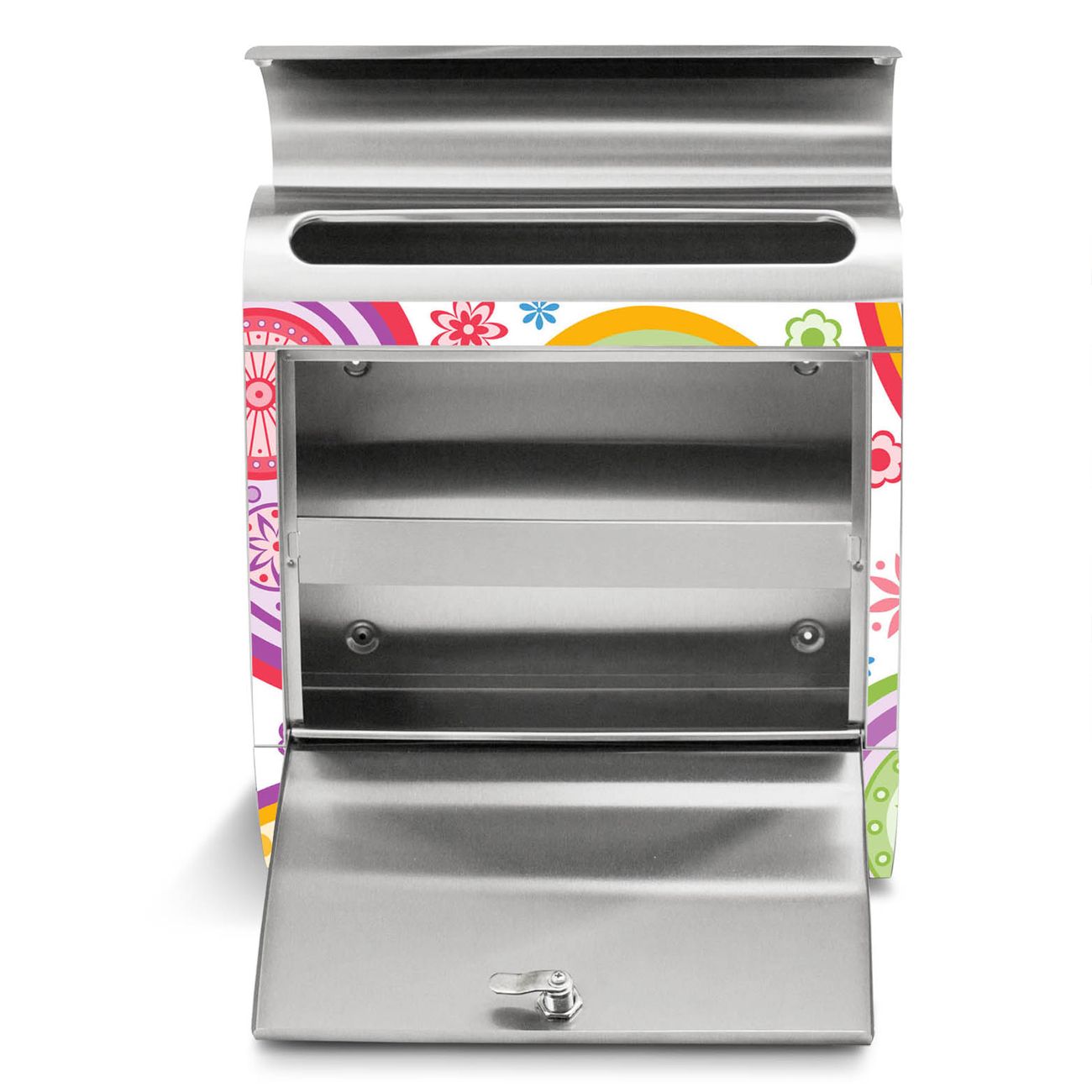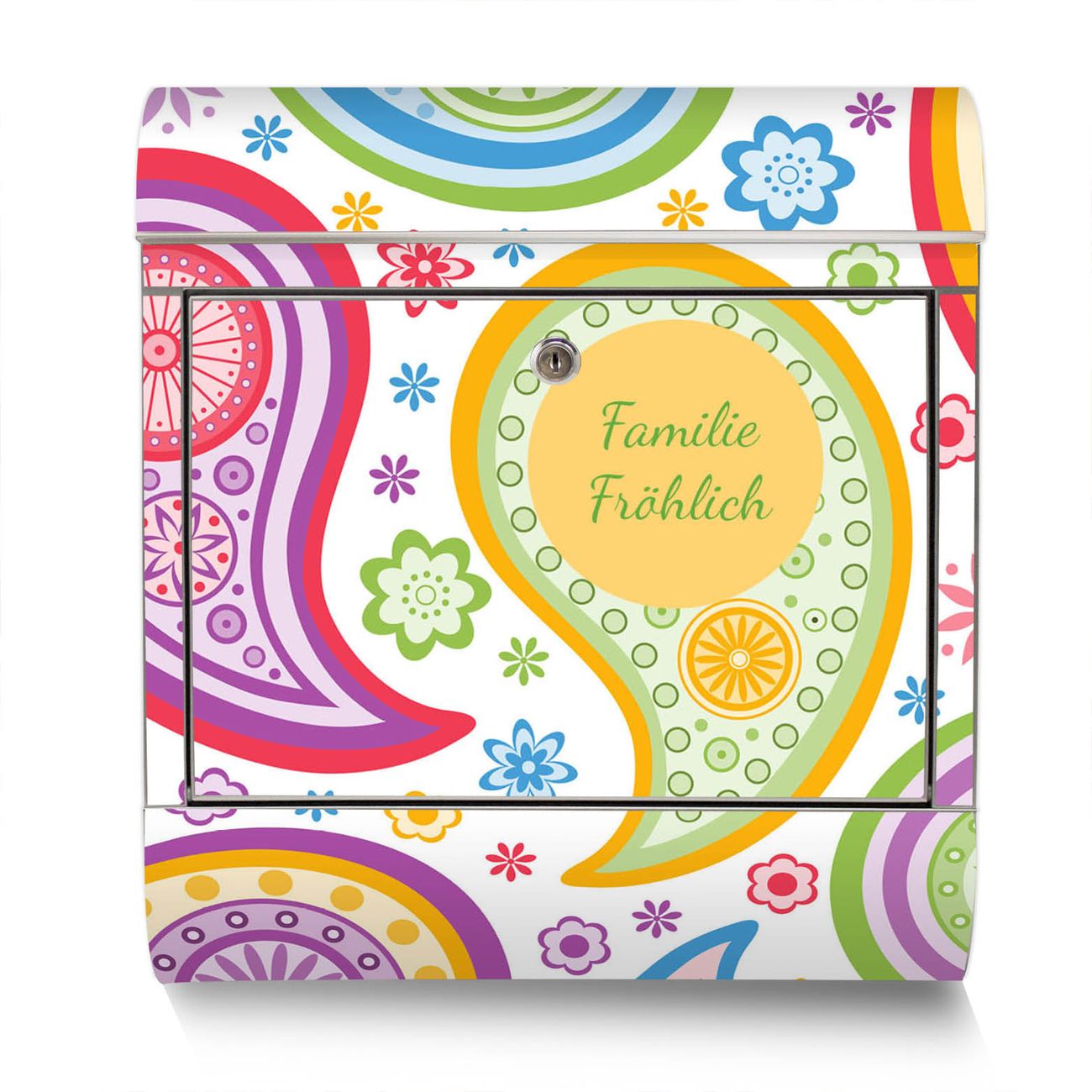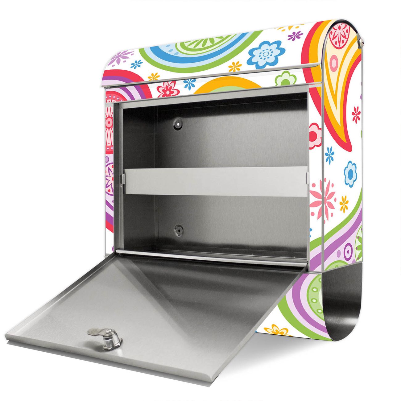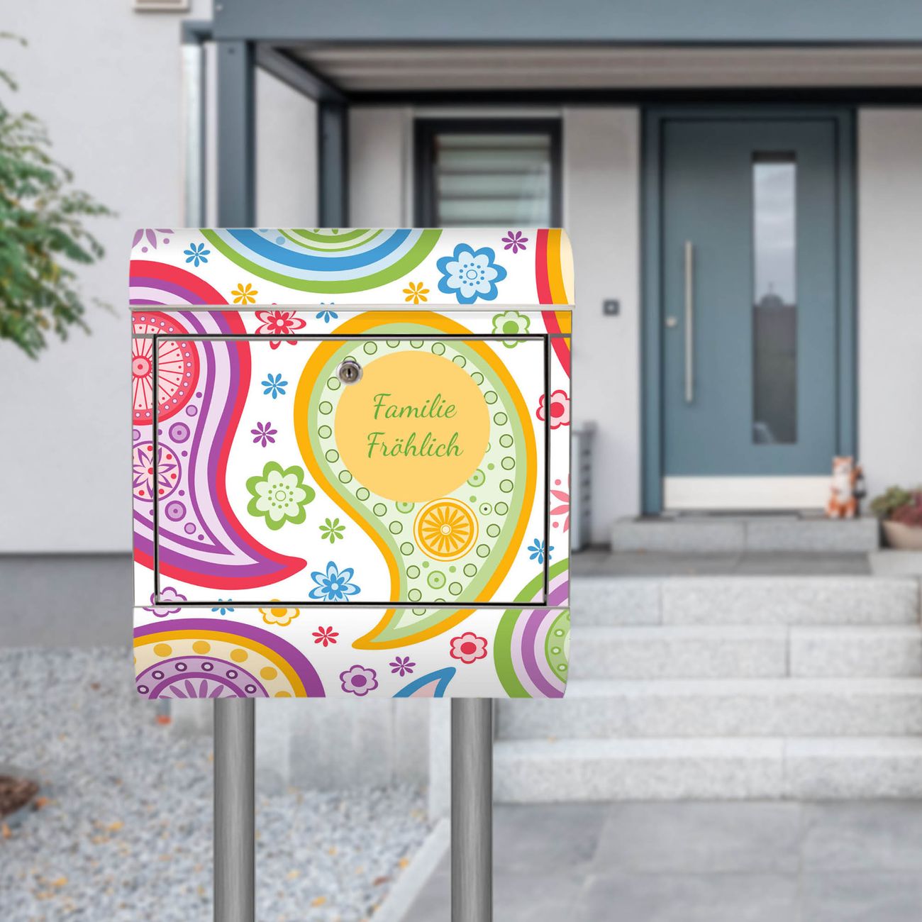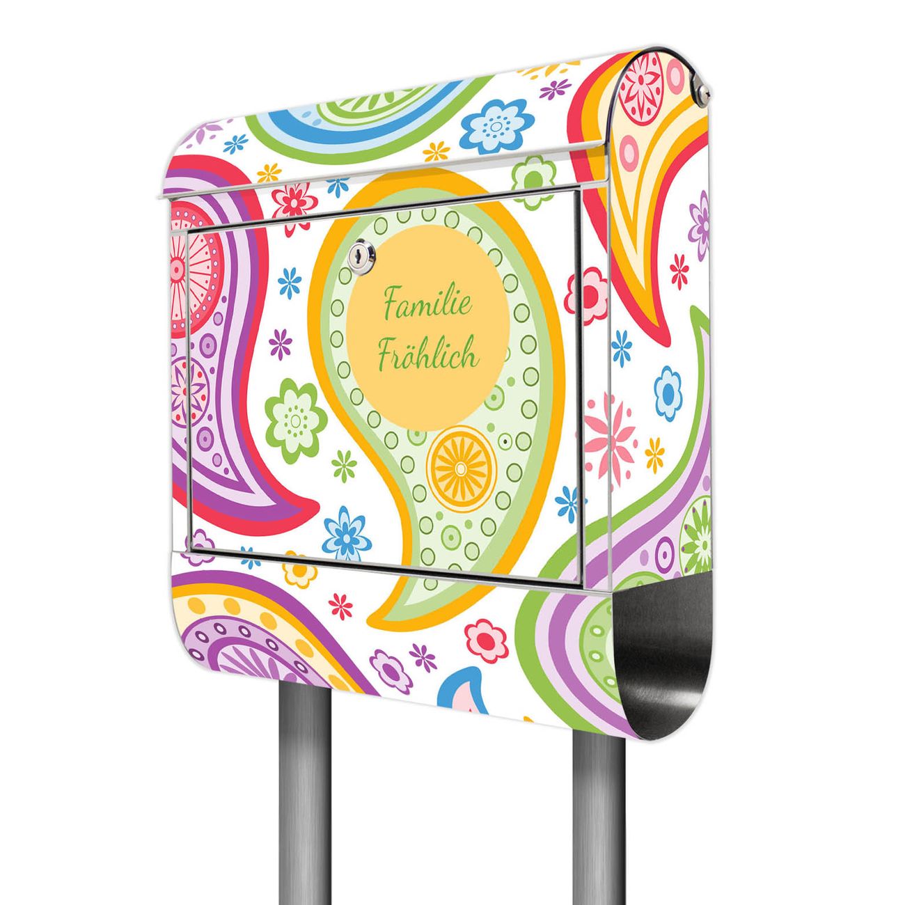 Der Motivstandbriefkasten hat ein sehr ansprechendes und ausgefallenes Design, damit entlocken Sie Ihren Nachbarn und dem Postboten ein Lächeln. Heben Sie Sich ab von der tristen grauen Masse, ohne auf Funktionalität zu verzichten. Der Briefkasten besteht aus hochwertigem 18/0 Edelstahl und die Wetter- und UV-resistenten Folie mit Paisley bunt Motiv ist zusätzlich mit einem Schutzlaminat überzogen. Der Standbriefkasten wird mit Montagematerial und zwei Schlüsseln geliefert.